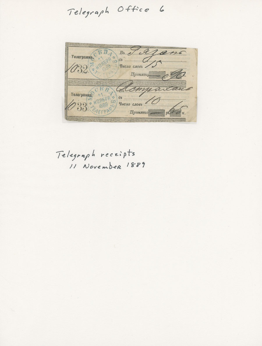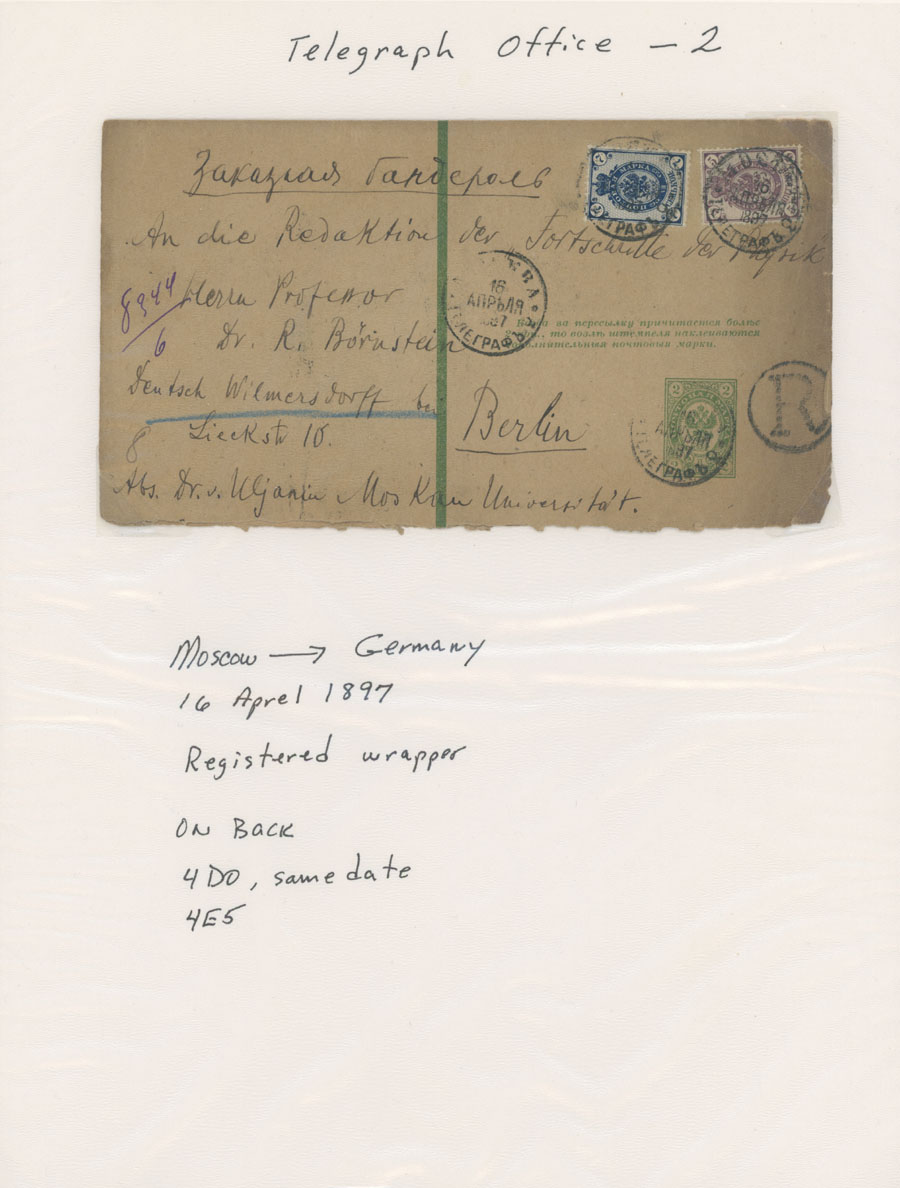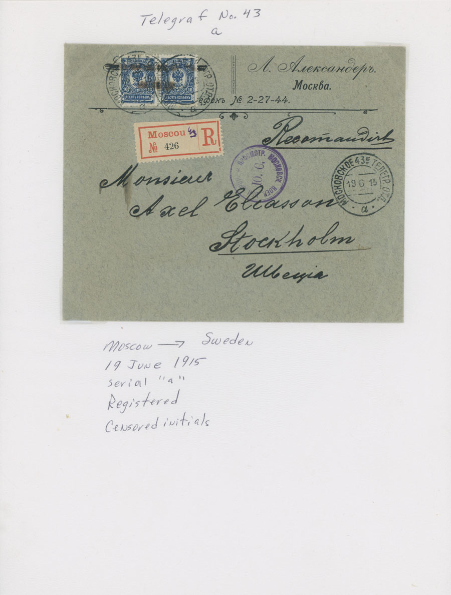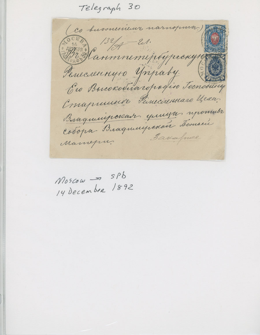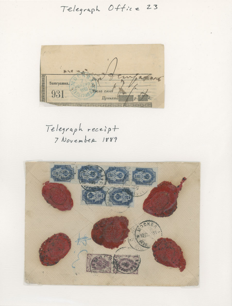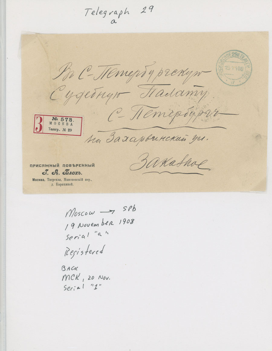 COLLECTION OF MOSCOW CITY TELEGRAPH OFFICES: 1886-1917, 54 postal history items representing 24 different telegraph offices from No.2 to No.64, including 9 stationery envelopes, letter cards and wrappers, 8 receipts and 10 telegrams, minor conveyance flaws possible, still nice looking unit, F/VF and rarely offered material, Est. $1,000-$1,200