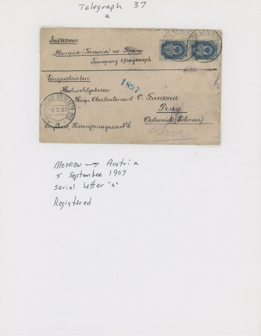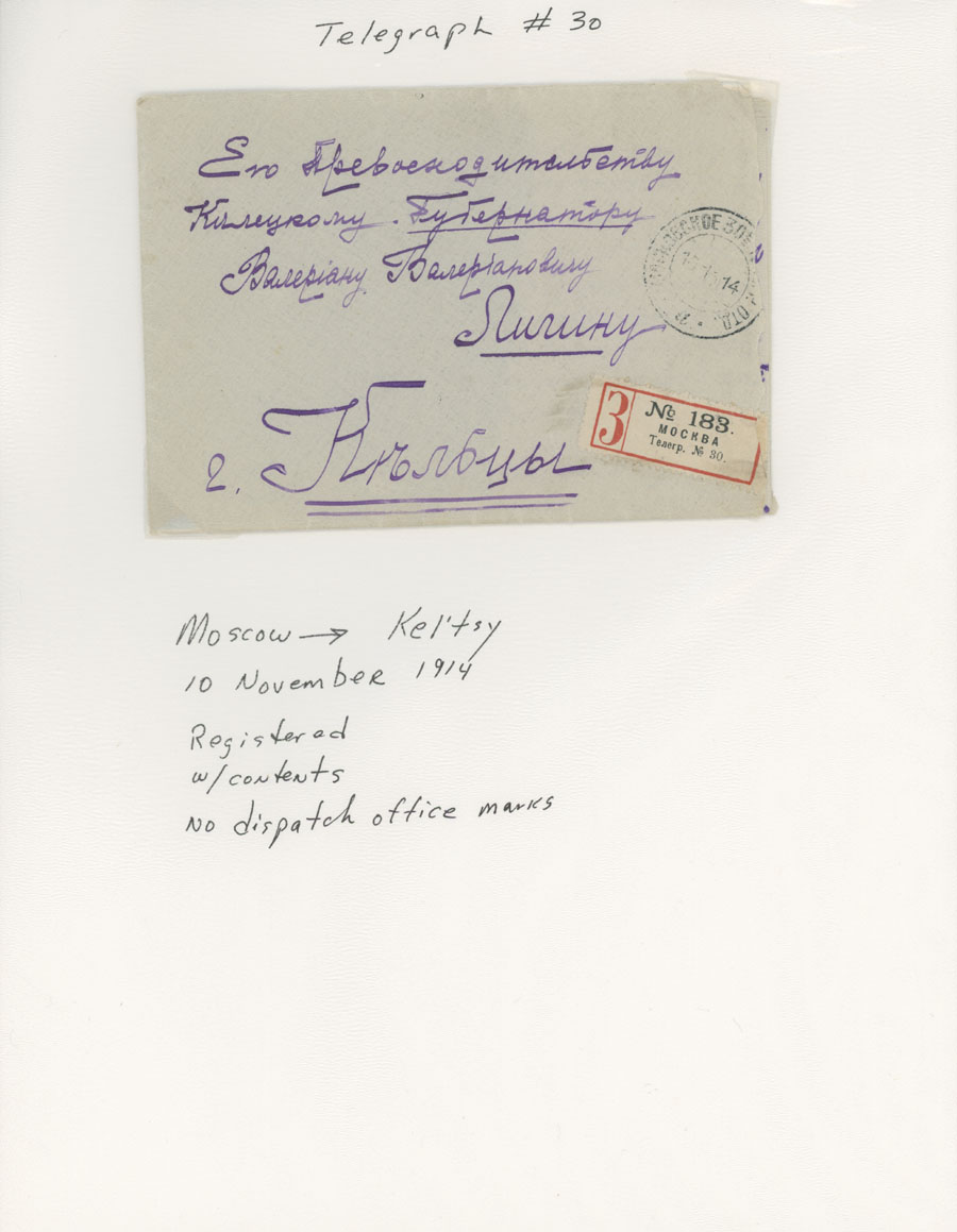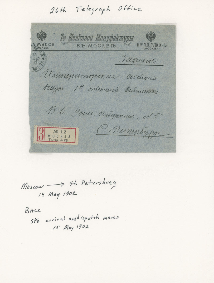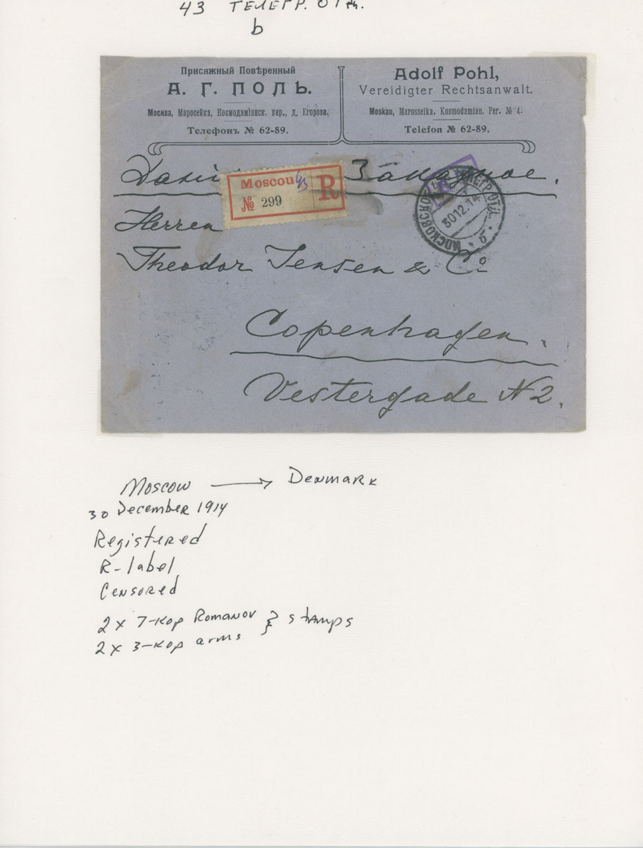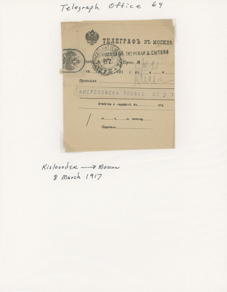 COLLECTION OF MOSCOW CITY TELEGRAPH OFFICES: 1886-1917, 54 postal history items representing 24 different telegraph offices from No.2 to No.64, including 9 stationery envelopes, letter cards and wrappers, 8 receipts and 10 telegrams, minor conveyance flaws possible, still nice looking unit, F/VF and rarely offered material, Est. $1,000-$1,200