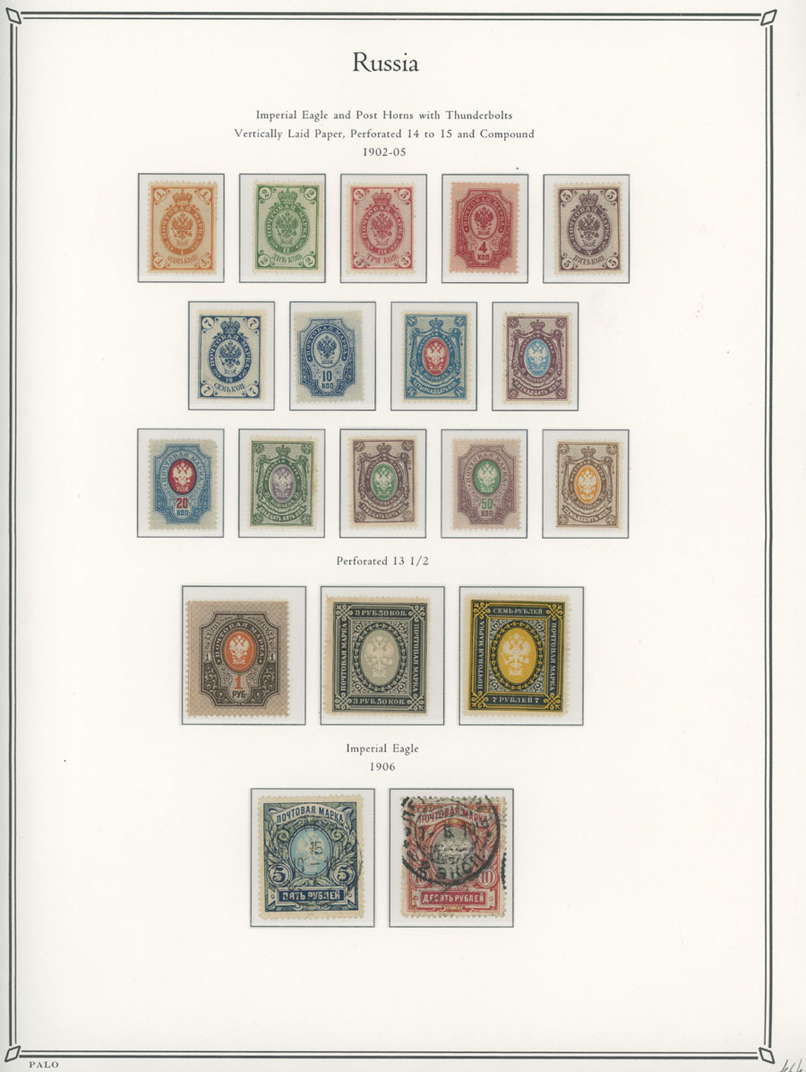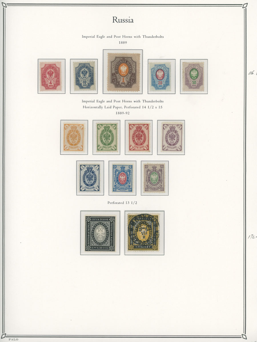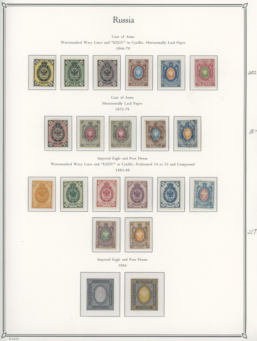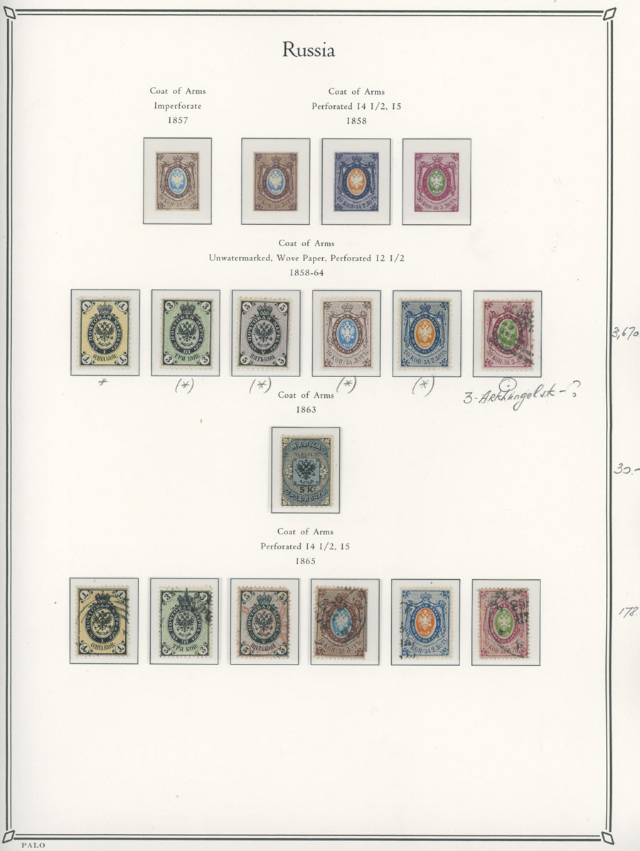 COLLECTION ON ILLUSTRATED PAGES: 1858-1917, 139 mostly mint stamps, starting with the 3rd issue with perforation 12½ (1k-20k unused, 30k – used), following by used set with perforation 14½x15 (No.12-18), continues with mint set of No.19-25 and 31-38, then sets on horizontally (No. 41-45, 46-54) and vertically (No.55-70) laid paper, plus mint Romanov Dynasty and later issues, fresh quality unit, full/part of OG, unused or used, F/VF, C.v. $5,700, Est. $1,500-$2,000, Scott #5/141
