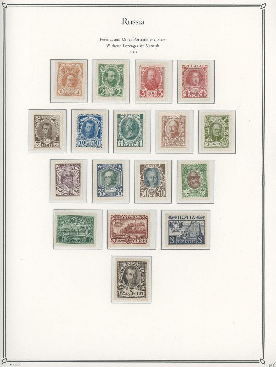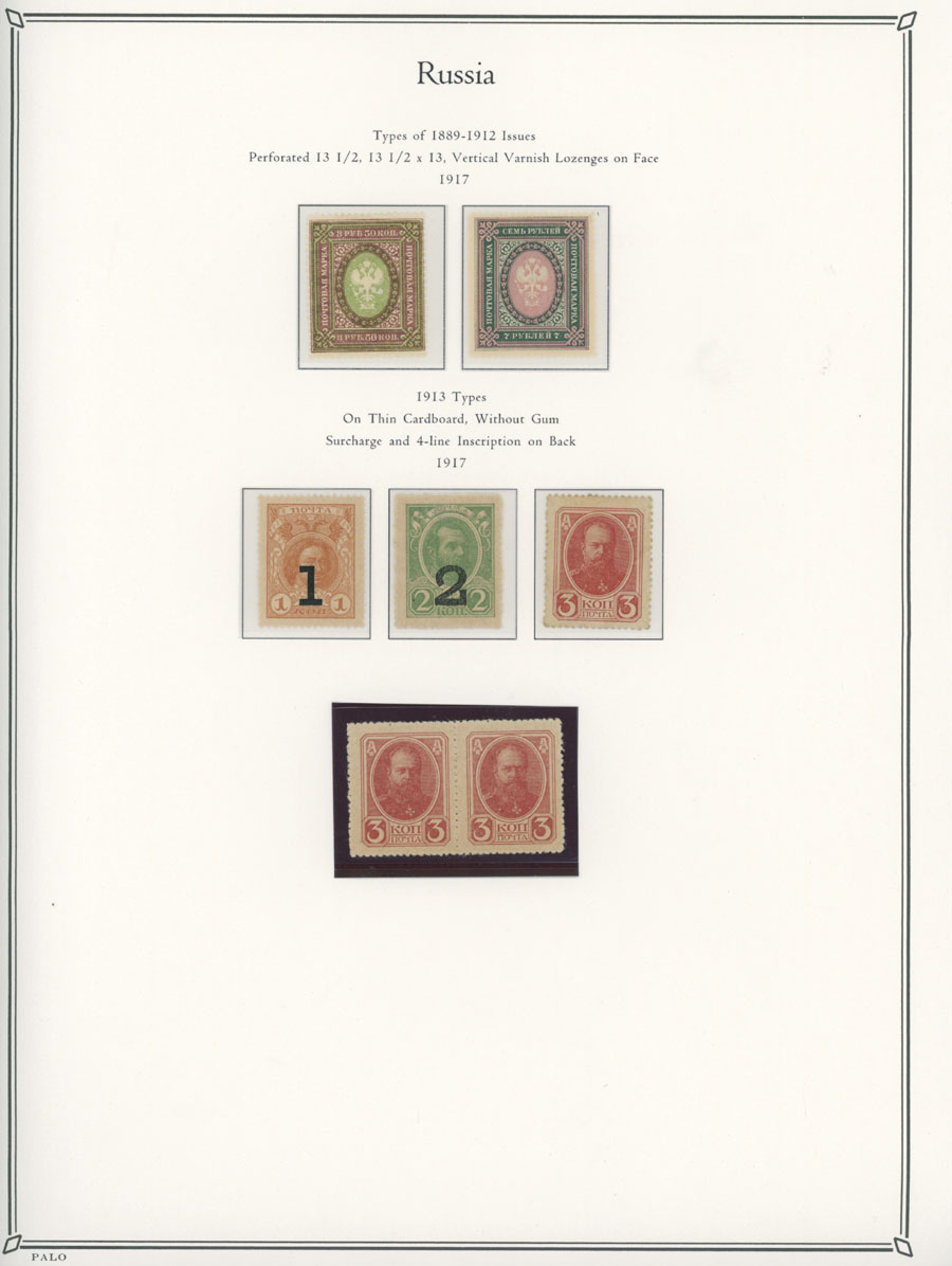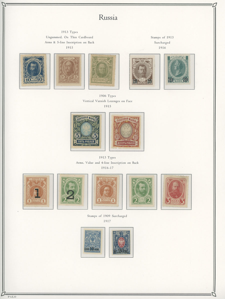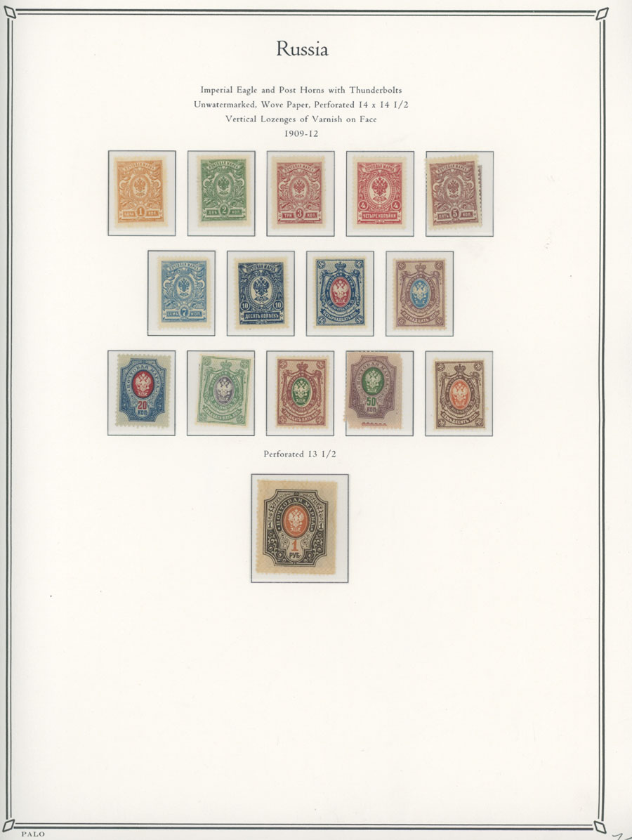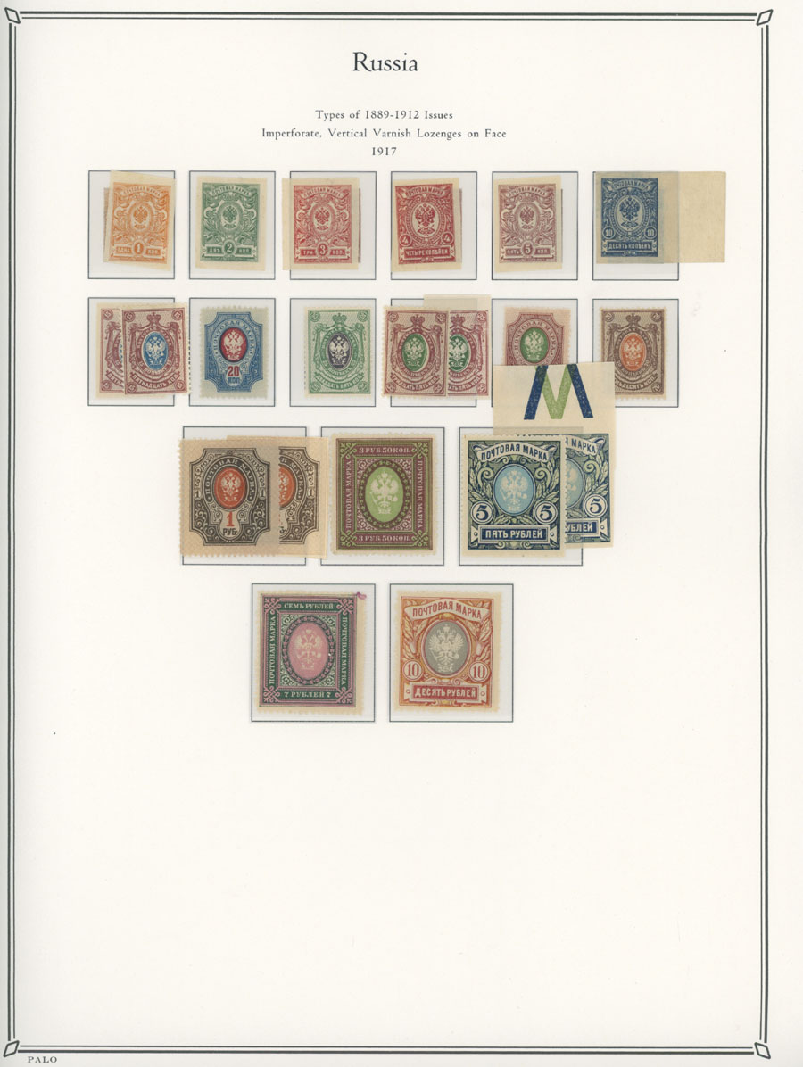 COLLECTION ON ILLUSTRATED PAGES: 1858-1917, 139 mostly mint stamps, starting with the 3rd issue with perforation 12½ (1k-20k unused, 30k – used), following by used set with perforation 14½x15 (No.12-18), continues with mint set of No.19-25 and 31-38, then sets on horizontally (No. 41-45, 46-54) and vertically (No.55-70) laid paper, plus mint Romanov Dynasty and later issues, fresh quality unit, full/part of OG, unused or used, F/VF, C.v. $5,700, Est. $1,500-$2,000, Scott #5/141