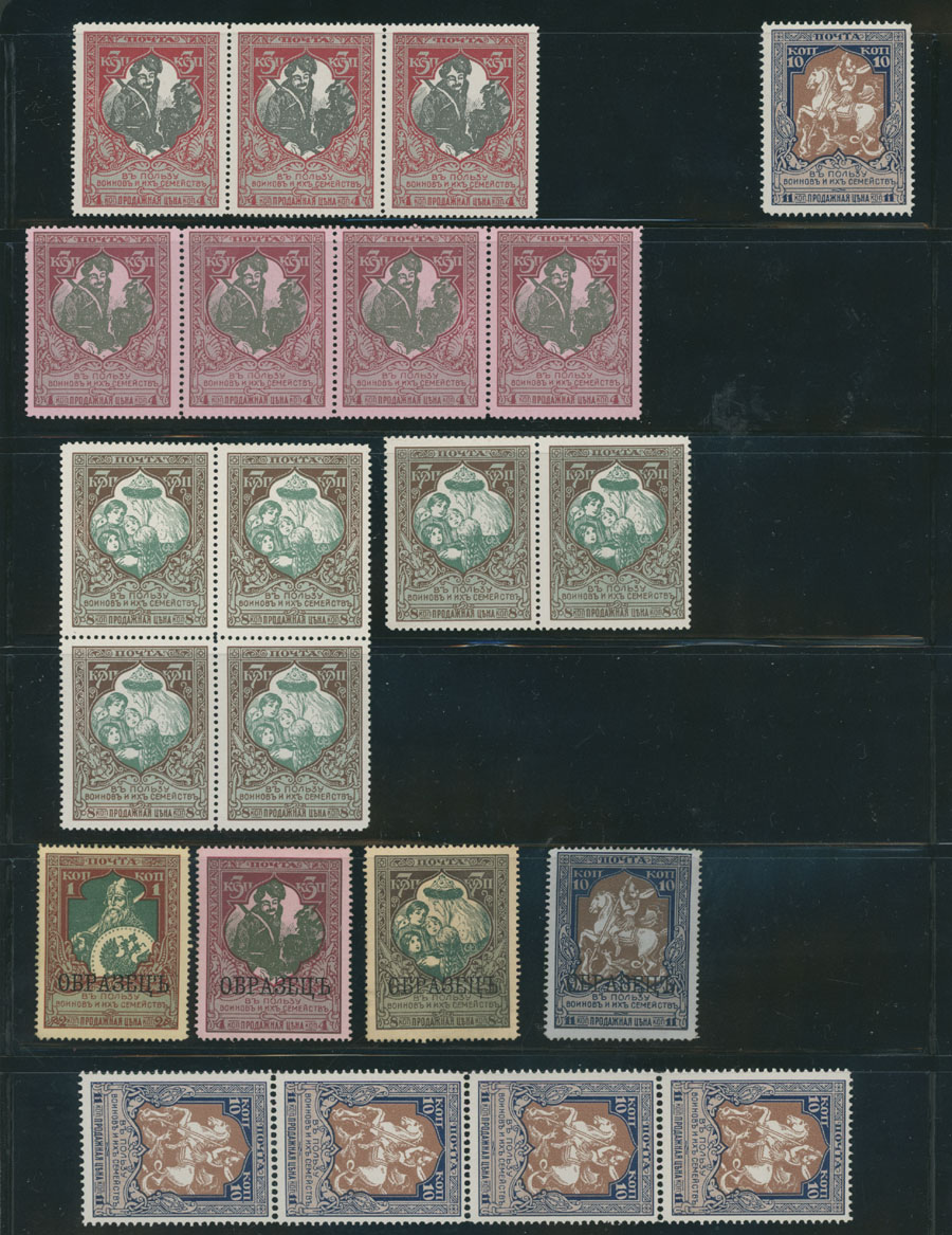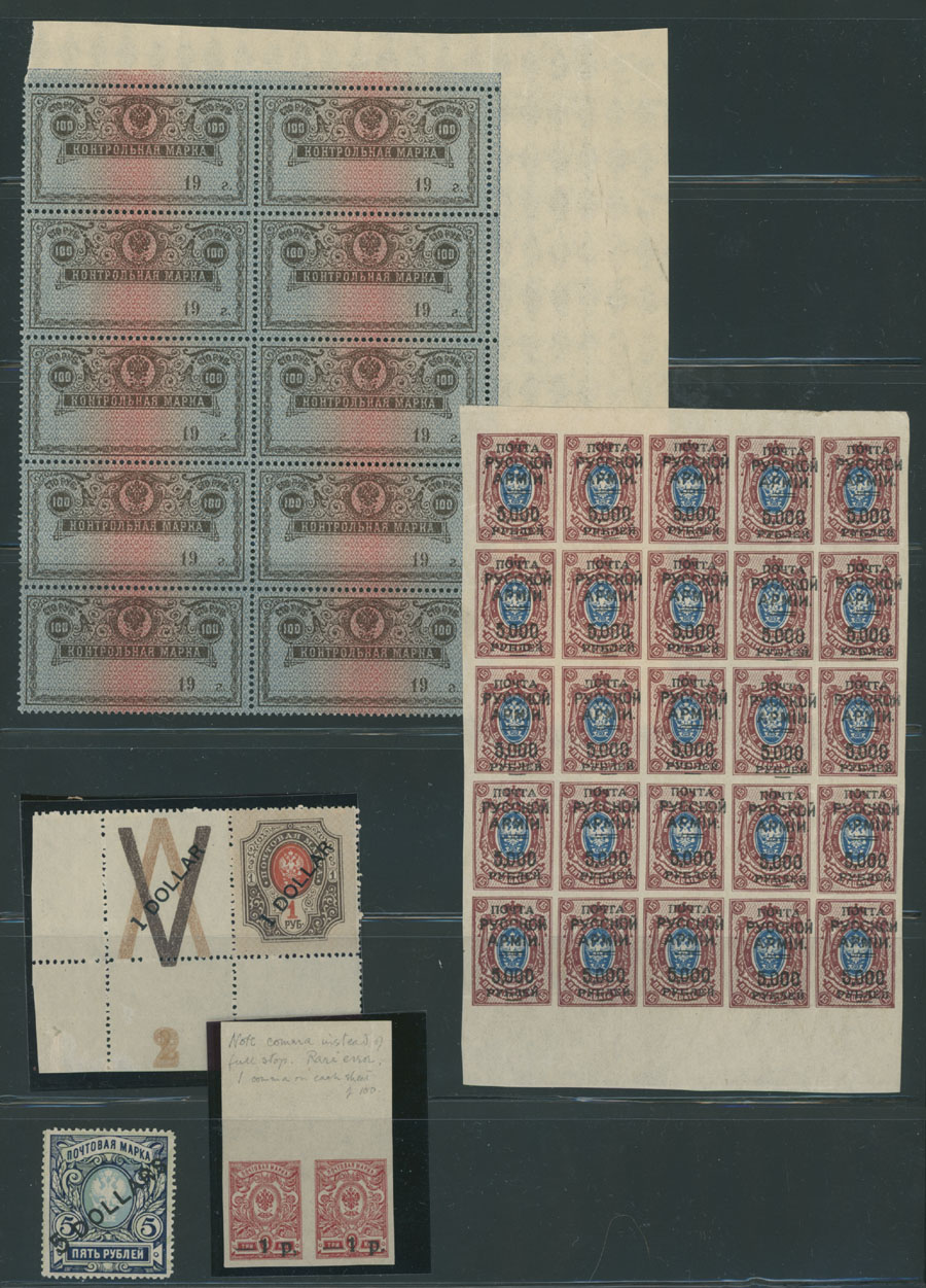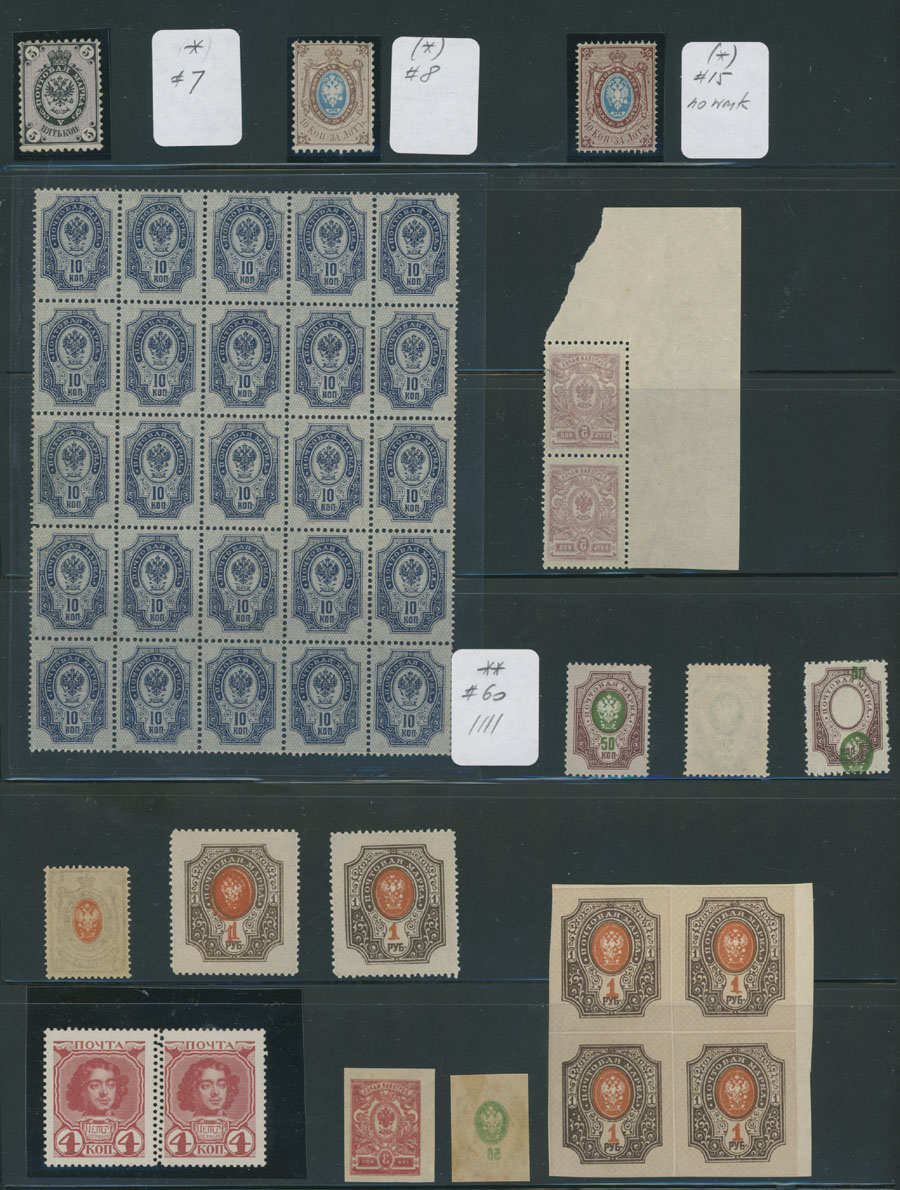 BALANCE OF A CONSIGNMENT: 1858-1921, about 100 mint stamps in singles, pairs and blocks, starting with 5k and 10k with perforation 12 and 10k with perforation 14½x15 without watermark, including 10k on vertically laid paper in pane of 25, then varieties of issues on wove paper plus singles and multiples of the WWI Charity issues, including first set of Specimens, two Russian Offices in China surcharges and etc., full/part of OG with many NH stamps, Est. $500-$600
