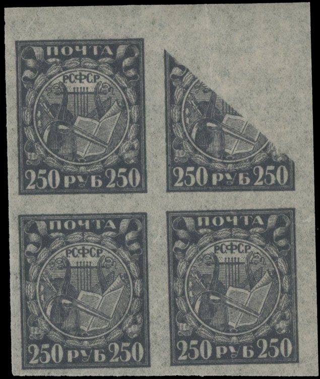 1921, 250r violet, top margin block of four printed on thin paper, upper right stamp has missing a part of the design, full OG, NH, VF, Est. $150-$200 , Scott #183c, var