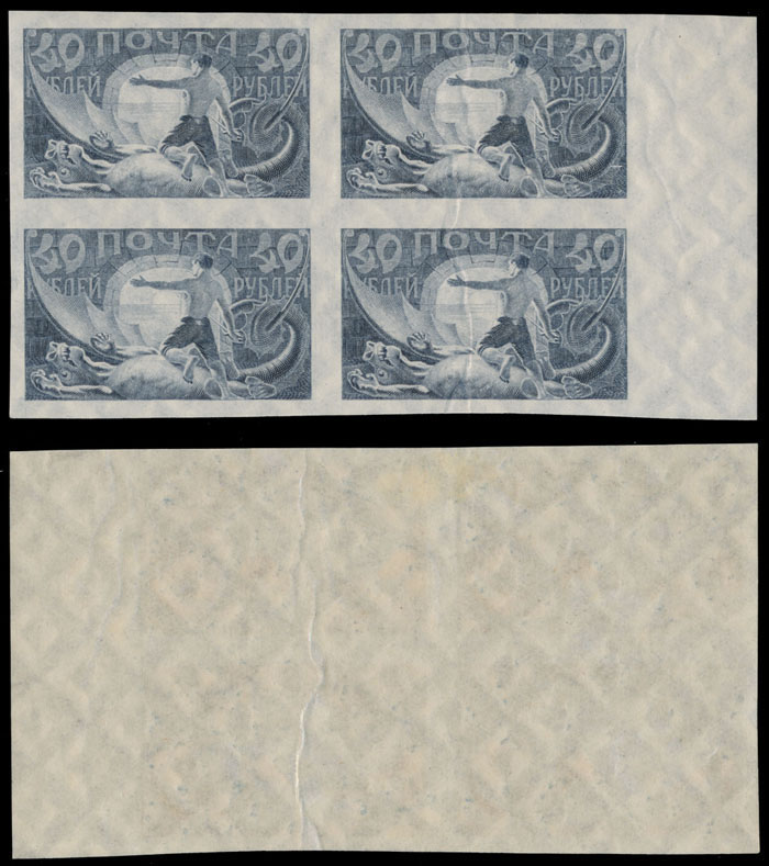 1921, New Russia Triumphant, imperforate proof of 40r in gray violet, large size stamp (small angle to the right), right sheet margin block of four, pre-printing paper fold, full OG, NH (1) or VLH, VF, Standard Cat. #Pr(7 II), Est. $400-$500, Scott #187
