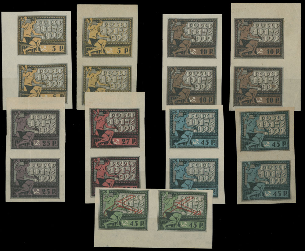 1922, 5th Anniversary of October Revolution, 5r-45r and air post stamp with red Airplane overprint on 45r, nine pairs (8 vertical), including complete set of six plus 5r, 10r and 45r (postage) on gray paper, full OG (25r with vertical fold), NH, VF, Est. $200-$250, Scott #211-15, var, C1