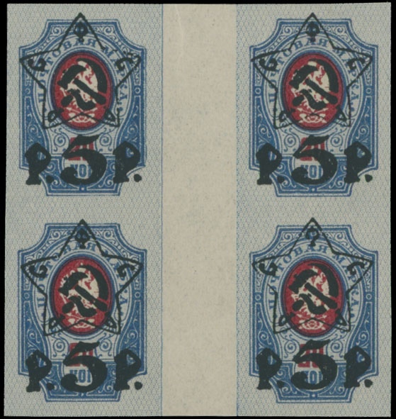 1922-23, black litho ”Star” surcharge 5r on imperforate 20k blue and carmine, vertical gutter block of four, full OG, NH, VF and scarce positional piece, Est. $600-$700 , Scott #223 var