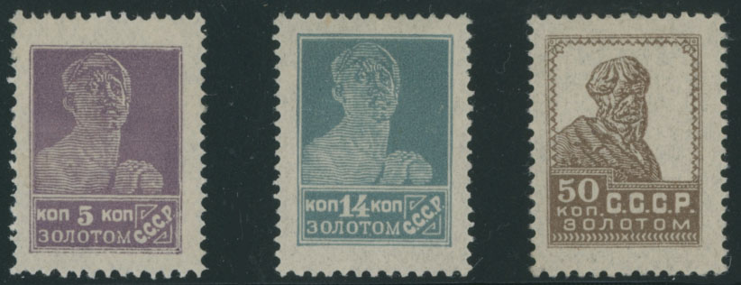 1924-25, definitive issue, 5k lilac, 14k slate blue and 50k brown, three values with perforation 14½x15, full OG, NH (5k) or LH, VF, C.v. $775, Est. $300-$400 , Scott #280, 286, 289