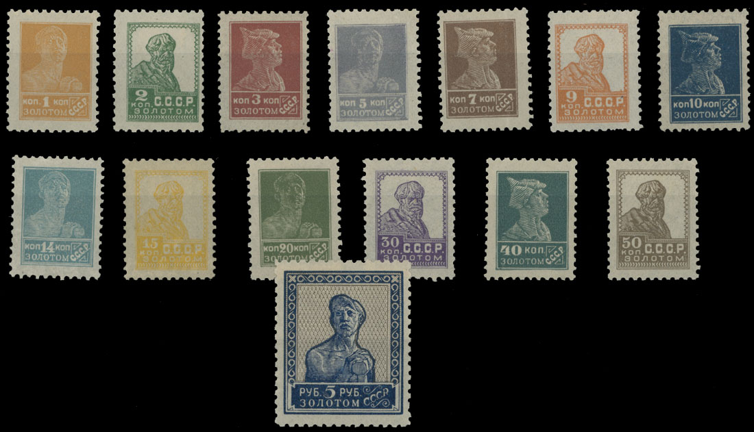 1925, definitive issue, 1k-5r, set of 14, typo printing, perforation 12 and 10½ (5r), full OG, NH or LH/hinged (2k, 7k, 9k, 10k, 14k, 15k, 40k), mostly VF, C.v. $475, Est. $300-$350 , Scott #276a/293a