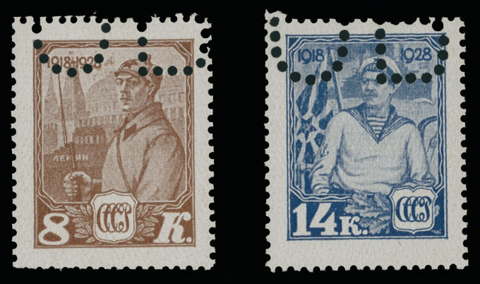 1928, 10th Anniversary of the Red Army, soldier 8k brown and sailor 14k blue, each one with a part of perfin ”OBRAZETS”, full OG, NH or VLH, VF and very scarce couple from the Postal Archives, both guaranteed genuine, ex-Vadim Ustinovsky, Est. $300-$350, Scott #402-03