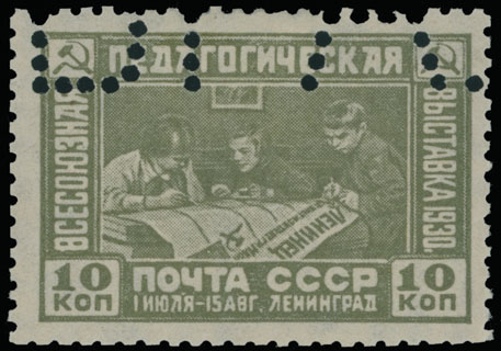 1930, Educational Exhibition, 10k olive green, a part of horizontal perfin ”OBRAZETS” at the top, full OG, LH, VF and very rare, ex-Vadim Ustinovsky, Est. $150-$200 , Scott #435