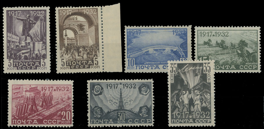 1932-33, 15th Anniversary of October Revolution, 3k-35k, complete set of seven, full OG, NH, mostly VF, C.v. $330, Est. $250-$300 , Scott #472-78