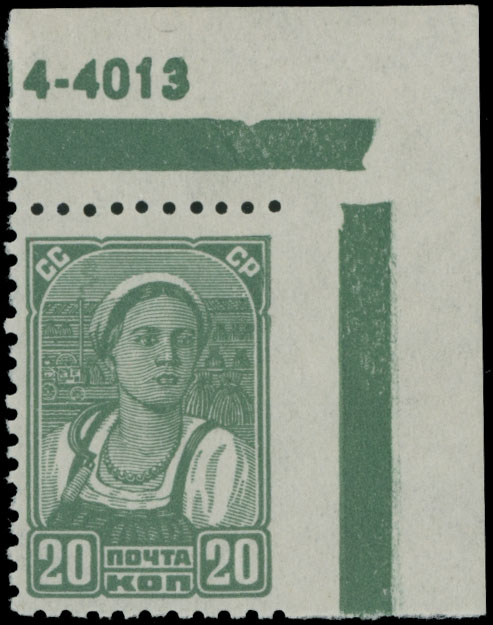 1936, farm worker 20k green, top right corner margin single with a part of selvage inscription, printed on paper without watermark, full OG, NH (hinged on margin only), VF, Est. $300-$400 , Scott #617 var