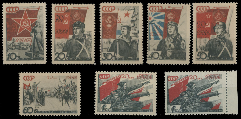 1938, 20th Anniversary of the Red Army, 10k-1r, complete set of seven on yellow thick paper plus 1r on white ordinary paper, full OG, NH, VF, C.v. $152, Est. $100-$120 , Scott #629-35, var