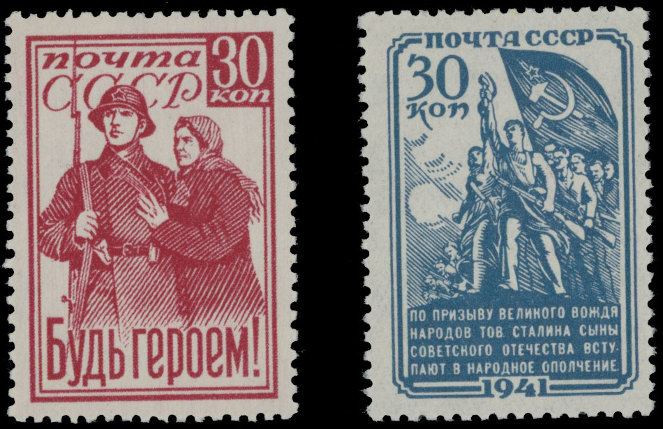1941, ”Be a Hero!”, 30k carmine and People’s Militia, 30k blue, both with full OG, NH, VF, C.v. $335, Est. $200-$250 , Scott #856, 859
