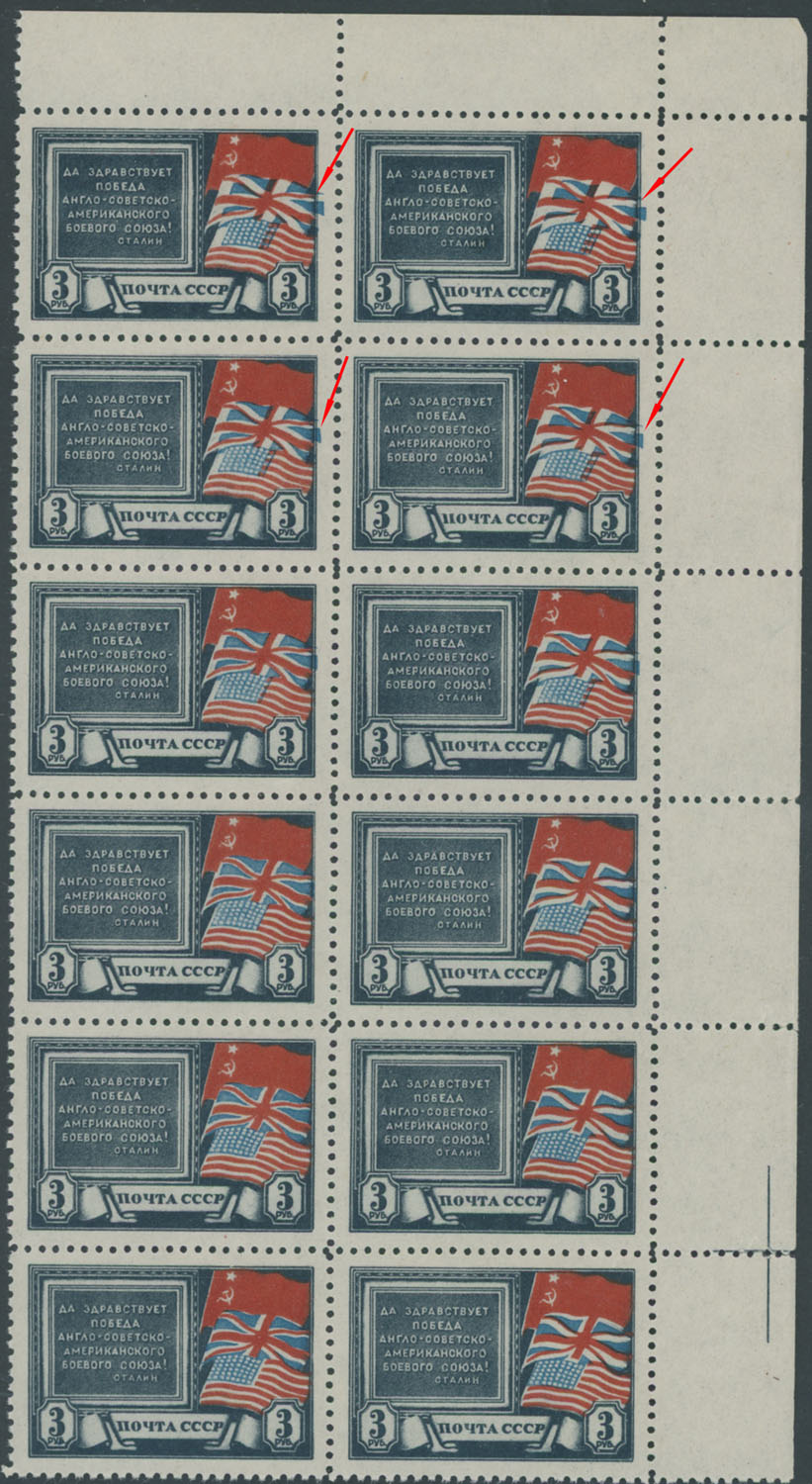 1943, Tehran Conference, 3r indigo, red and blue, top right corner sheet margin transition block of 12 (2×6), representing six normal stamps at bottom and six at top with shift of blue color in various degree, which is about 2mm from normal on top block of four, full OG, NH, VF and a spectacular piece, Est. $300-$400, Scott #908, var