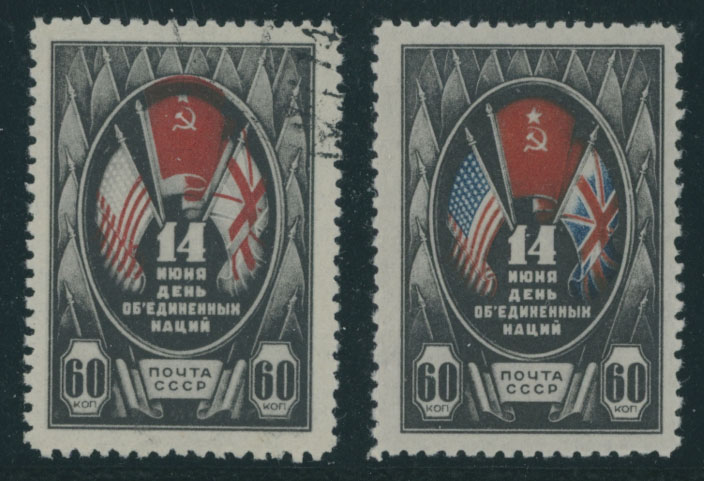 1944, Day of the United Nations 60k, a single with blue color omitted and red significantly shifted to the top, CTO with full OG (LH), VF, a common stamp is included, Est. $150-$200 , Scott #921 var