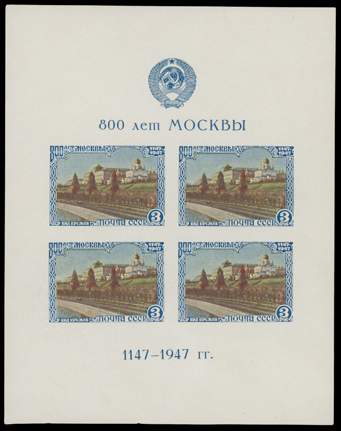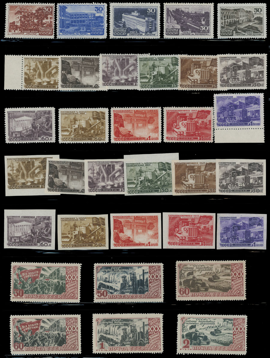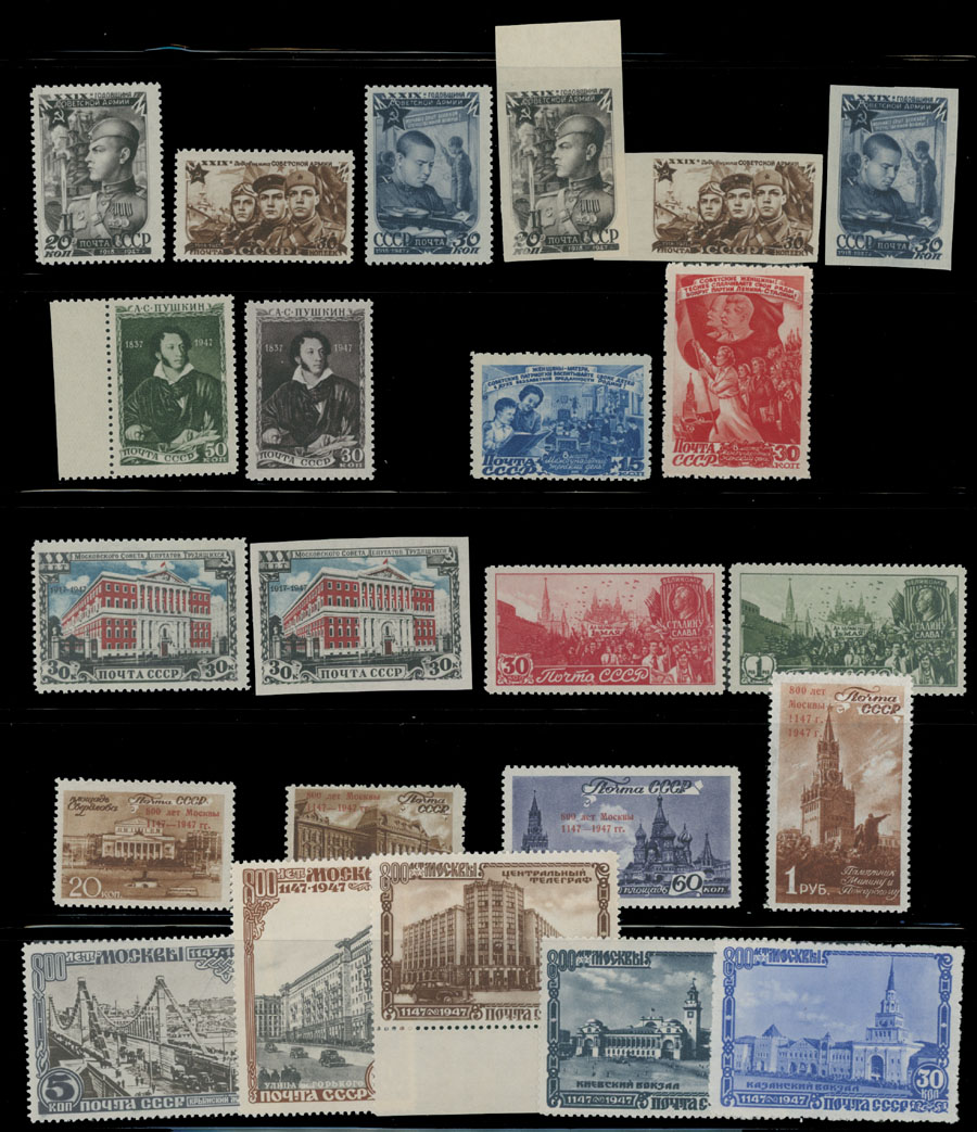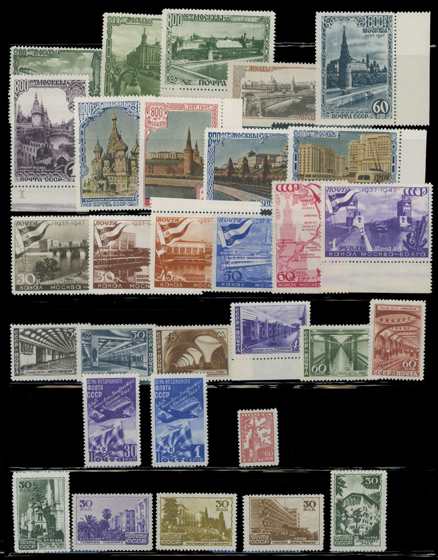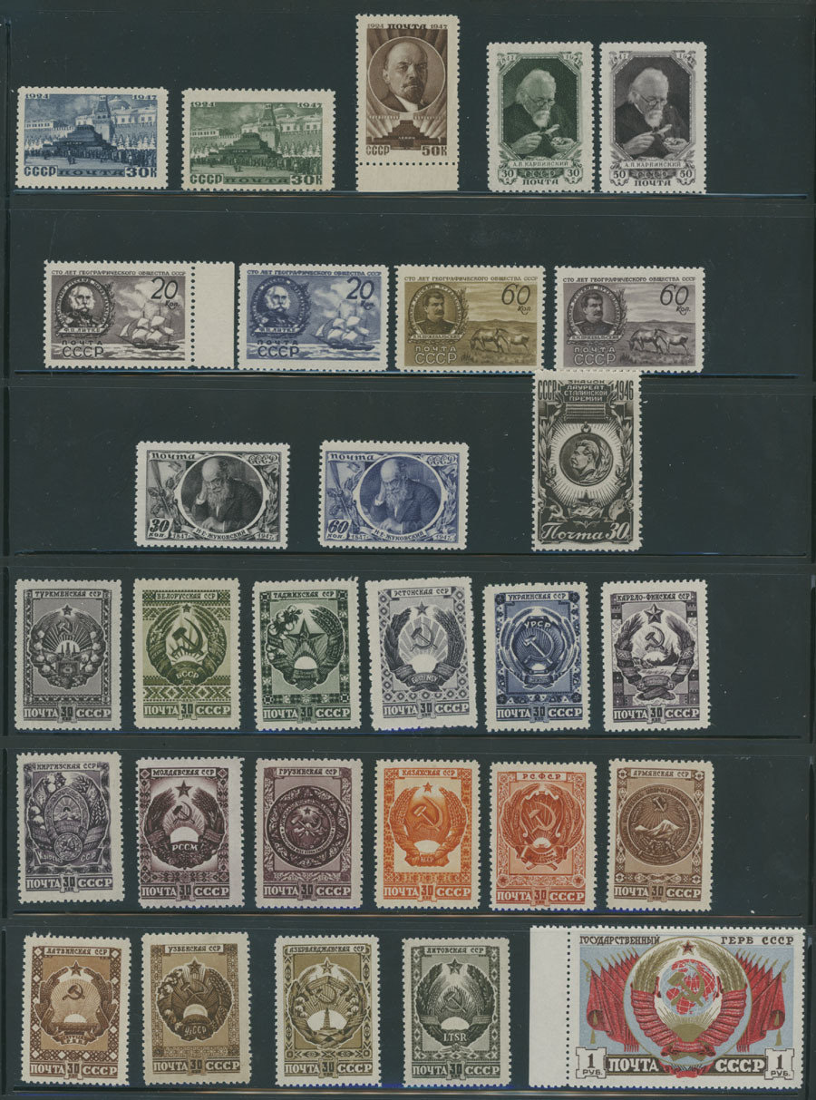 1947 Year, complete set of 115 stamps (no imperforates of 30th Anniversary of Revolution) and one souvenir sheet, including Arms of the Republics, Jubilee of Moscow and Reconstruction perf and imperf issues, full OG, NH, F/VF, C.v. $464, Est. $300-$350, Scott #1091-188
