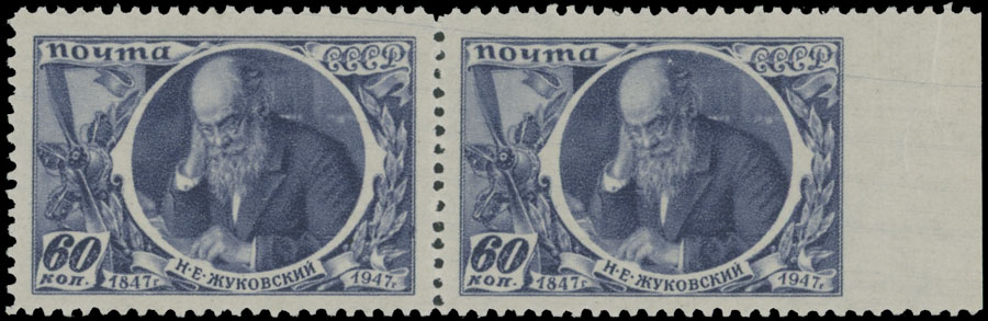 1947, Nikolay Zhukovsky, 60k blue violet, right sheet margin horizontal pair, imperforate at right, full OG, NH, VF, Est. $400-$500 , Scott #1099 var