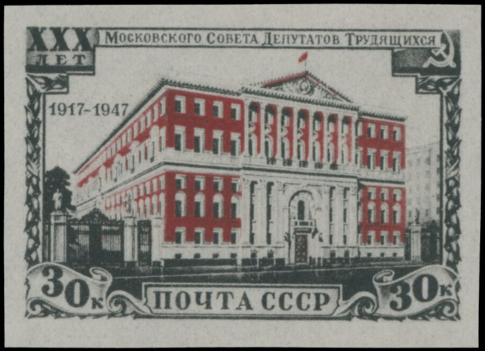 1947, Moscow Council Building, imperforate 30k black and red with light blue color omitted, full OG, NH, VF, C.v. $150-$180 , Scott #1125 imp var