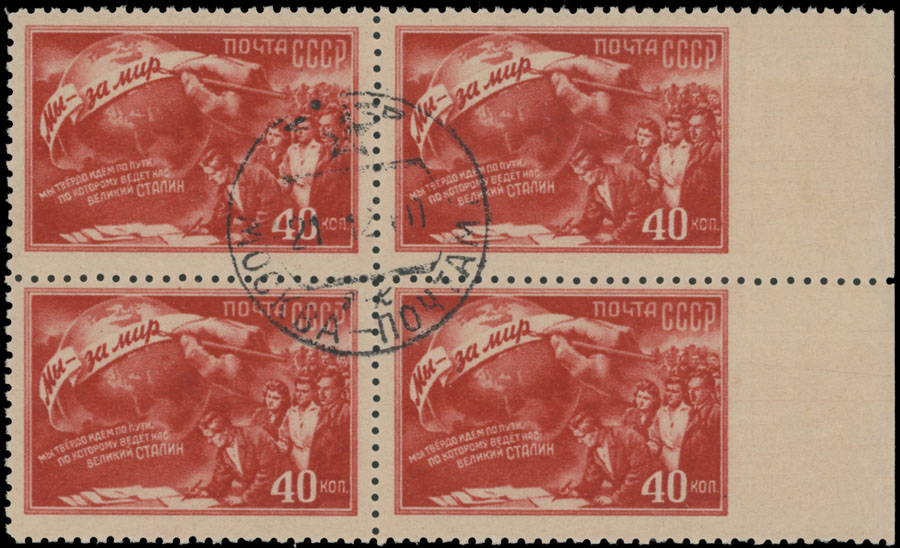 1950, Peace Campaign, 40k red on salmon paper, right sheet margin block of four, imperforate on the right, CTO with full OG (NH), VF, Est. $400-$450 , Scott #1504, var