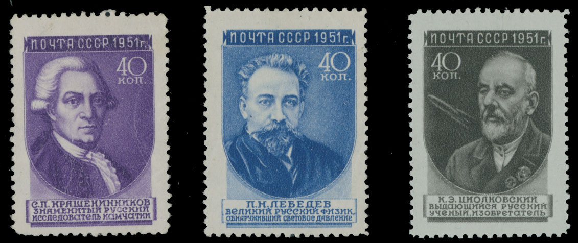 1951, Russian Scientists, Stepan Krasheninnikov 40k violet, Pyotr Lebedev 40k blue and Konstantin Tsiolkovsky 40k gray black on blue paper, all have raster horizontal diamonds, full/large part of OG, NH (Tsiolkovsky) or hinged, mostly VF, Est. $800-$900, Scott #1572, 1574, 1582 var