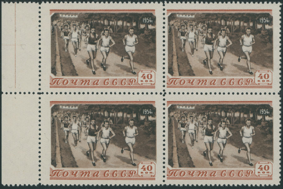 1954, Sports issue, Track, 40k multicolored, double impression of black color, left sheet margin block of four, full OG, NH, VF, Est. $500-$600 , Scott #1714 var