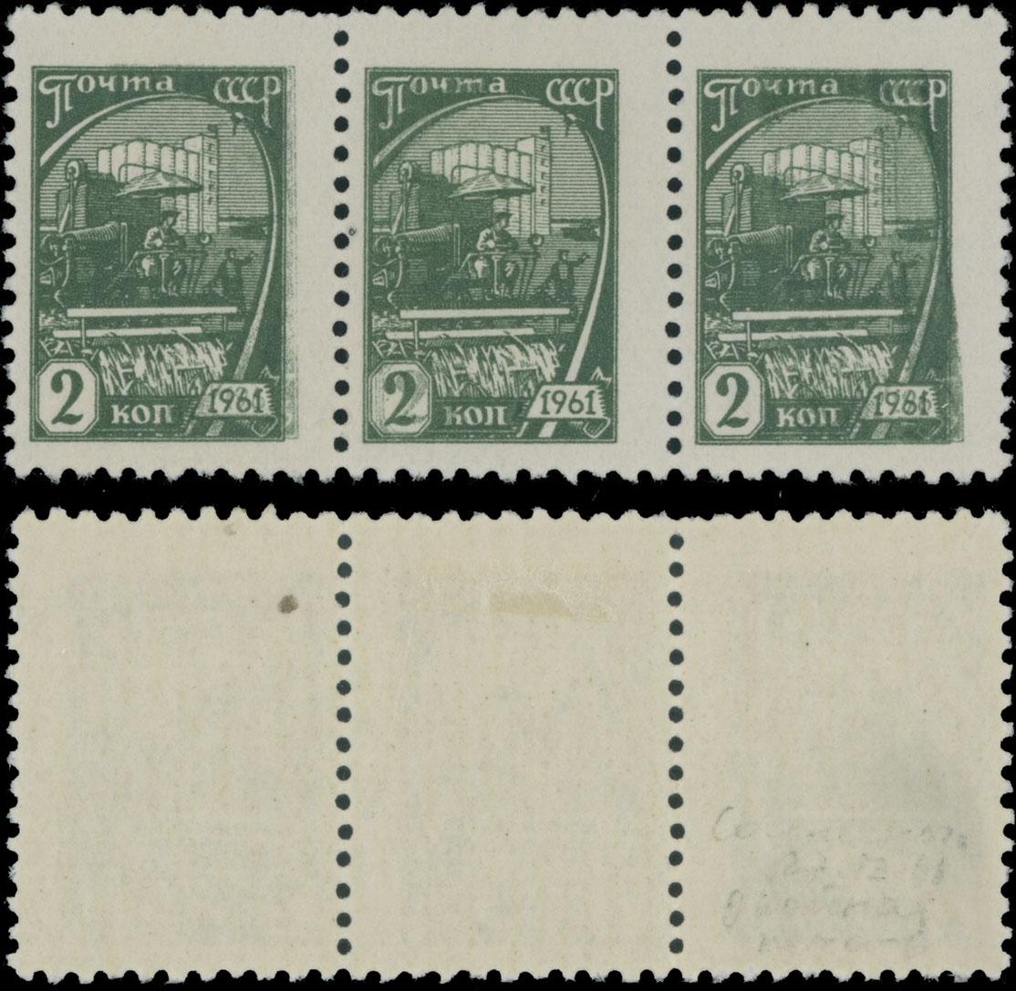 1961, Harvesters on Combine and Sputnik Orbit, 2k green, horizontal strip of three, each value showing double impression due to printer’s sheet breakage, right stamp has two tiny natural inclusions with no importance, perfect quality, full OG, NH or LH (center stamp), F/VF, absolutely spectacular and with high probability the only known multiple, ex-V. Ustinovsky, Est. $400-$500, Scott #2440 var