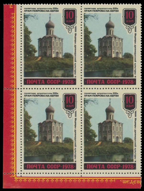 1978, Old Russian Arts, Pokrova-on-Nerl’ Church, 10k multicolored, double impression of black color, bottom left corner margin block of four, full OG, NH, VF, Est. $400-$500 , Scott #4710 var