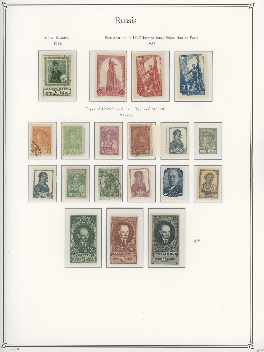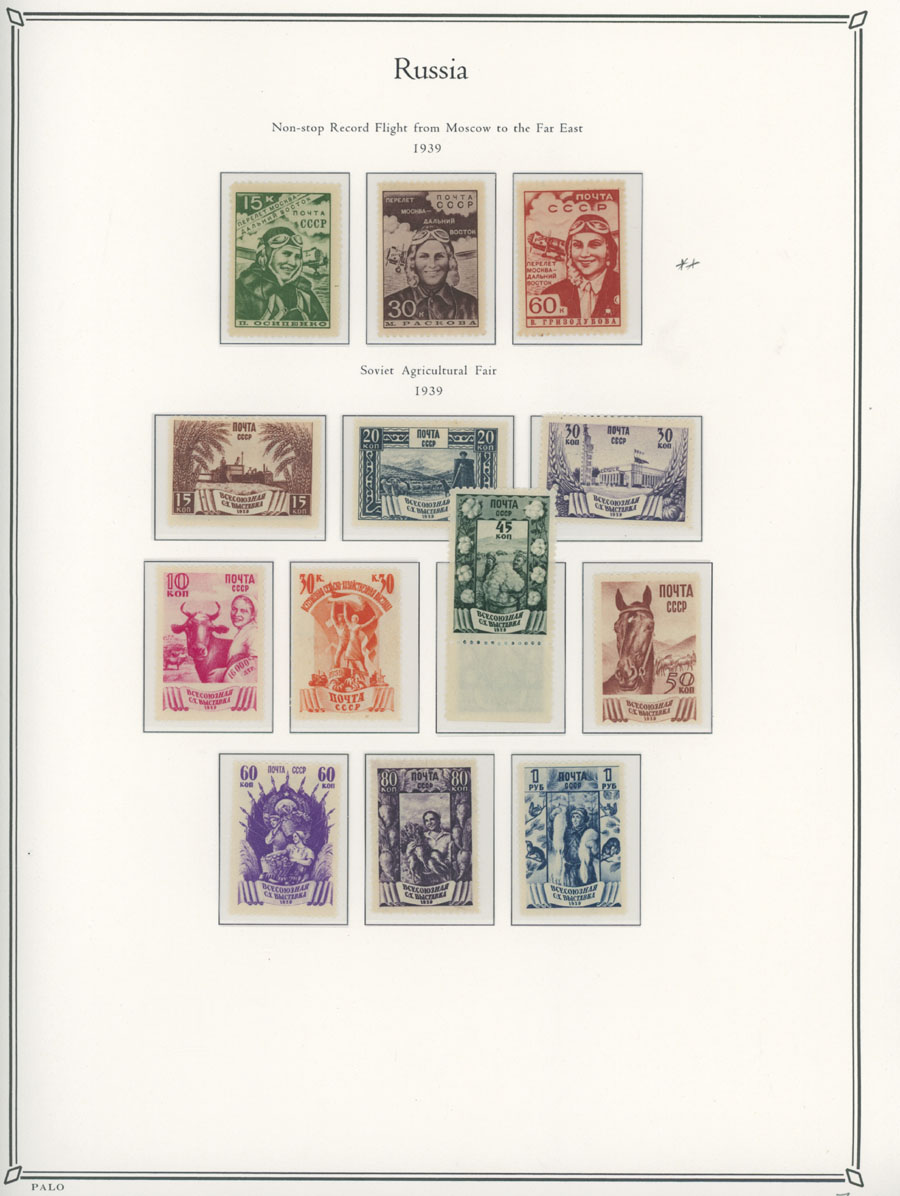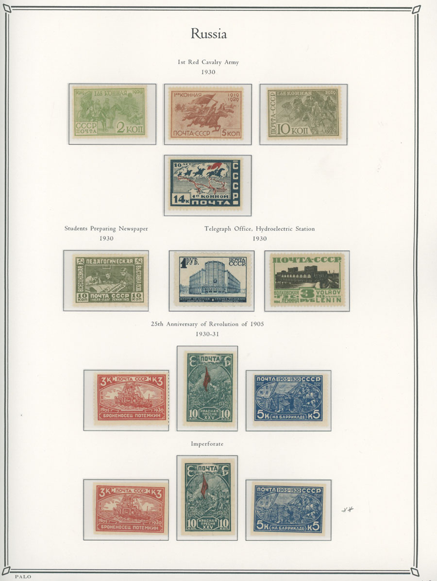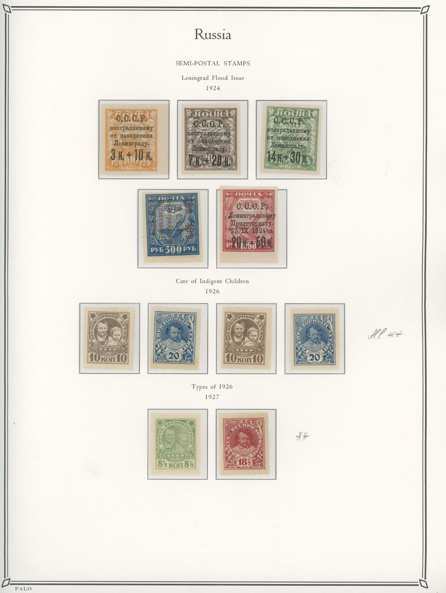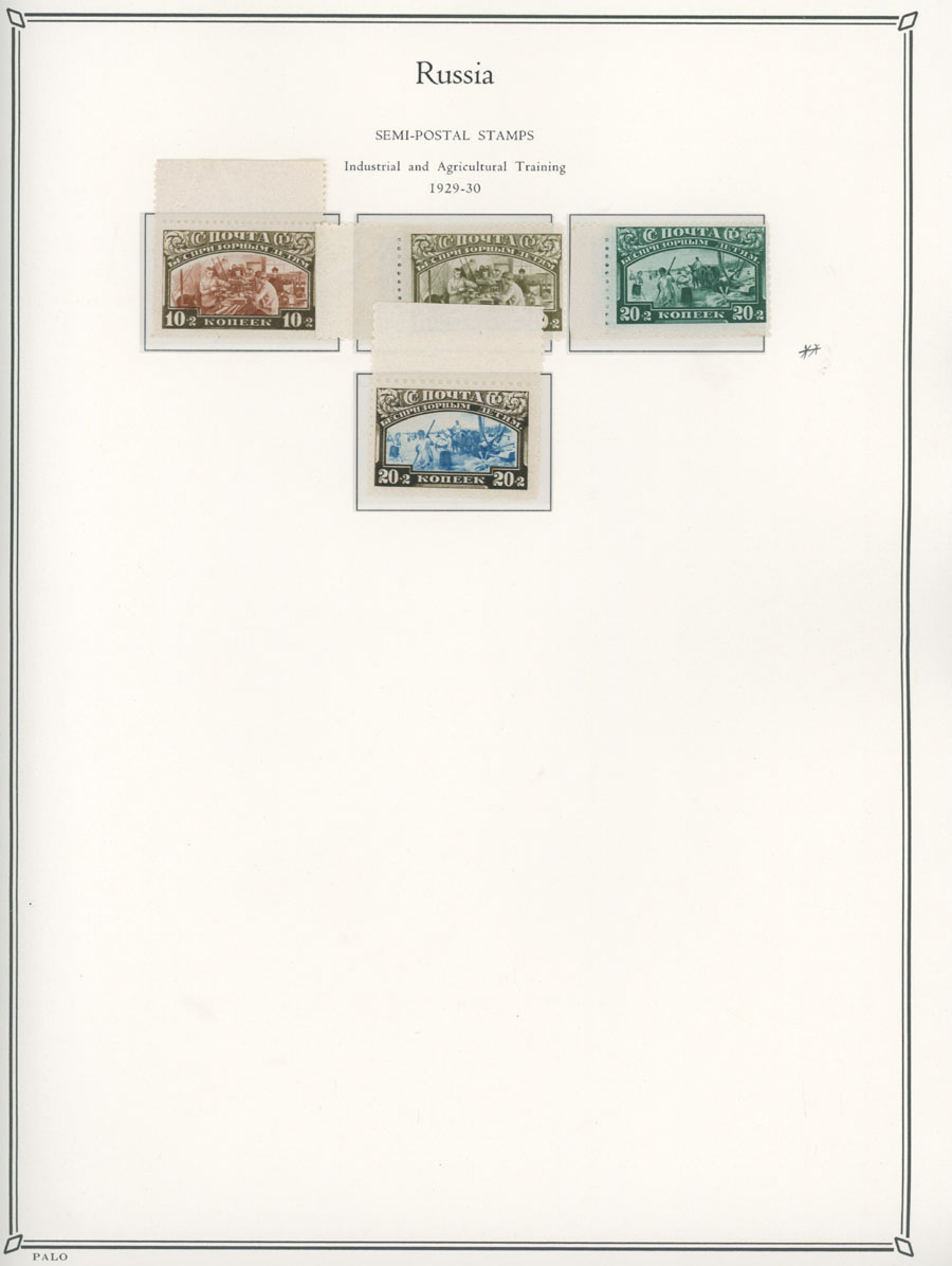 NEAT RSFSR AND SOVIET UNION PRE-WORLD WAR II COLLECTION ON ILLUSTRATED PAGES: 1918-40, several hundred mainly mint stamps (a few sets used – not counted), starting with complete early Soviet Russia unit (no varieties and No. #224), then the first definitive issue with typo imperf 50k (No.275A, no guarantee and not counted), nice range of two-three stamp sets of 1925-30, then apparently all valuable issues from 1930’s (Ethnographic set – CTO, others – mint), continues with practically complete 1936-40 (colored Agriculture Exhibition – CTO, others mint, some – never hinged), in addition semi-postals and dues (air post – offered separately), nice quality unit, full/part of OG, mainly LH/hinged, F/VF, C.v. is close to $9,000, Est. $2,500-$3,000, Scott #149/816A, B1/56