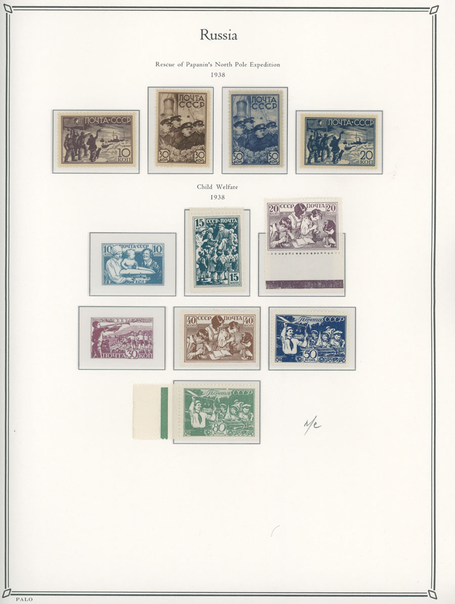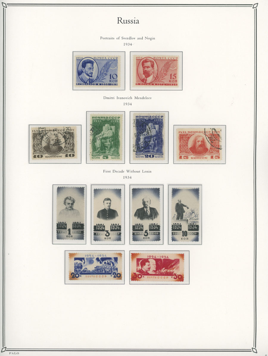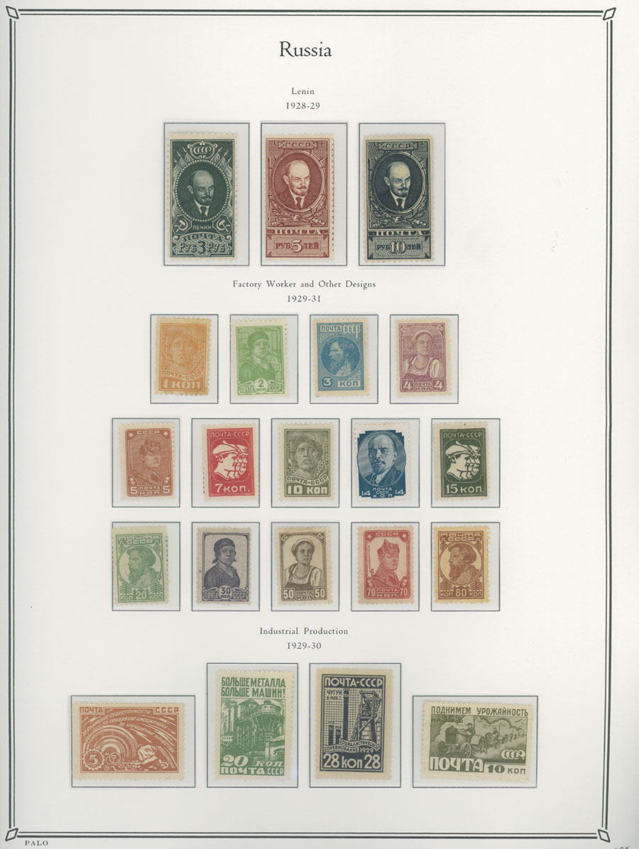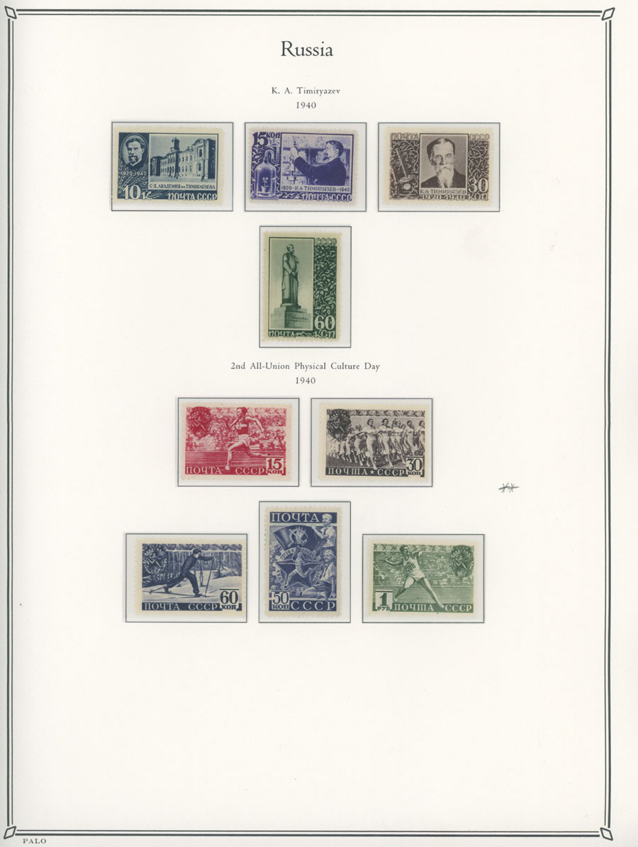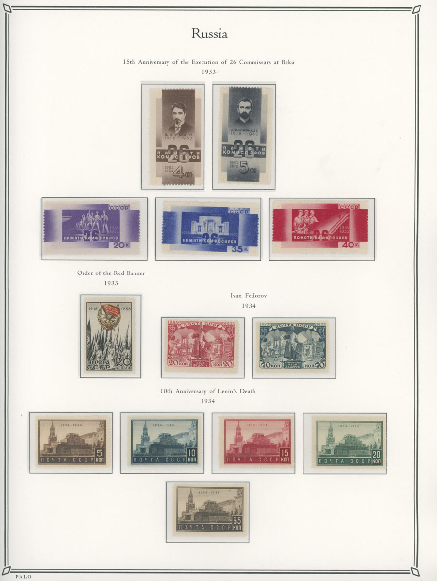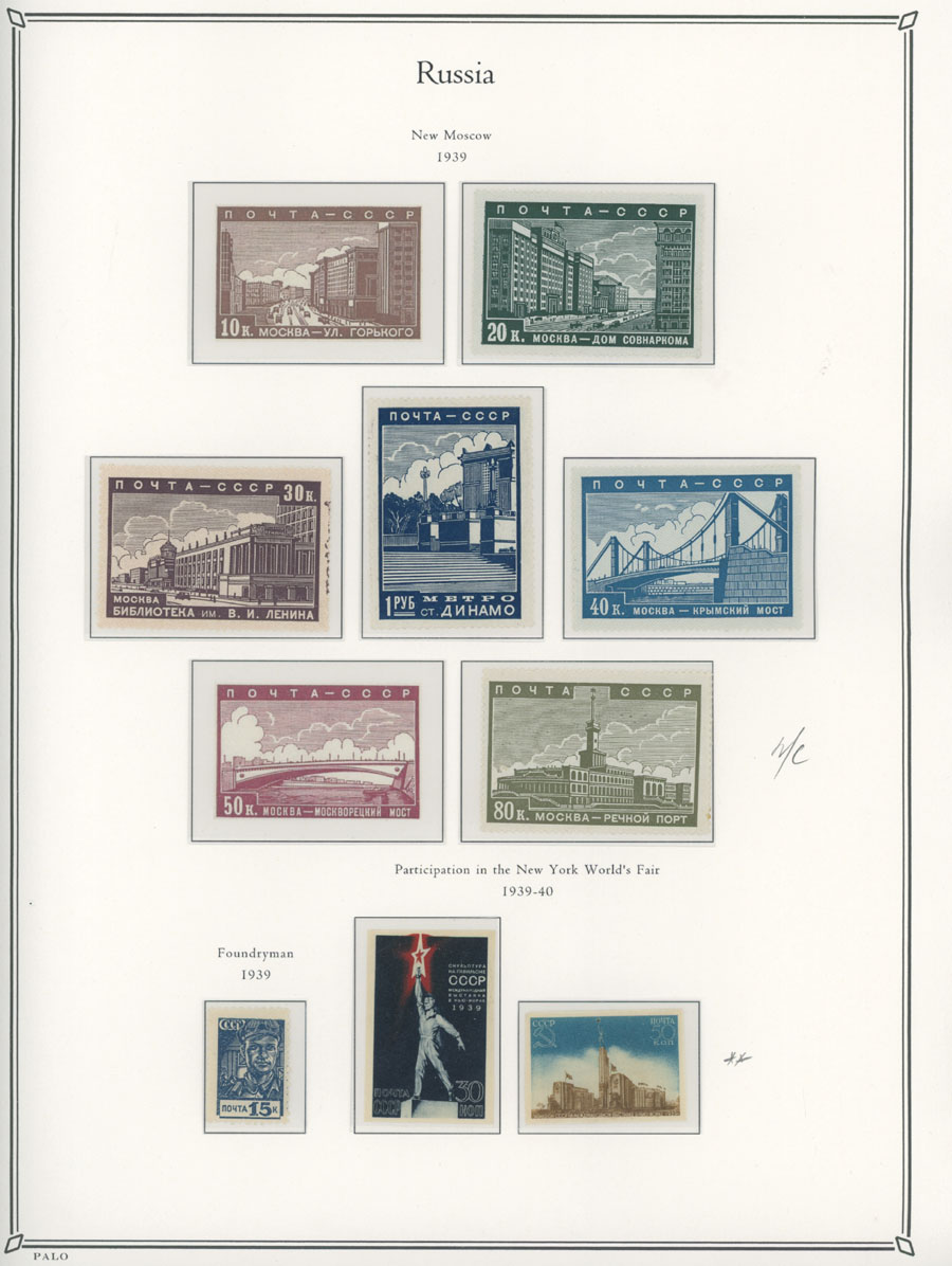 NEAT RSFSR AND SOVIET UNION PRE-WORLD WAR II COLLECTION ON ILLUSTRATED PAGES: 1918-40, several hundred mainly mint stamps (a few sets used – not counted), starting with complete early Soviet Russia unit (no varieties and No. #224), then the first definitive issue with typo imperf 50k (No.275A, no guarantee and not counted), nice range of two-three stamp sets of 1925-30, then apparently all valuable issues from 1930’s (Ethnographic set – CTO, others – mint), continues with practically complete 1936-40 (colored Agriculture Exhibition – CTO, others mint, some – never hinged), in addition semi-postals and dues (air post – offered separately), nice quality unit, full/part of OG, mainly LH/hinged, F/VF, C.v. is close to $9,000, Est. $2,500-$3,000, Scott #149/816A, B1/56