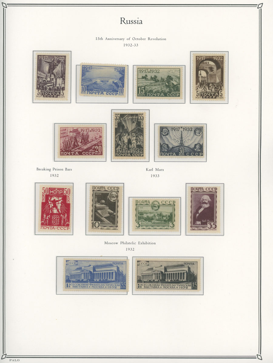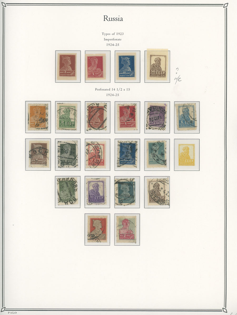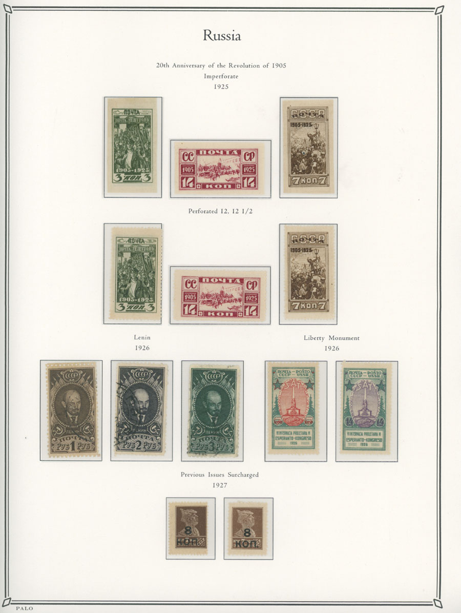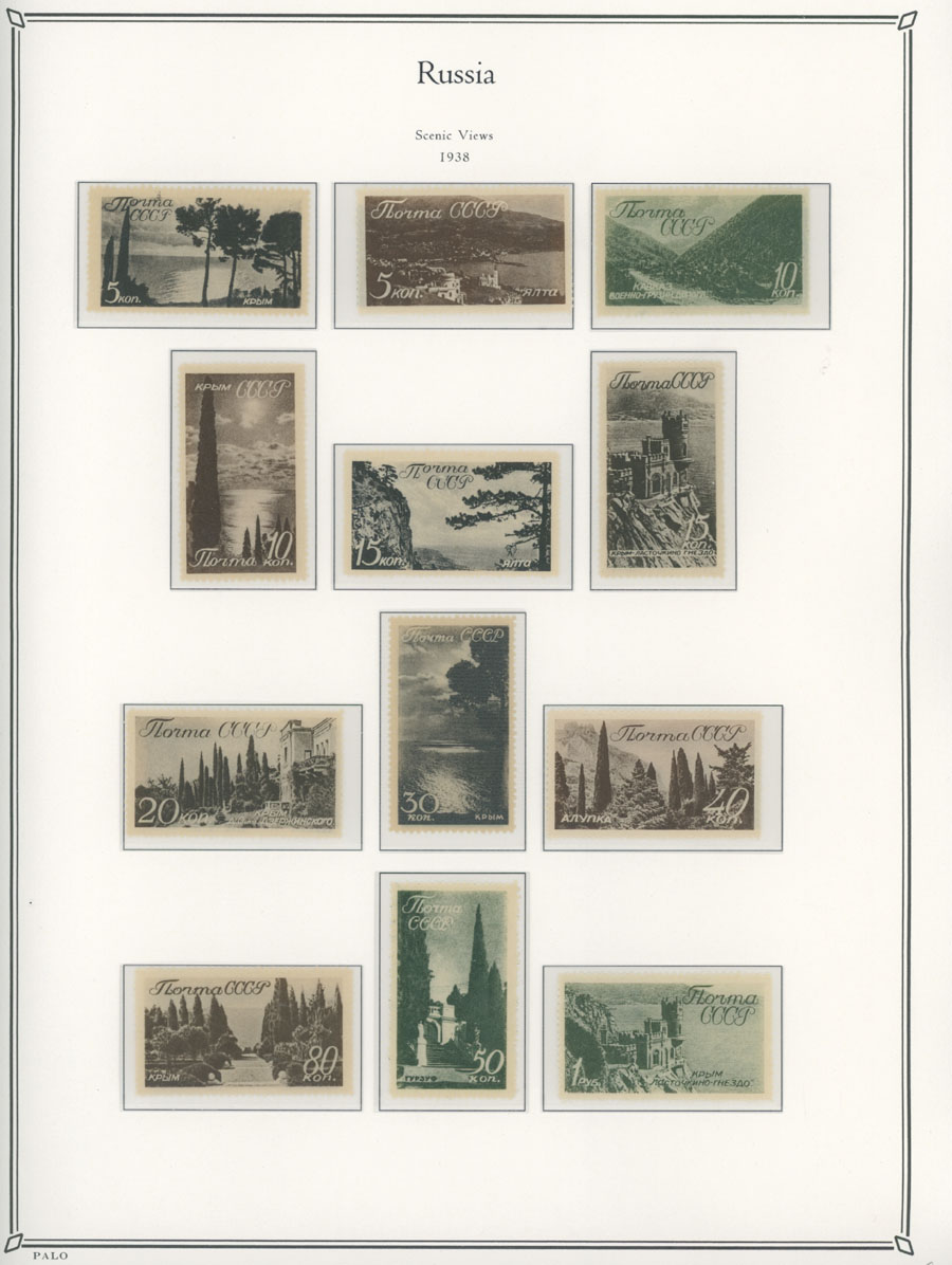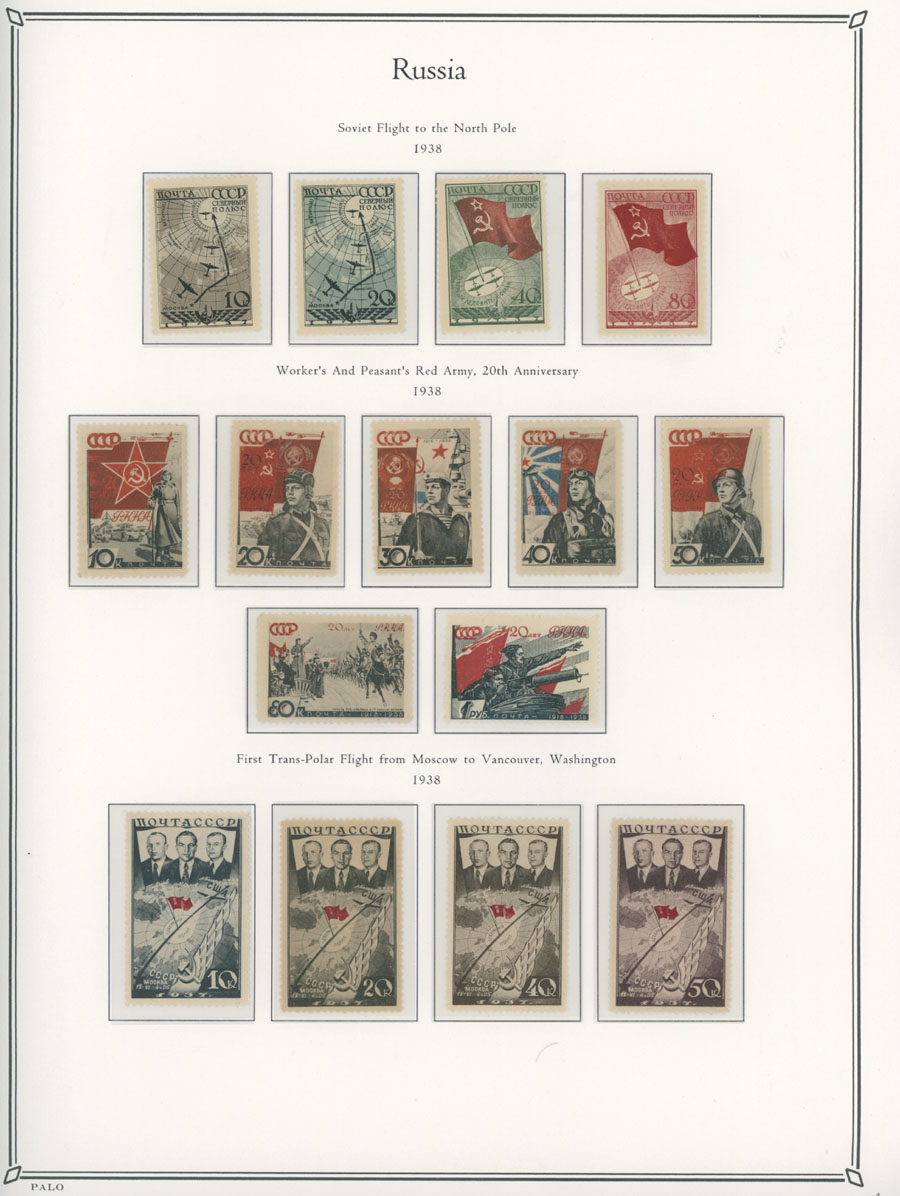 NEAT RSFSR AND SOVIET UNION PRE-WORLD WAR II COLLECTION ON ILLUSTRATED PAGES: 1918-40, several hundred mainly mint stamps (a few sets used – not counted), starting with complete early Soviet Russia unit (no varieties and No. #224), then the first definitive issue with typo imperf 50k (No.275A, no guarantee and not counted), nice range of two-three stamp sets of 1925-30, then apparently all valuable issues from 1930’s (Ethnographic set – CTO, others – mint), continues with practically complete 1936-40 (colored Agriculture Exhibition – CTO, others mint, some – never hinged), in addition semi-postals and dues (air post – offered separately), nice quality unit, full/part of OG, mainly LH/hinged, F/VF, C.v. is close to $9,000, Est. $2,500-$3,000, Scott #149/816A, B1/56
