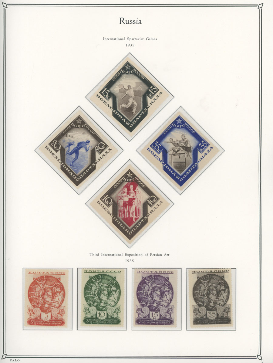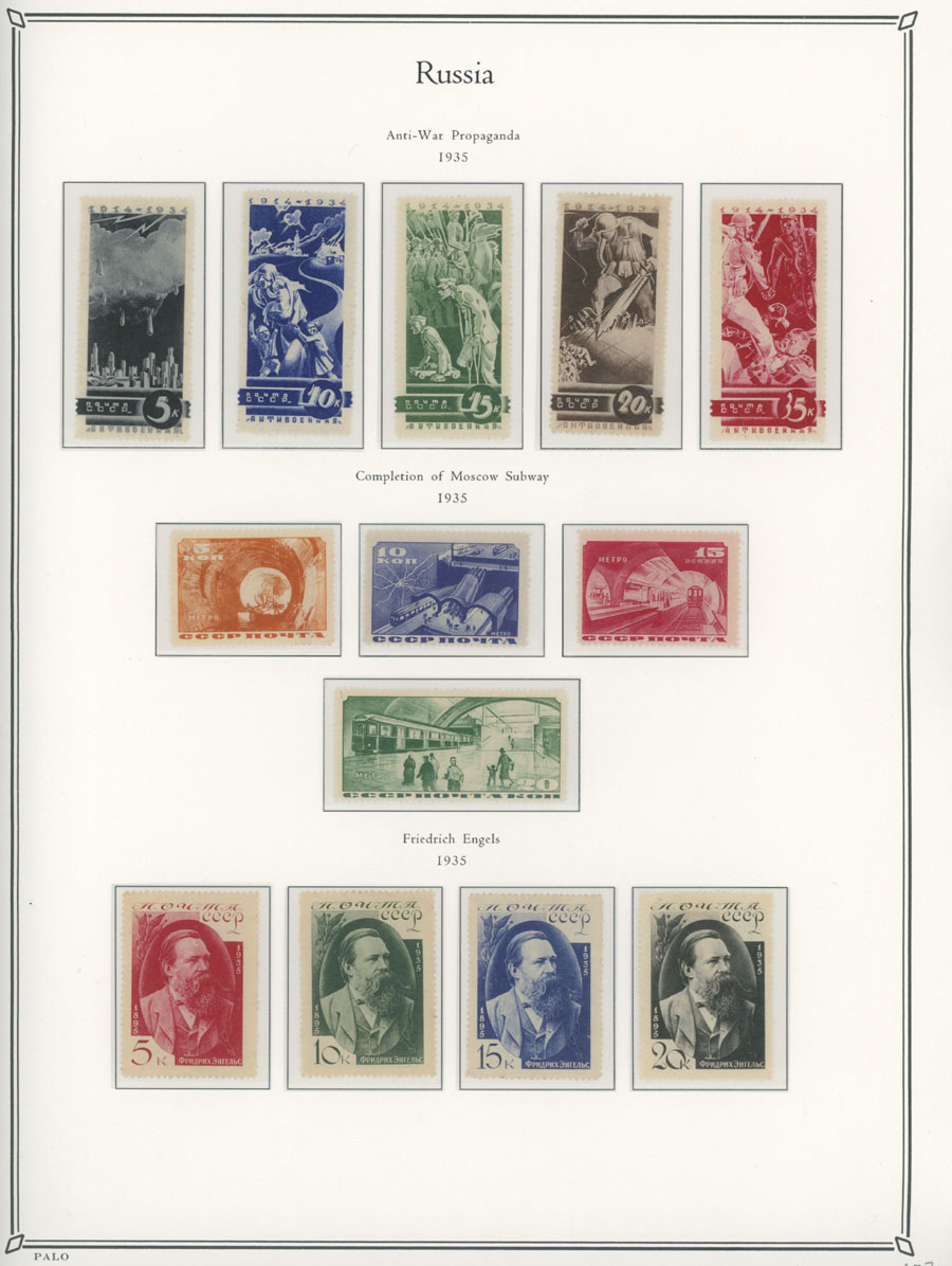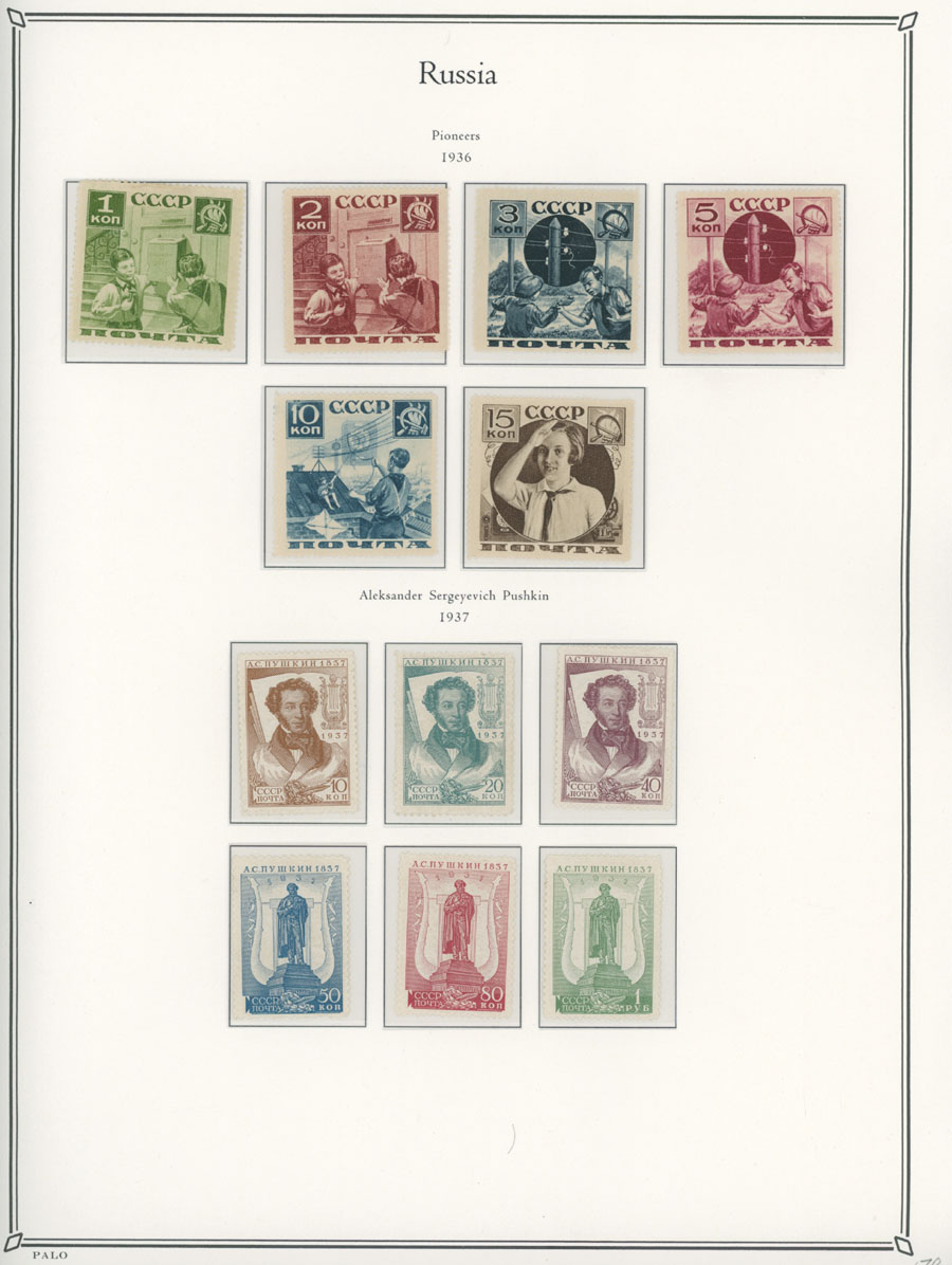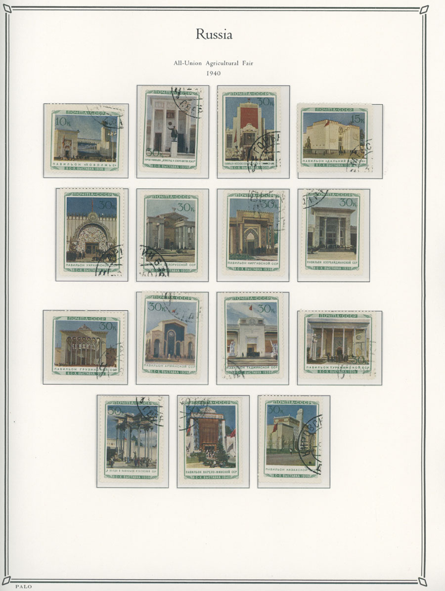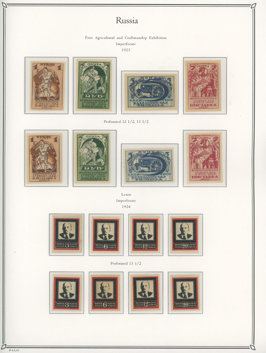 NEAT RSFSR AND SOVIET UNION PRE-WORLD WAR II COLLECTION ON ILLUSTRATED PAGES: 1918-40, several hundred mainly mint stamps (a few sets used – not counted), starting with complete early Soviet Russia unit (no varieties and No. #224), then the first definitive issue with typo imperf 50k (No.275A, no guarantee and not counted), nice range of two-three stamp sets of 1925-30, then apparently all valuable issues from 1930’s (Ethnographic set – CTO, others – mint), continues with practically complete 1936-40 (colored Agriculture Exhibition – CTO, others mint, some – never hinged), in addition semi-postals and dues (air post – offered separately), nice quality unit, full/part of OG, mainly LH/hinged, F/VF, C.v. is close to $9,000, Est. $2,500-$3,000, Scott #149/816A, B1/56