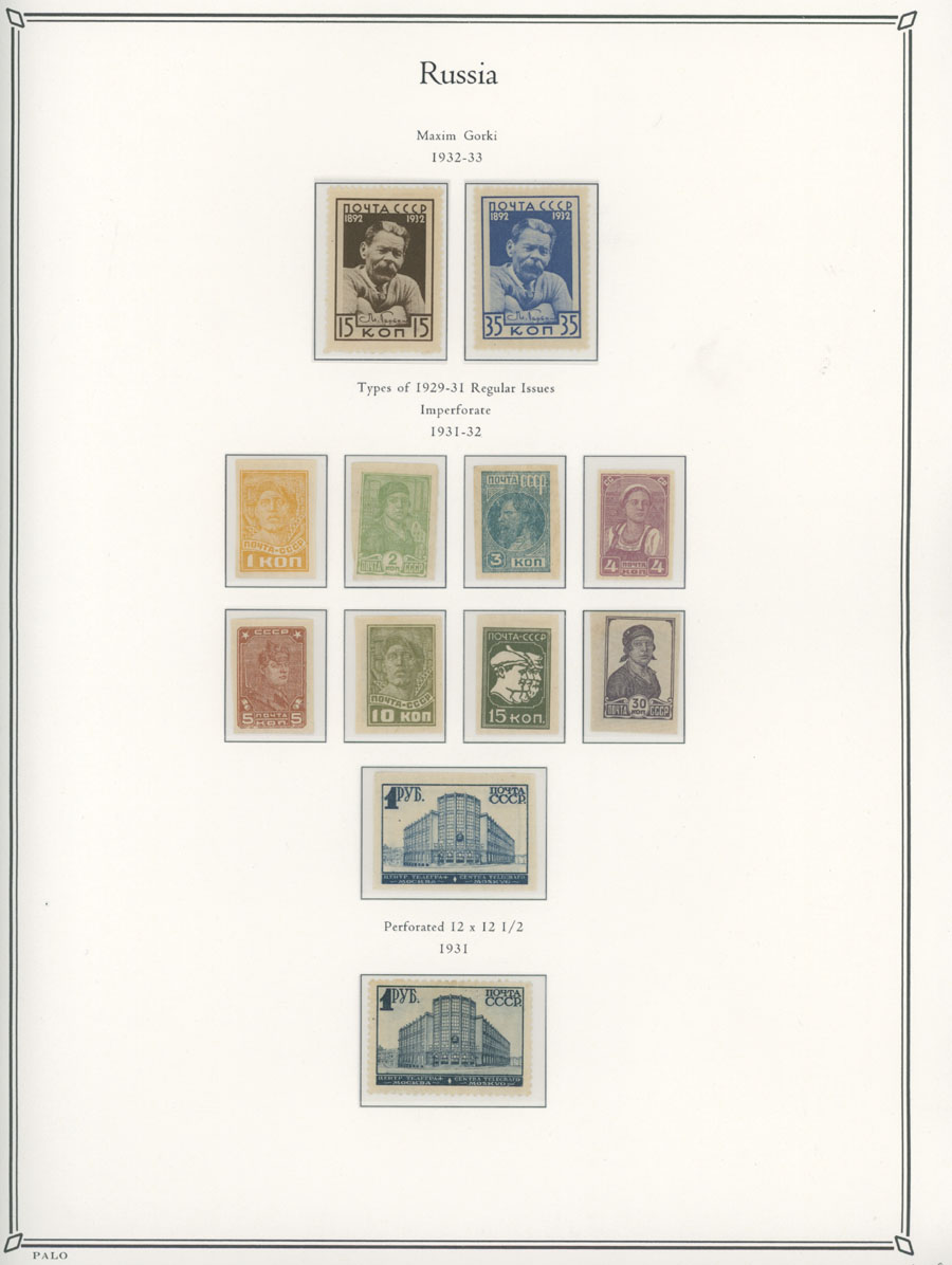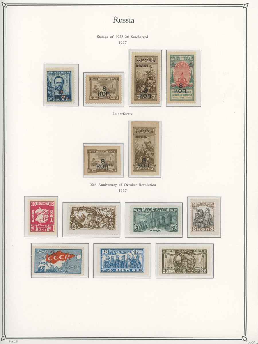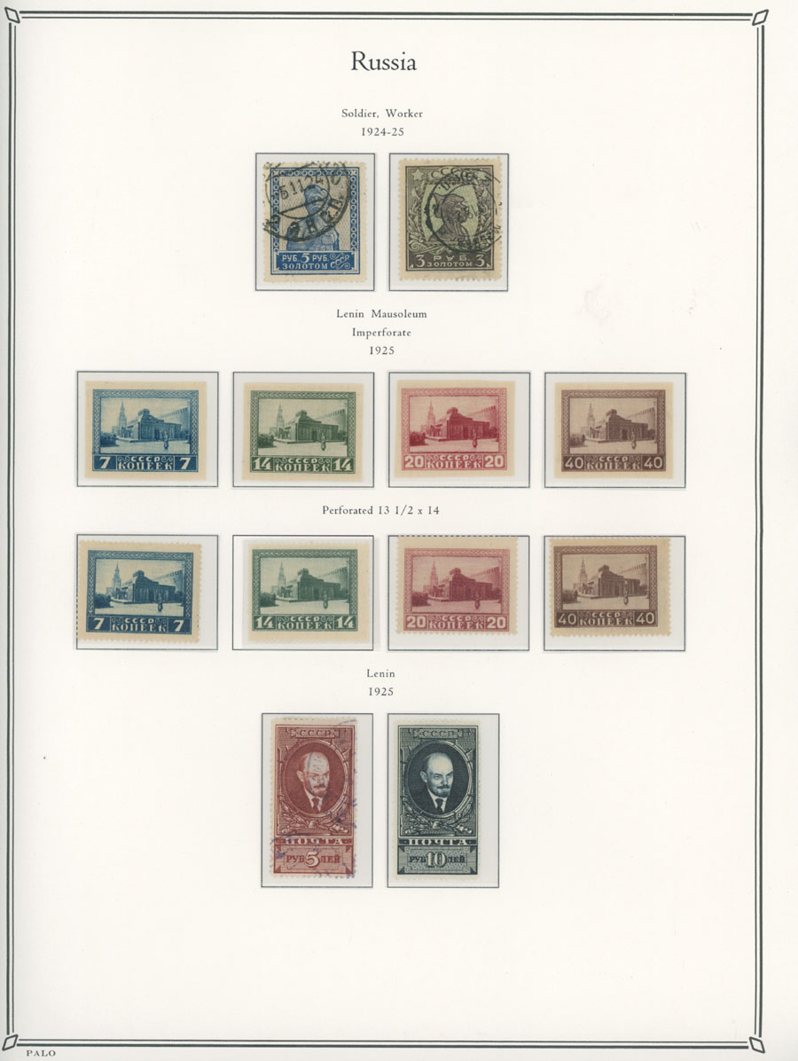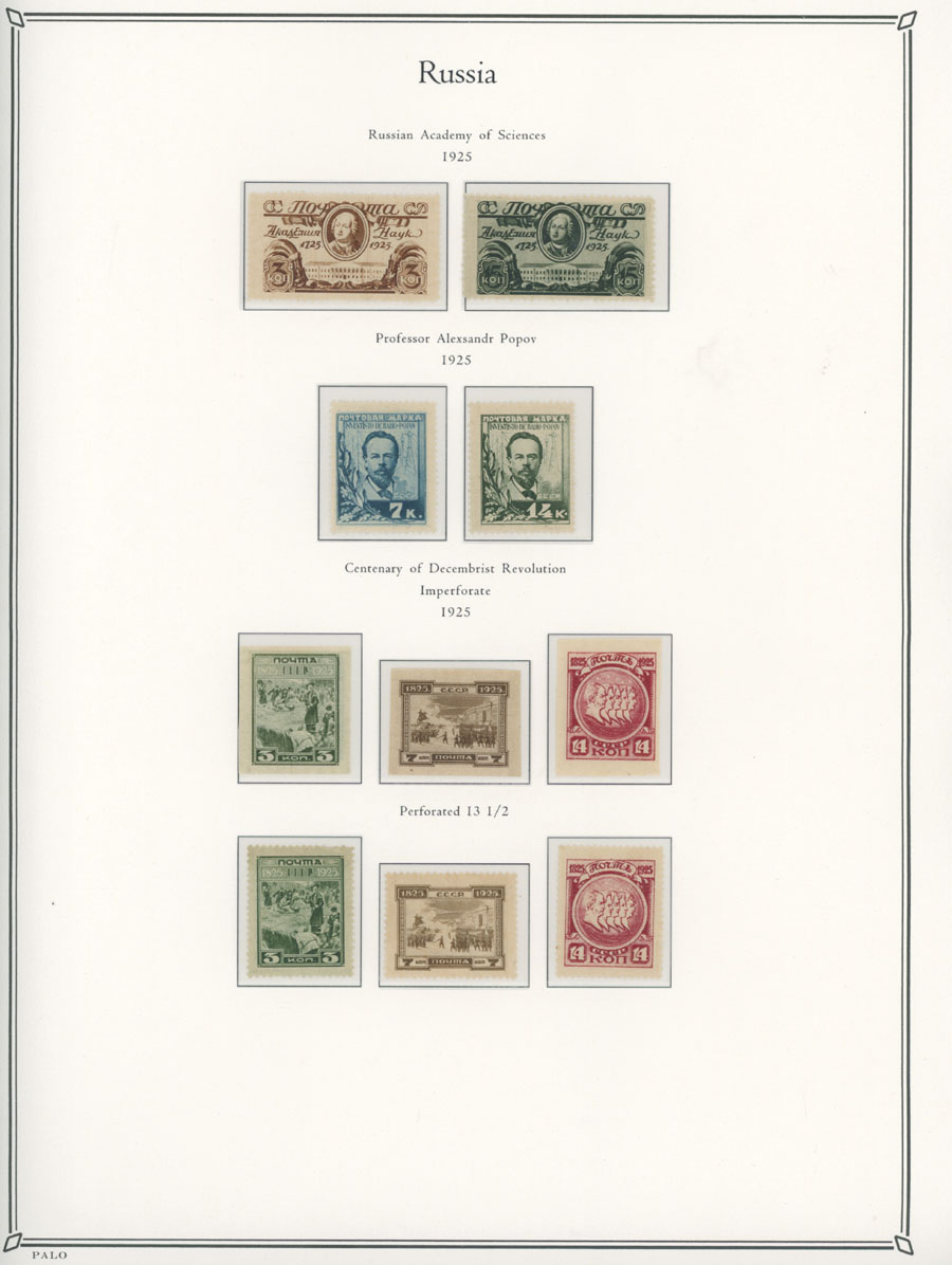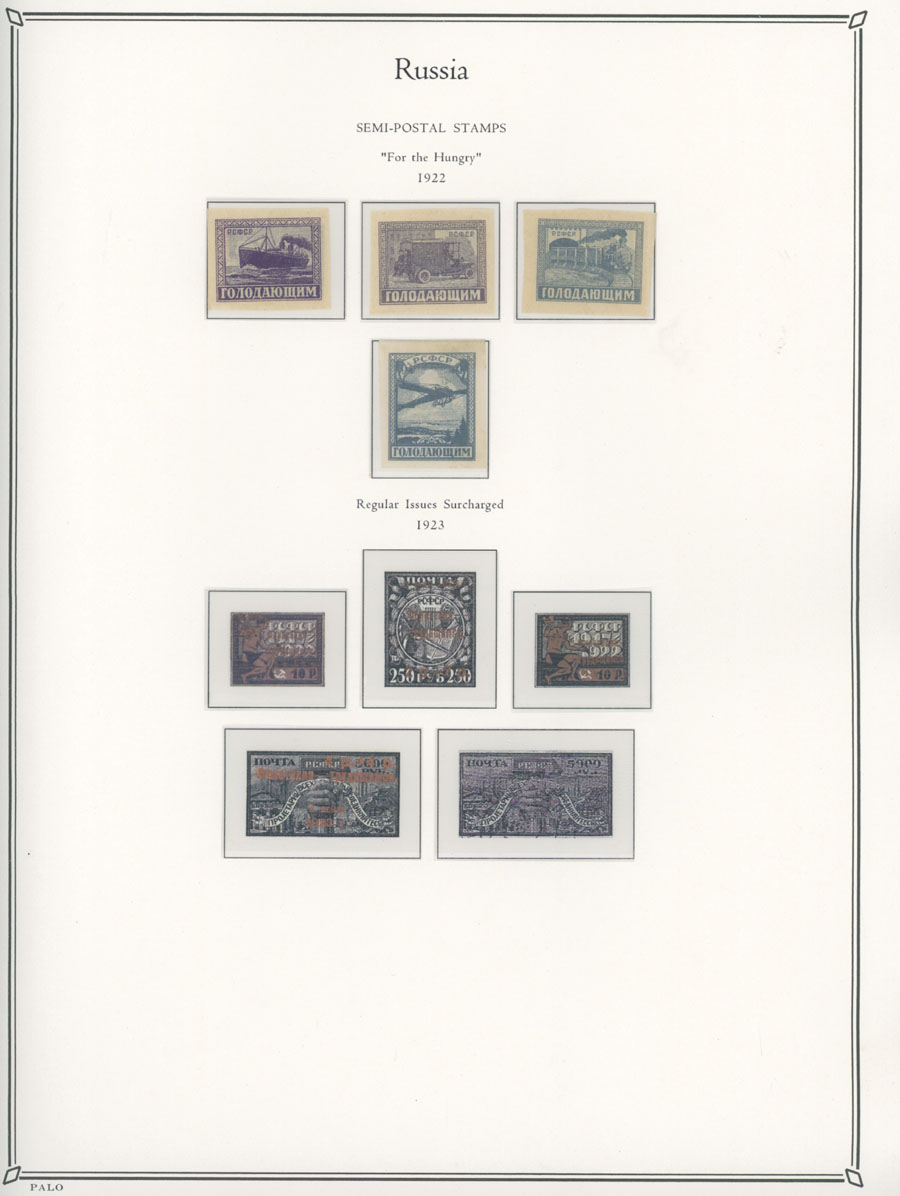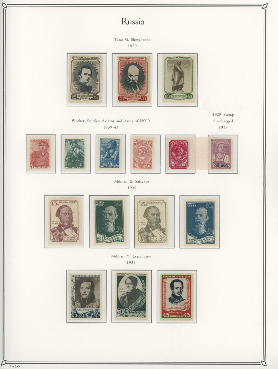 NEAT RSFSR AND SOVIET UNION PRE-WORLD WAR II COLLECTION ON ILLUSTRATED PAGES: 1918-40, several hundred mainly mint stamps (a few sets used – not counted), starting with complete early Soviet Russia unit (no varieties and No. #224), then the first definitive issue with typo imperf 50k (No.275A, no guarantee and not counted), nice range of two-three stamp sets of 1925-30, then apparently all valuable issues from 1930’s (Ethnographic set – CTO, others – mint), continues with practically complete 1936-40 (colored Agriculture Exhibition – CTO, others mint, some – never hinged), in addition semi-postals and dues (air post – offered separately), nice quality unit, full/part of OG, mainly LH/hinged, F/VF, C.v. is close to $9,000, Est. $2,500-$3,000, Scott #149/816A, B1/56