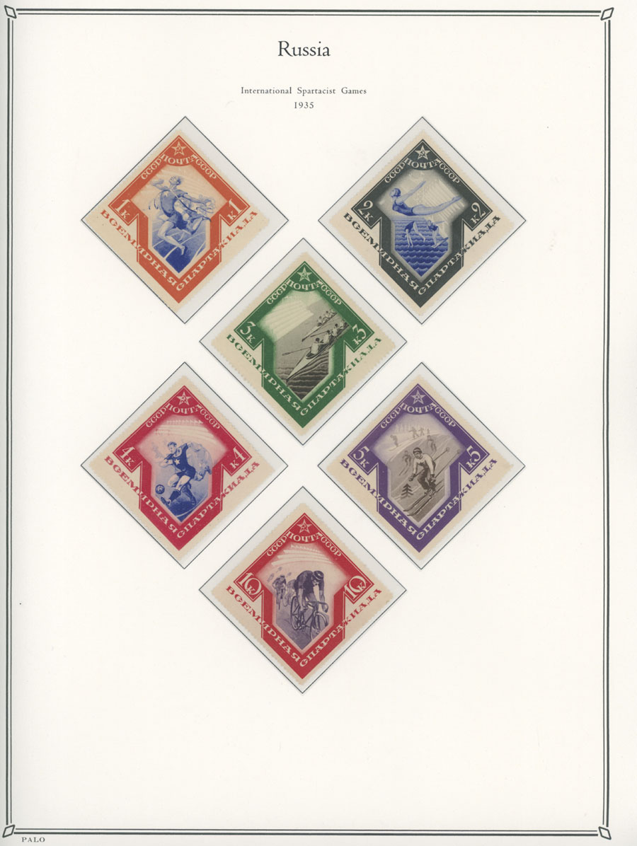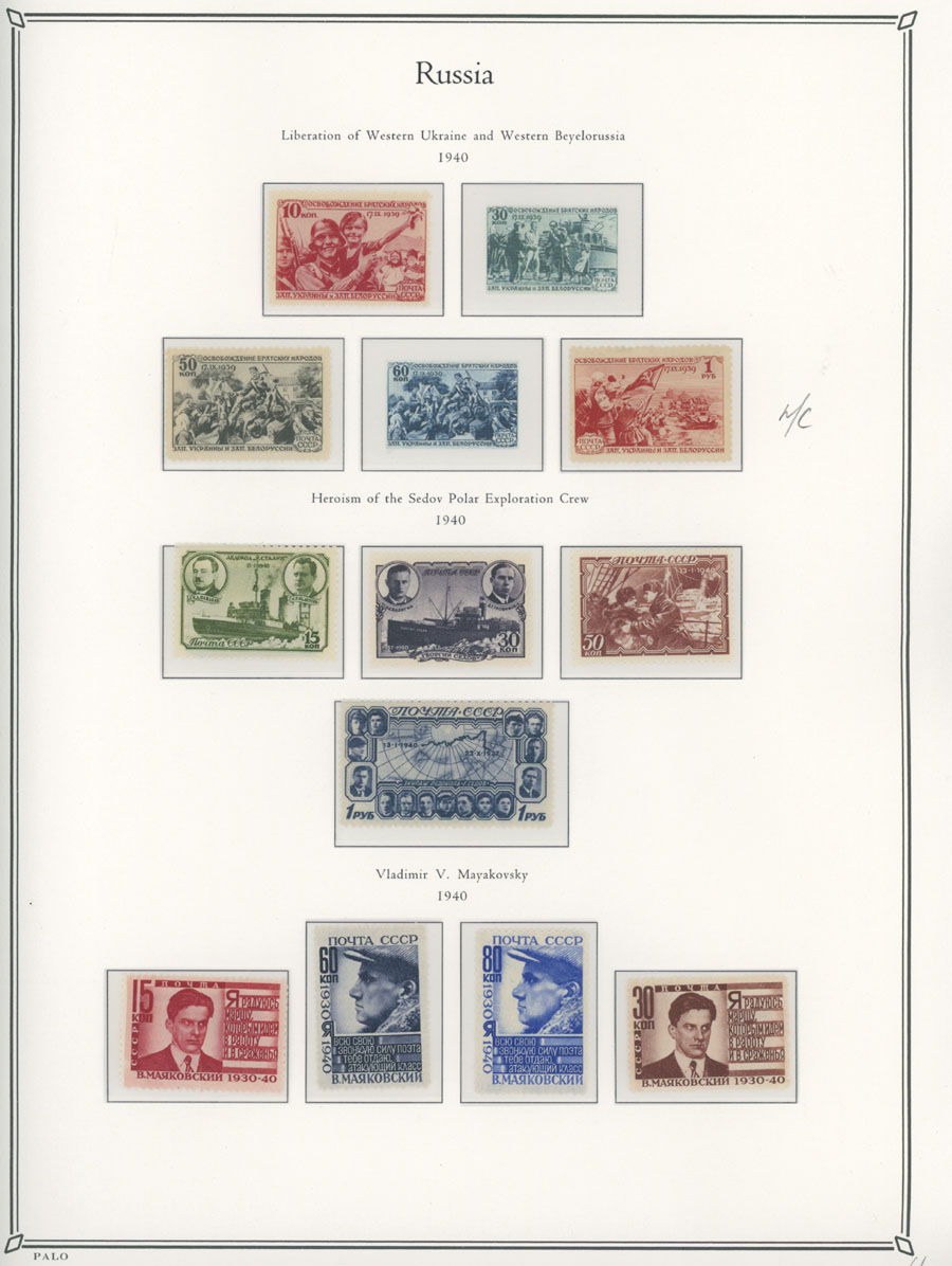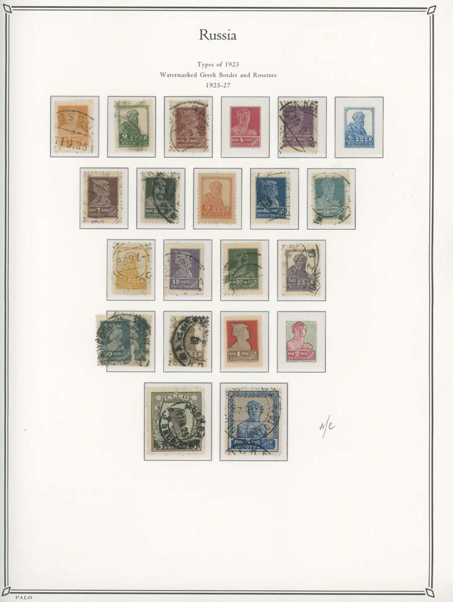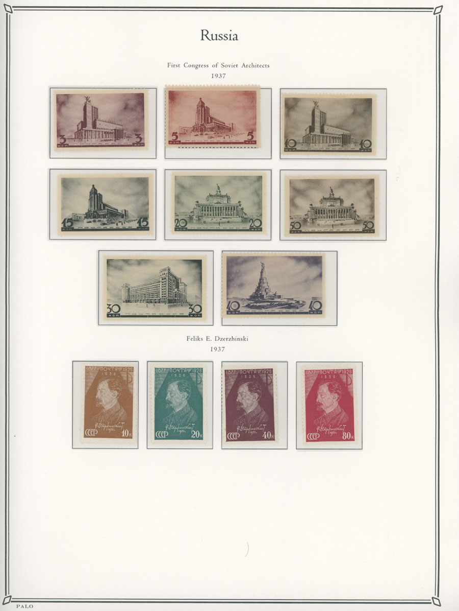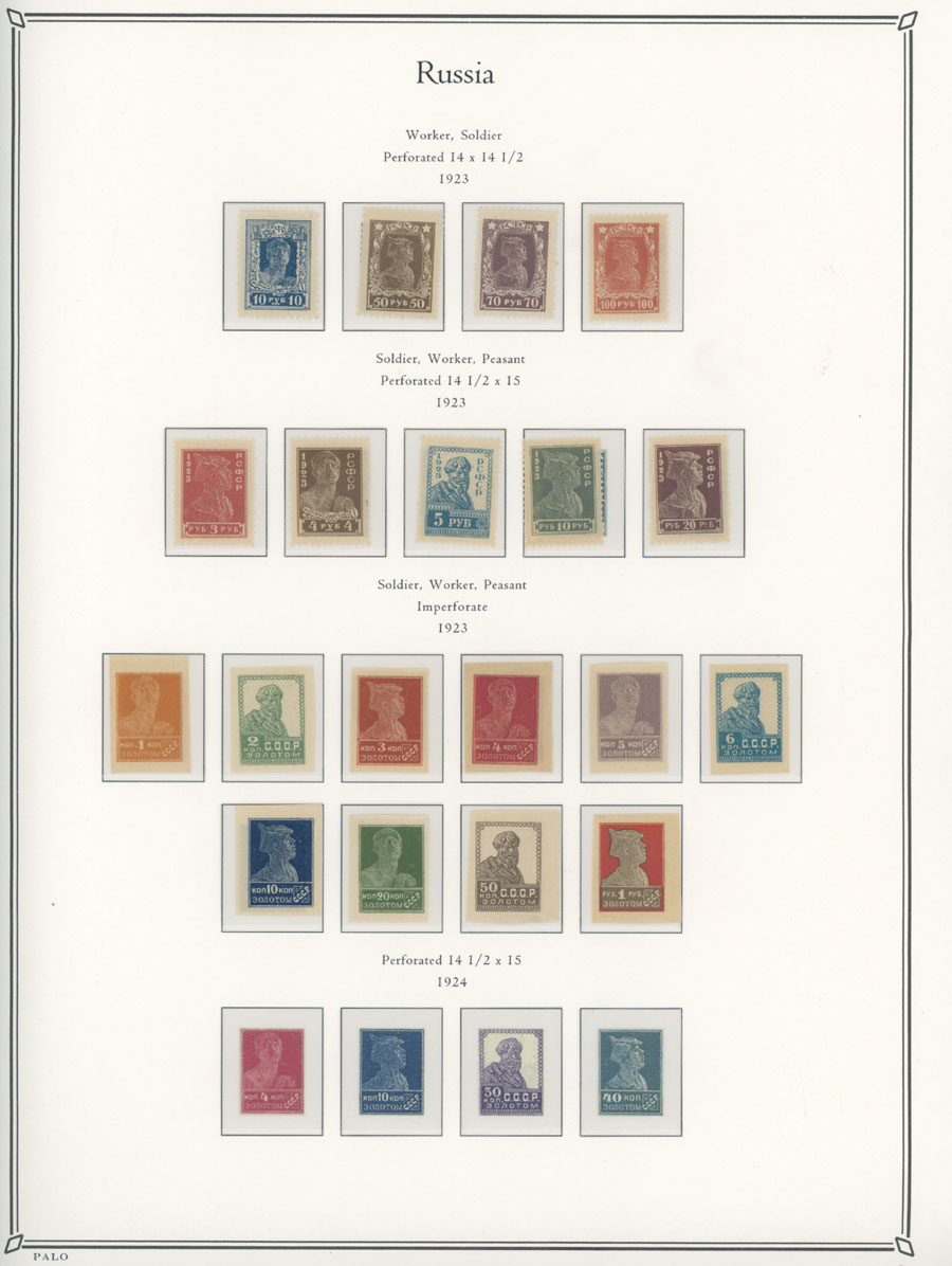 NEAT RSFSR AND SOVIET UNION PRE-WORLD WAR II COLLECTION ON ILLUSTRATED PAGES: 1918-40, several hundred mainly mint stamps (a few sets used – not counted), starting with complete early Soviet Russia unit (no varieties and No. #224), then the first definitive issue with typo imperf 50k (No.275A, no guarantee and not counted), nice range of two-three stamp sets of 1925-30, then apparently all valuable issues from 1930’s (Ethnographic set – CTO, others – mint), continues with practically complete 1936-40 (colored Agriculture Exhibition – CTO, others mint, some – never hinged), in addition semi-postals and dues (air post – offered separately), nice quality unit, full/part of OG, mainly LH/hinged, F/VF, C.v. is close to $9,000, Est. $2,500-$3,000, Scott #149/816A, B1/56