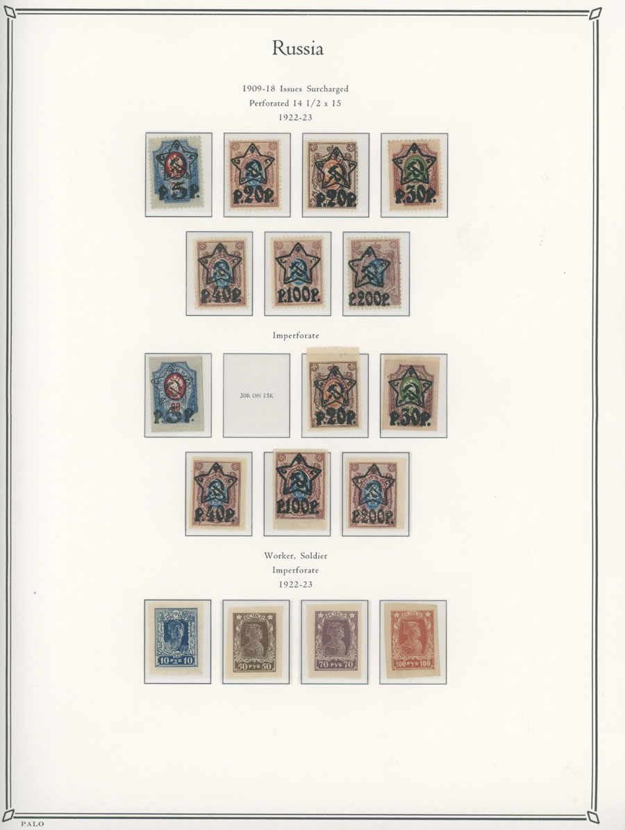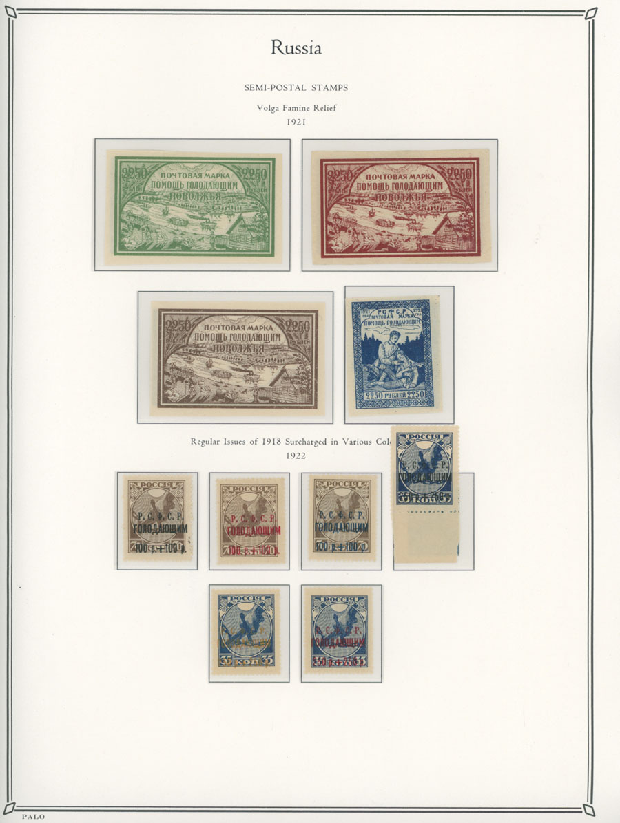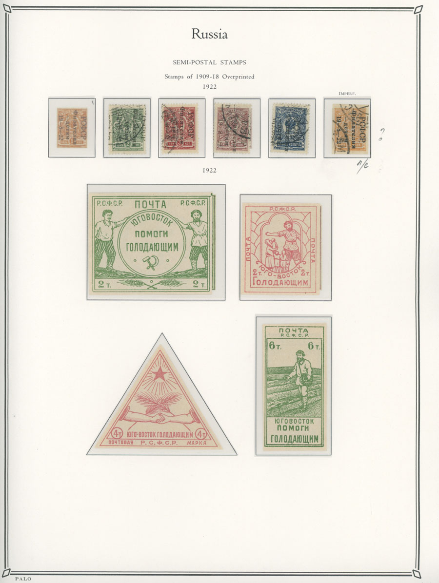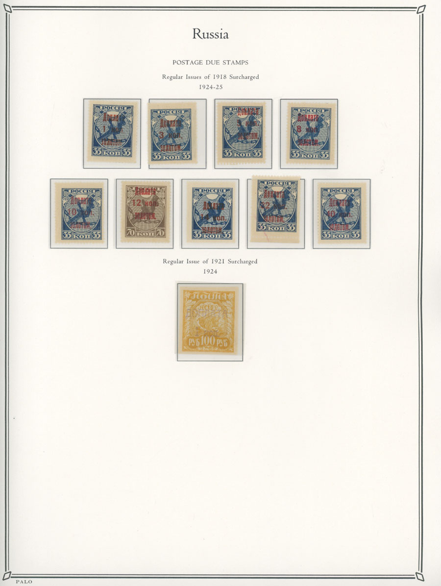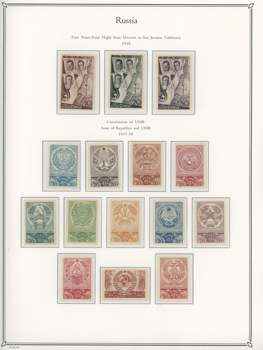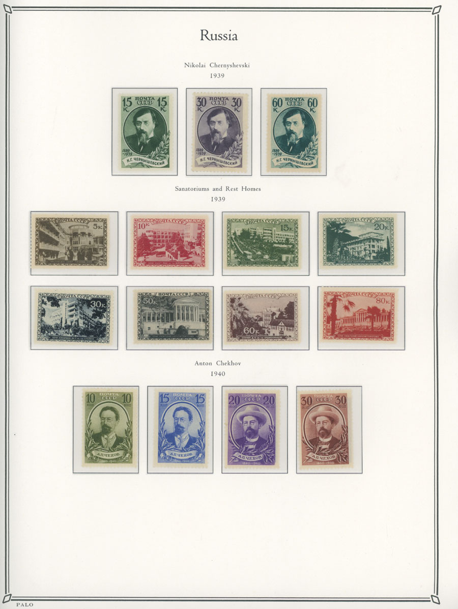NEAT RSFSR AND SOVIET UNION PRE-WORLD WAR II COLLECTION ON ILLUSTRATED PAGES: 1918-40, several hundred mainly mint stamps (a few sets used – not counted), starting with complete early Soviet Russia unit (no varieties and No. #224), then the first definitive issue with typo imperf 50k (No.275A, no guarantee and not counted), nice range of two-three stamp sets of 1925-30, then apparently all valuable issues from 1930’s (Ethnographic set – CTO, others – mint), continues with practically complete 1936-40 (colored Agriculture Exhibition – CTO, others mint, some – never hinged), in addition semi-postals and dues (air post – offered separately), nice quality unit, full/part of OG, mainly LH/hinged, F/VF, C.v. is close to $9,000, Est. $2,500-$3,000, Scott #149/816A, B1/56