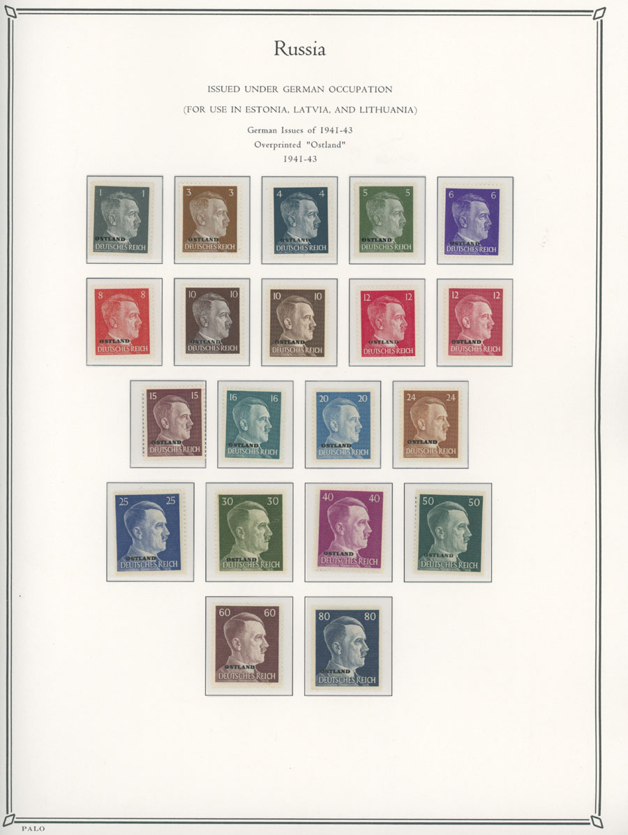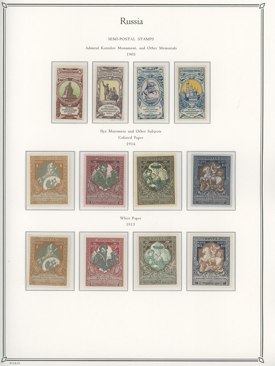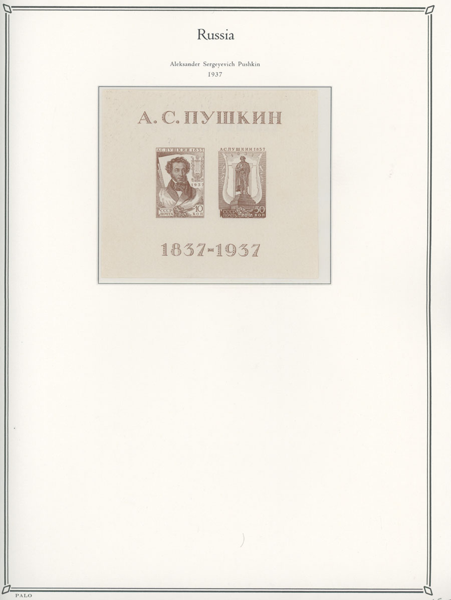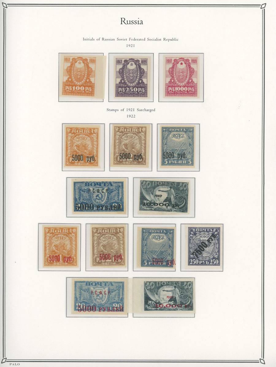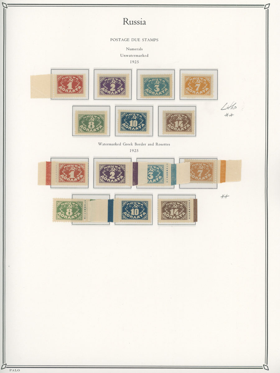 NEAT RSFSR AND SOVIET UNION PRE-WORLD WAR II COLLECTION ON ILLUSTRATED PAGES: 1918-40, several hundred mainly mint stamps (a few sets used – not counted), starting with complete early Soviet Russia unit (no varieties and No. #224), then the first definitive issue with typo imperf 50k (No.275A, no guarantee and not counted), nice range of two-three stamp sets of 1925-30, then apparently all valuable issues from 1930’s (Ethnographic set – CTO, others – mint), continues with practically complete 1936-40 (colored Agriculture Exhibition – CTO, others mint, some – never hinged), in addition semi-postals and dues (air post – offered separately), nice quality unit, full/part of OG, mainly LH/hinged, F/VF, C.v. is close to $9,000, Est. $2,500-$3,000, Scott #149/816A, B1/56