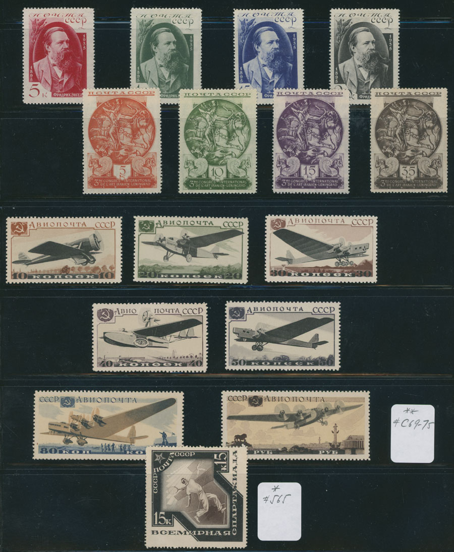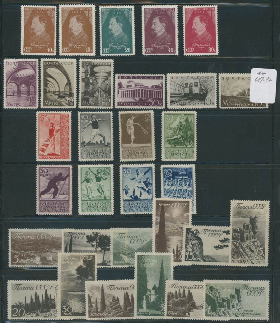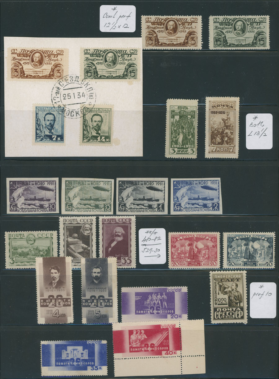 CLEAN SELECTION: 1925-38, 83 stamps and 7 Pushkin souvenir sheets, representing 18 different issues, including perf varieties on Academy of Sciences, Revolution of 1905, Pioneers of 1931, “key” stamp of Moscow Spartakiad, complete sets of Ice-Breaker ”Malygin”, K. Marx, Baku Commissars, Fedorov, F. Engels, Iranian Arts, Pushkin perf varieties and etc., fresh quality overall, several stamps regummed, generally full/part of OG, F/VF, Scott #326/92, Est. $1,500-$1,800, Scott #326/692