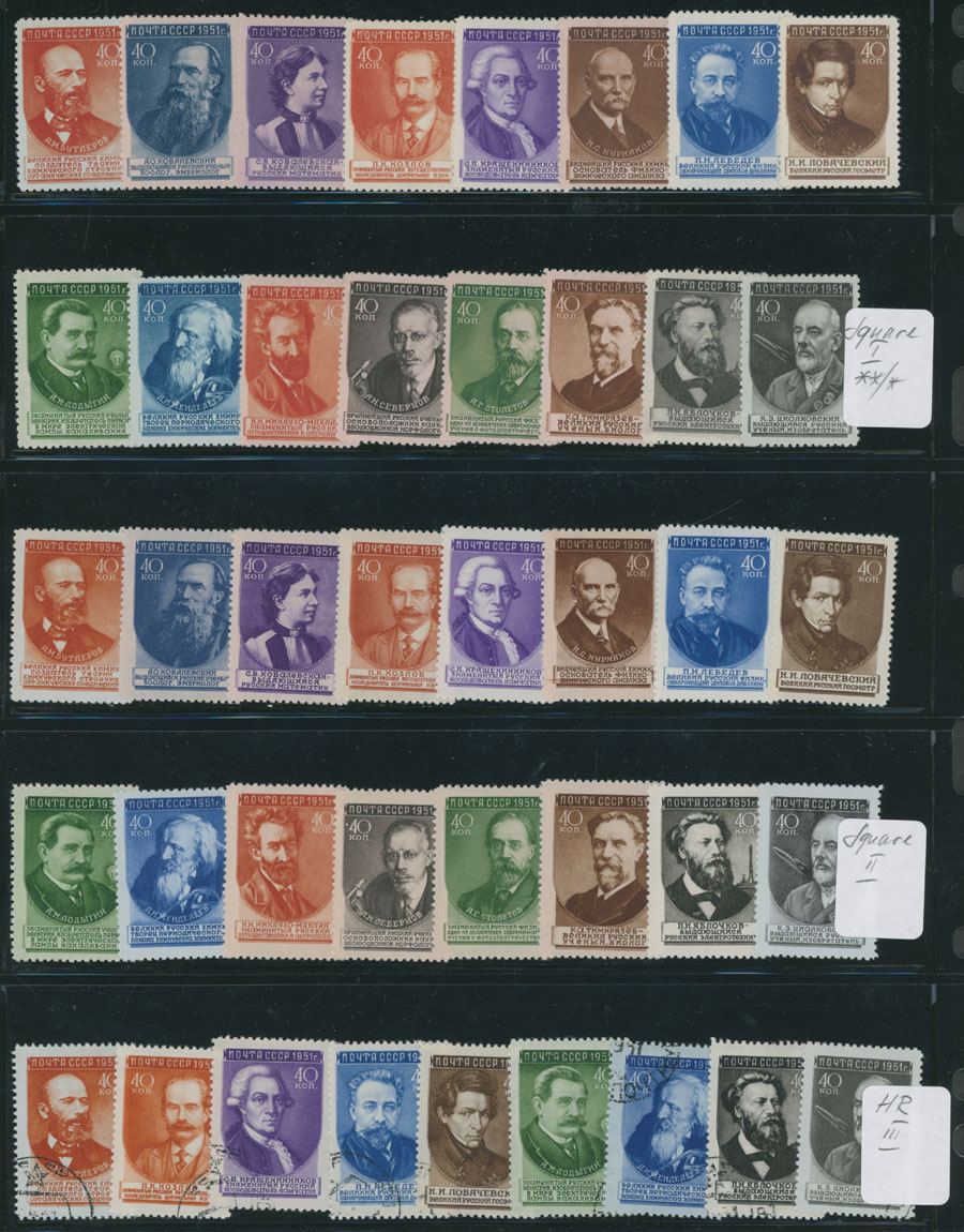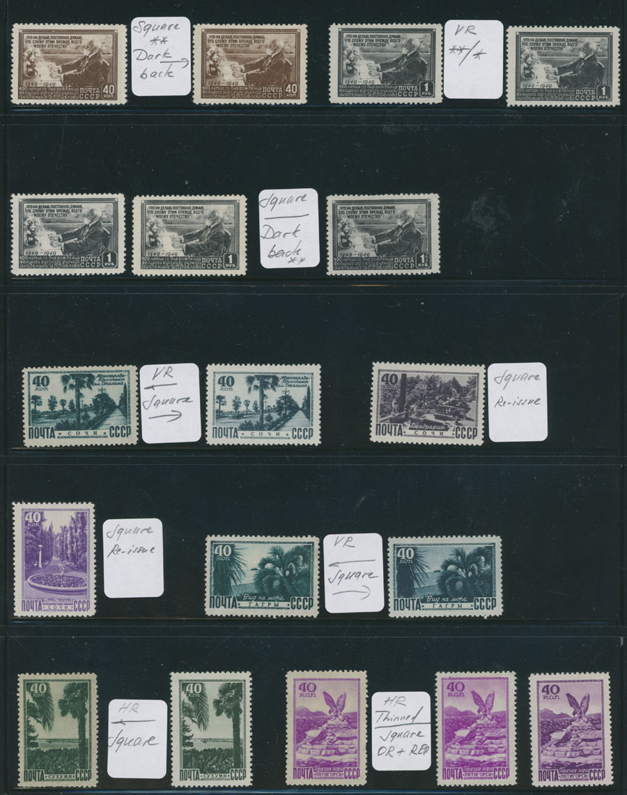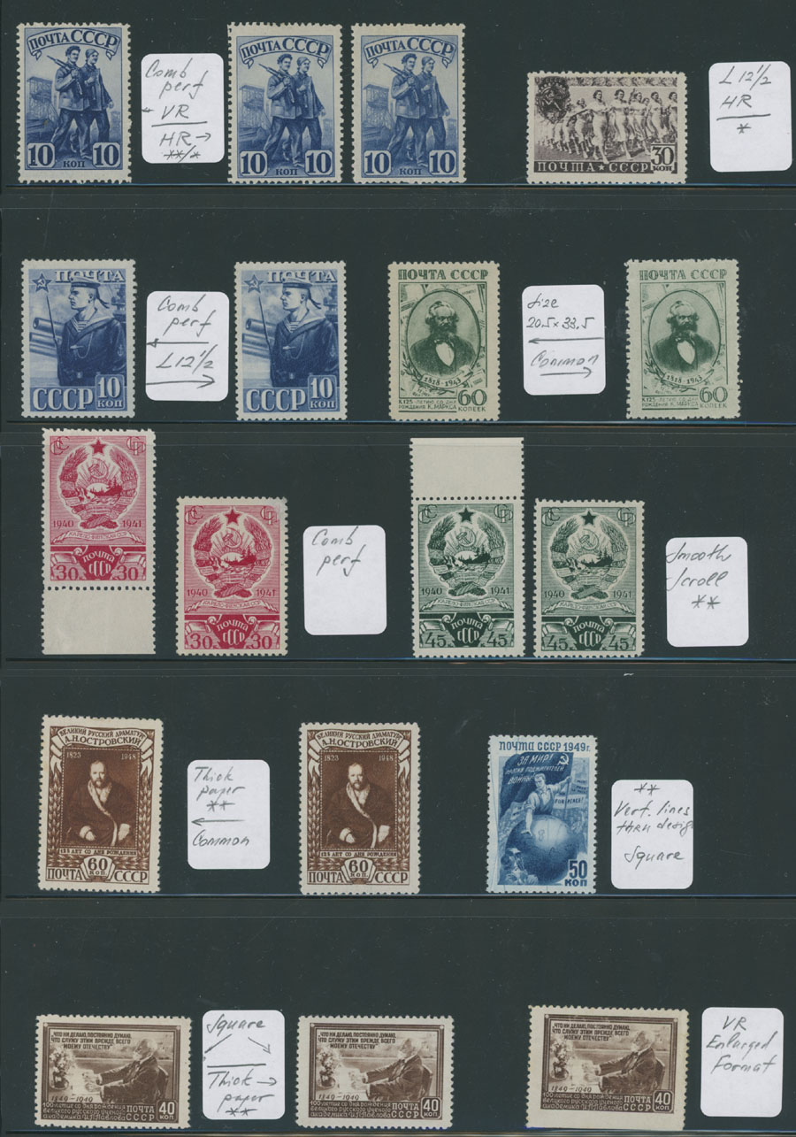 NICE GROUP OF PERFORATION AND PRINTING ERRORS: 1940-51, about 80 mostly mint stamps, starting with Sports Parade 30k dark brown with raster horizontal diamonds and perf L12½, then Karelo-Finnish Republic with comb perf (30k carmine, redistributed gum) and smooth scroll (45k, NH), Jubilee of Moscow souvenir sheet of type I, thick paper of Ostrovsky 60k of 1948, Russian Scientists, first issue and two re-issues, the last one CTO, fresh quality, mainly original gum, NH or hinged, F/VF, Est. $800-$1,000, Scott #785/1583
