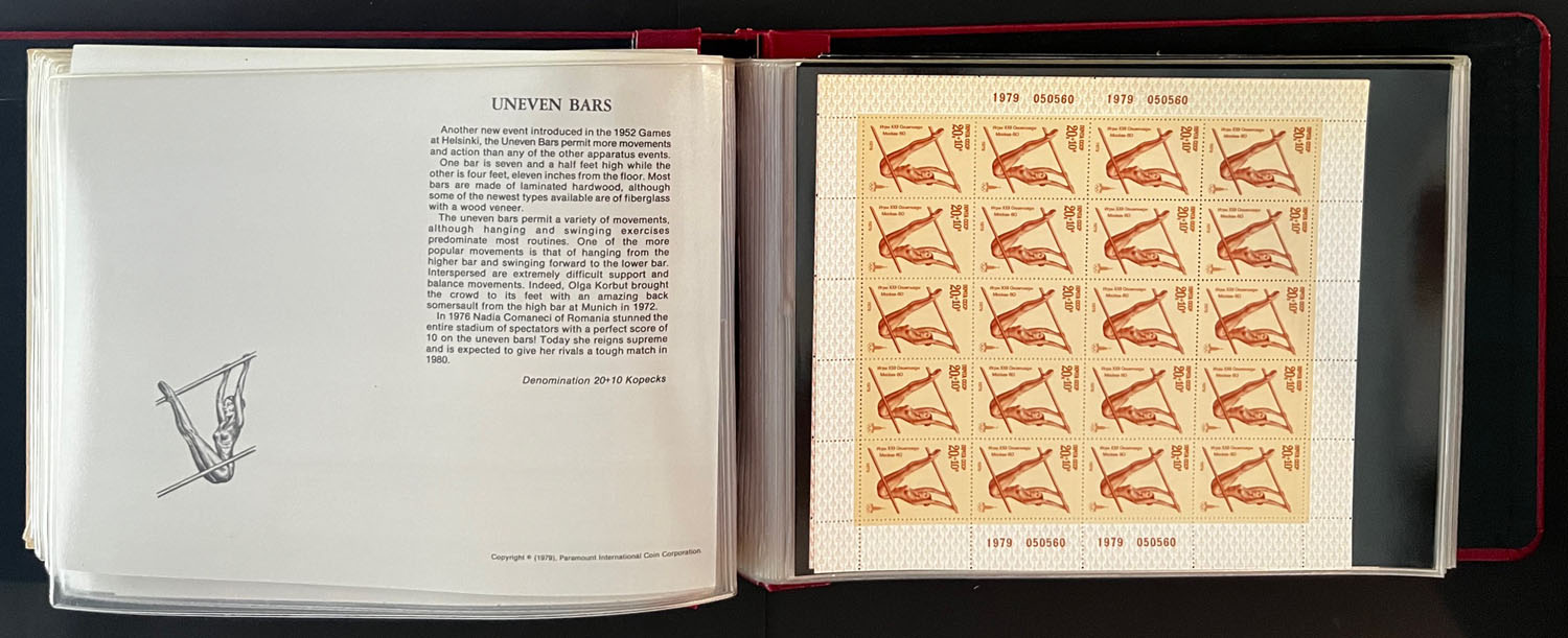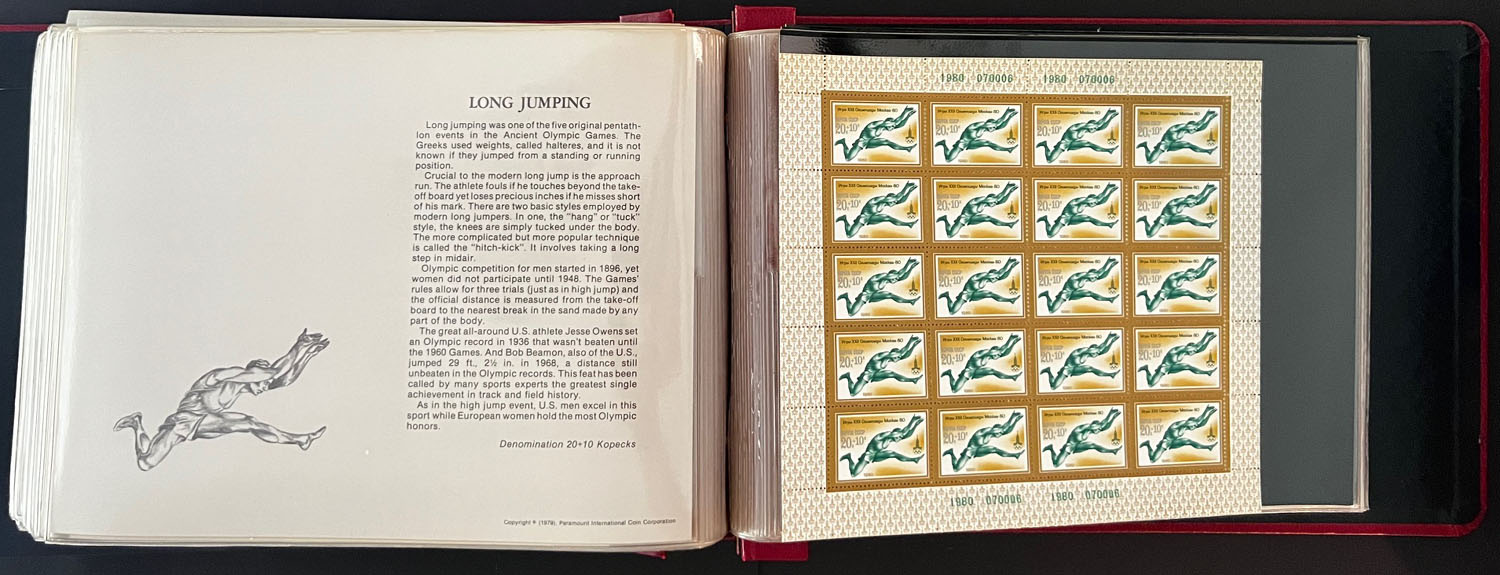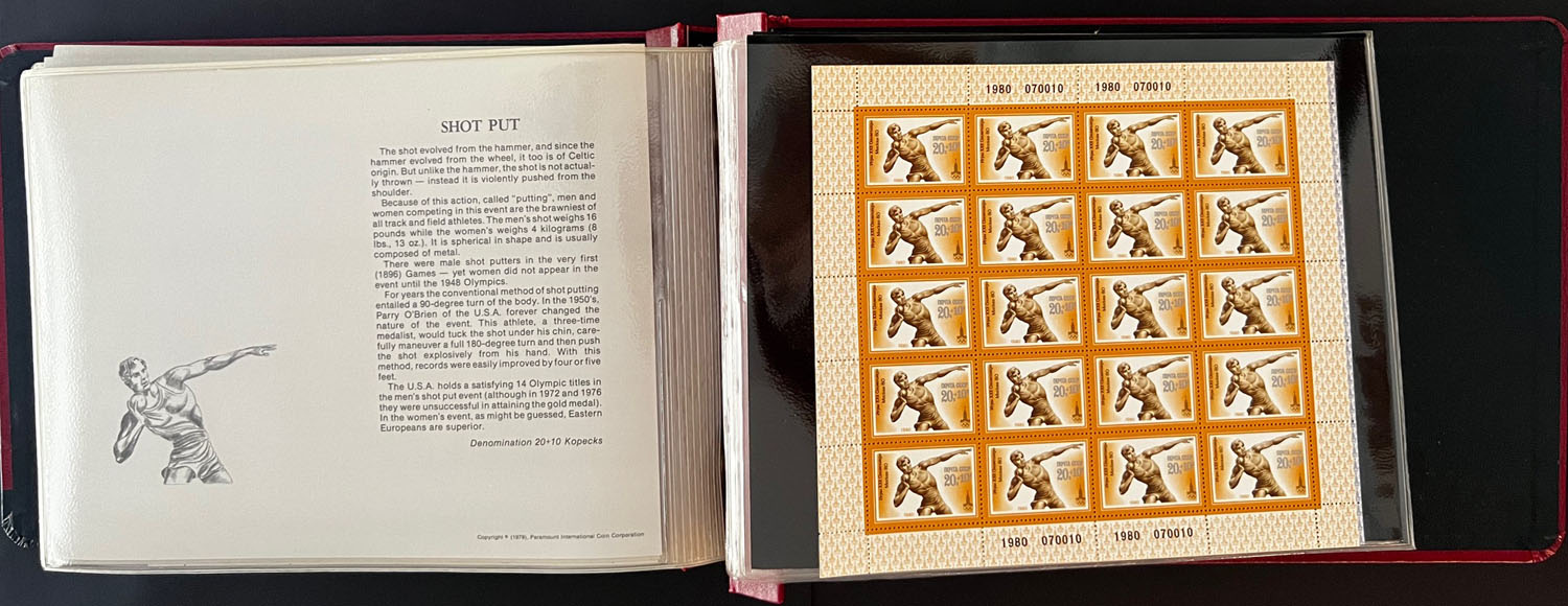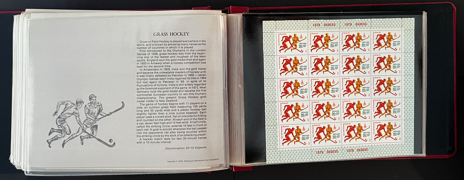 MOSCOW OLYMPIC GAMES – SOUVENIR ALBUM OF SPORTS ISSUES: 1977-80, complete unit of 40 miniature sheets of 20, representing eight complete issues, arranged in plastic sleeves of specially produced album with detailed description for each sheet, full OG, NH, VF, Est. $200-$250, Scott #B62/105