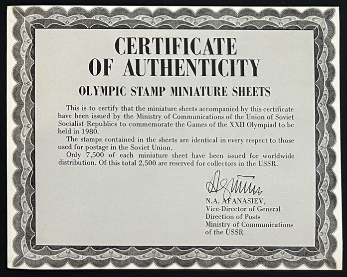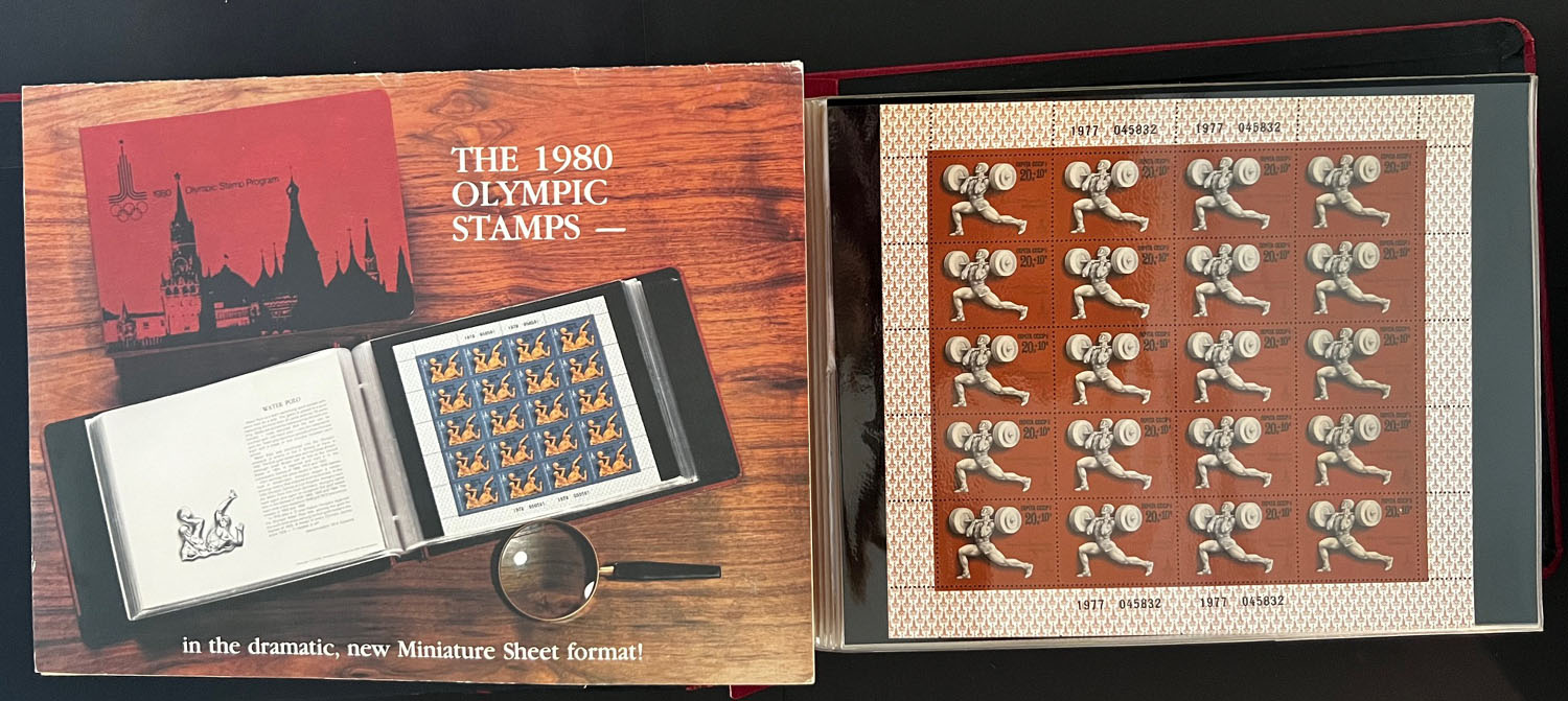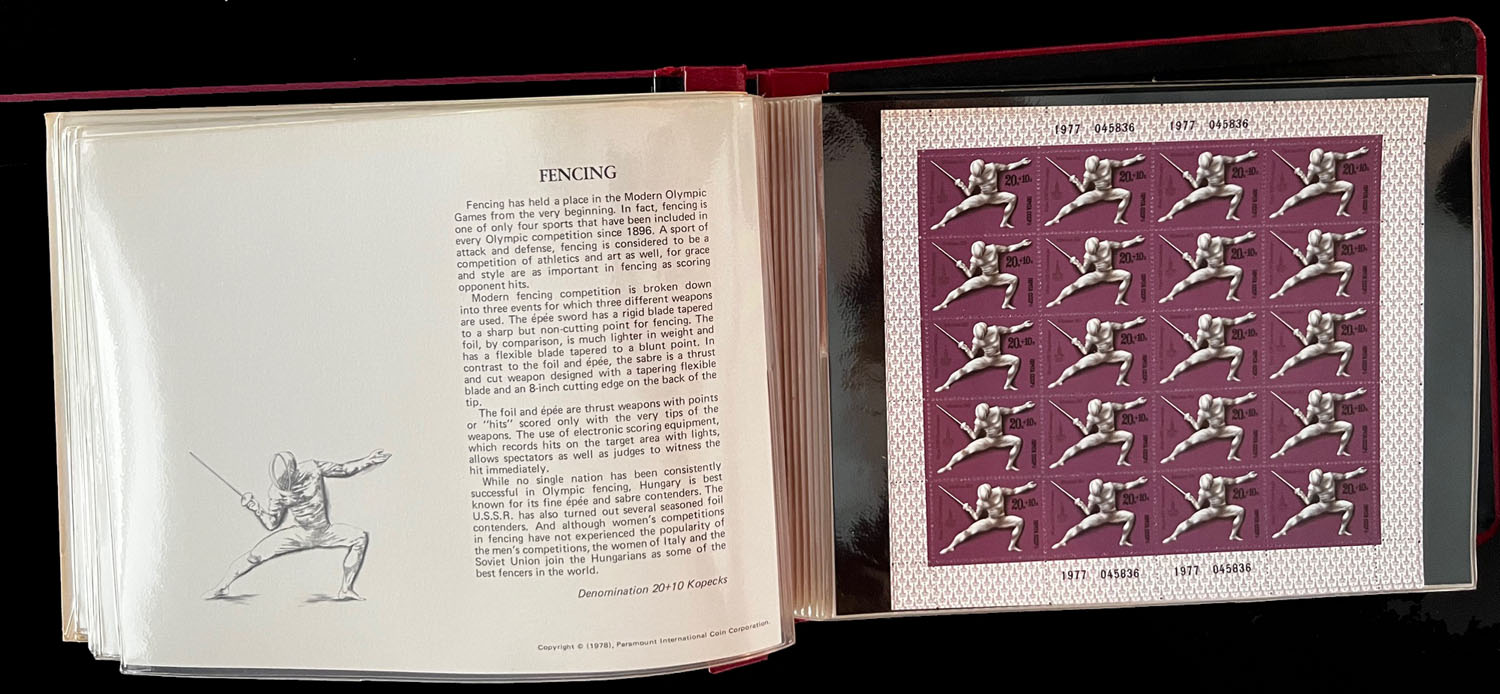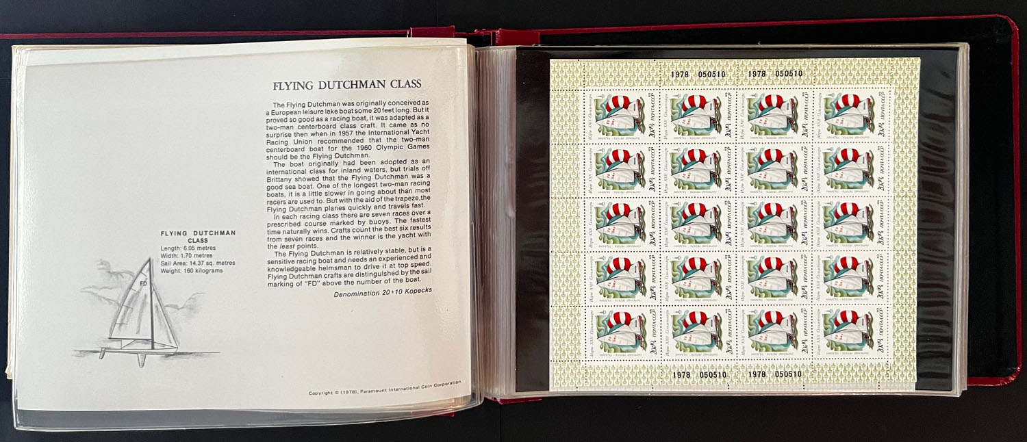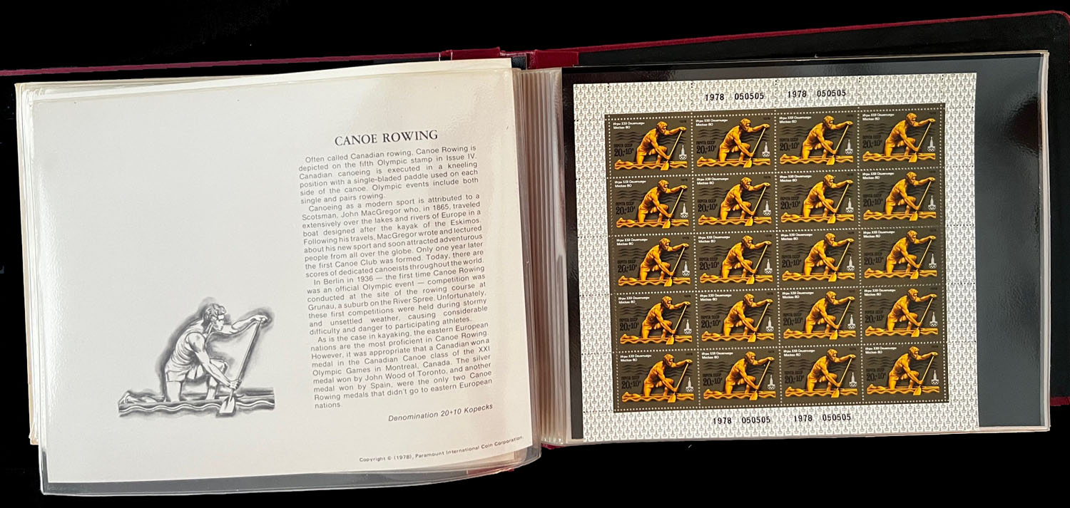 MOSCOW OLYMPIC GAMES – SOUVENIR ALBUM OF SPORTS ISSUES: 1977-80, complete unit of 40 miniature sheets of 20, representing eight complete issues, arranged in plastic sleeves of specially produced album with detailed description for each sheet, full OG, NH, VF, Est. $200-$250, Scott #B62/105