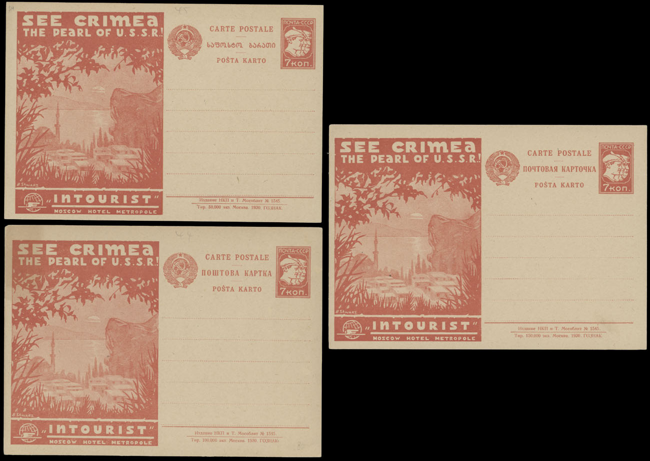1930, Intourist ”See Crimea”, three similar unused cards of 7k orange red, with top inscription in Russian, Ukrainian and Georgian, VF, Standard Cat (2002). #40-42, C.v. $150, Est. $200-#250