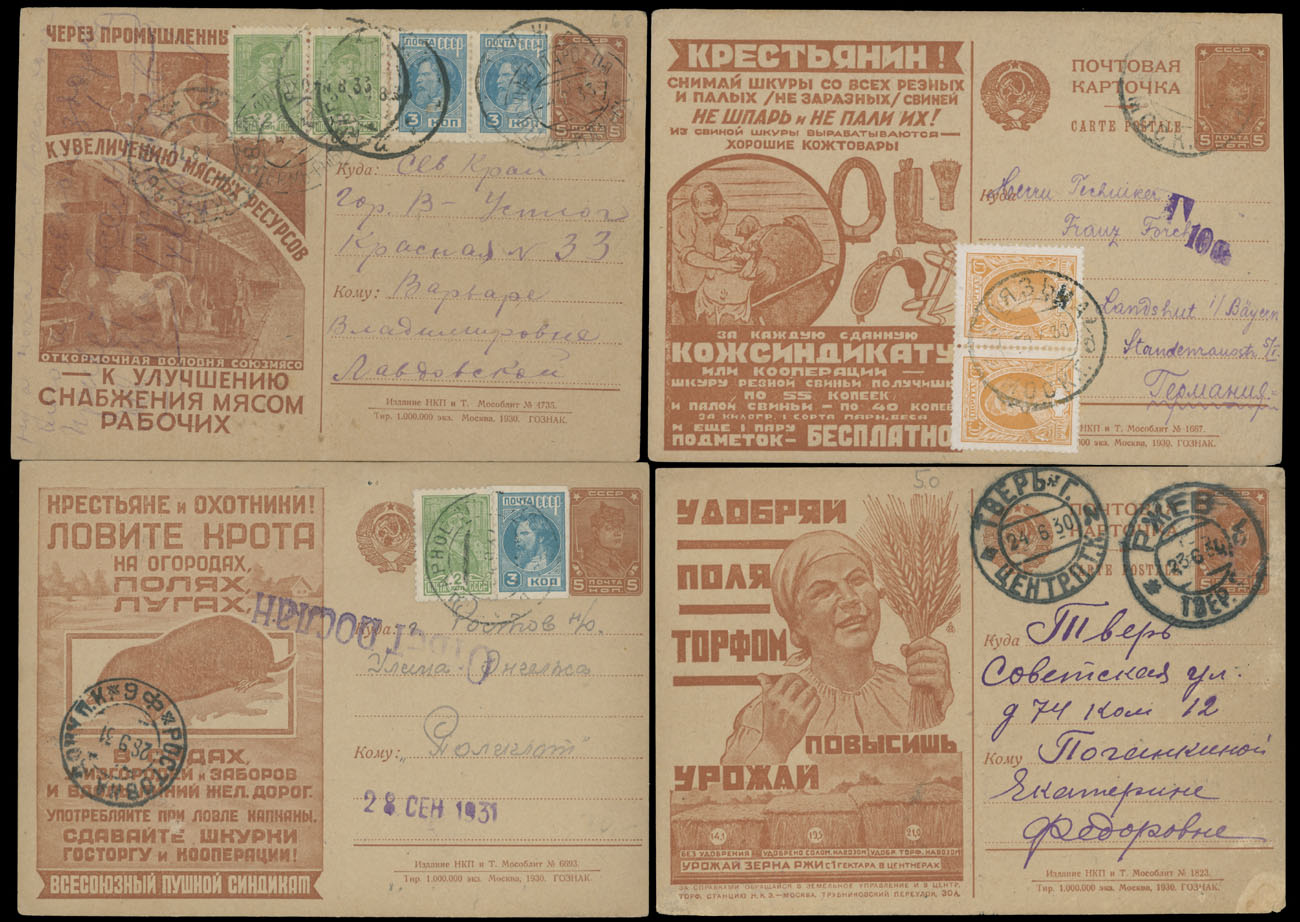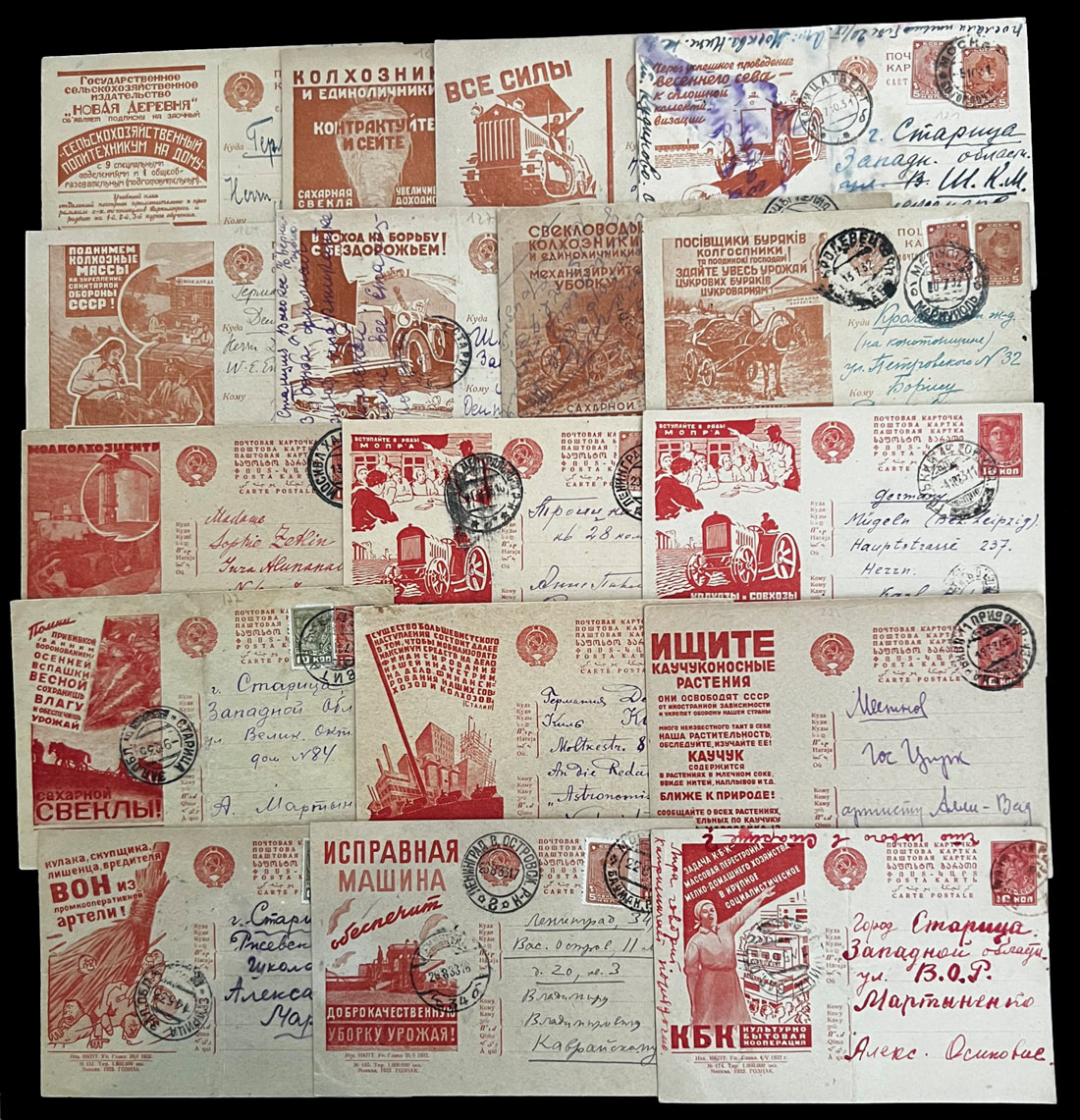 1930-32, 21 used postcards promoted Agriculture Development, 5k brown and 10k red, a few cards folded, several with filing punches, fine or better overall, Standard Cat (2002), #46/262, Est. $400-$500