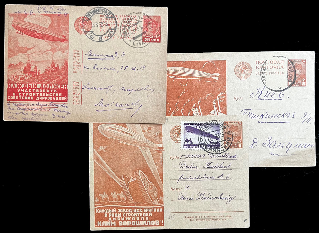 1931-32, six postcards picturing Zeppelin, 5k brown and 10k orange red, three unused (one has repaired 5mm tear) and three used (one has lost stamp during delivery), F/VF, Standard Cat (2002) #78/142, C.v. $145, Est. $200-$250
