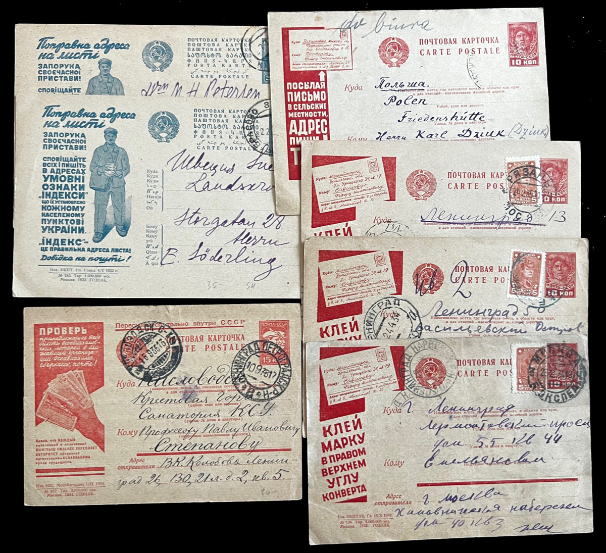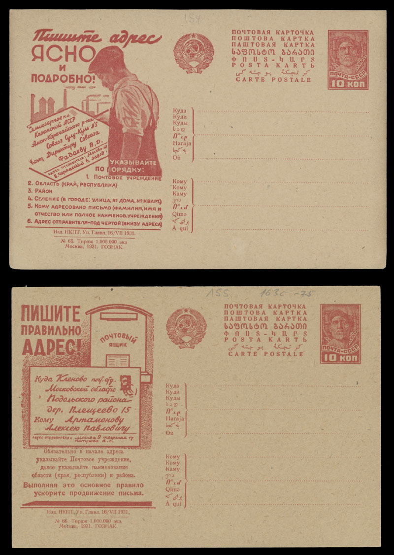 1931-34, Postal Advertising, nine postcards with denomination 10k orange red, 3k blue and 15k red, two unused and seven used (just minor conveyance flaws), F/VF, Standard Cat (2002) #151/304, Est. $250-$300