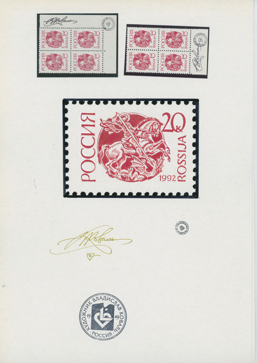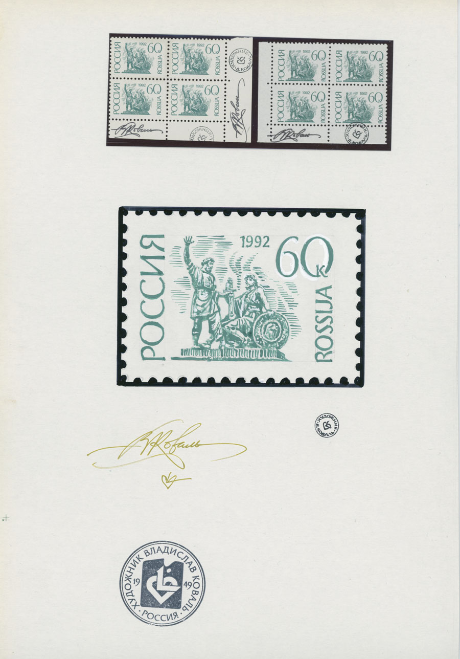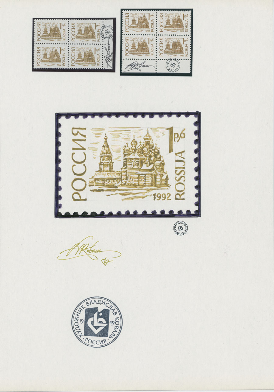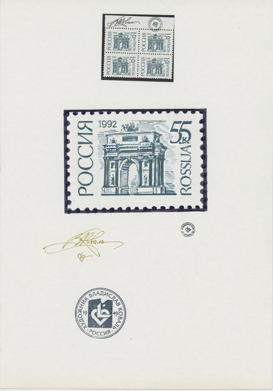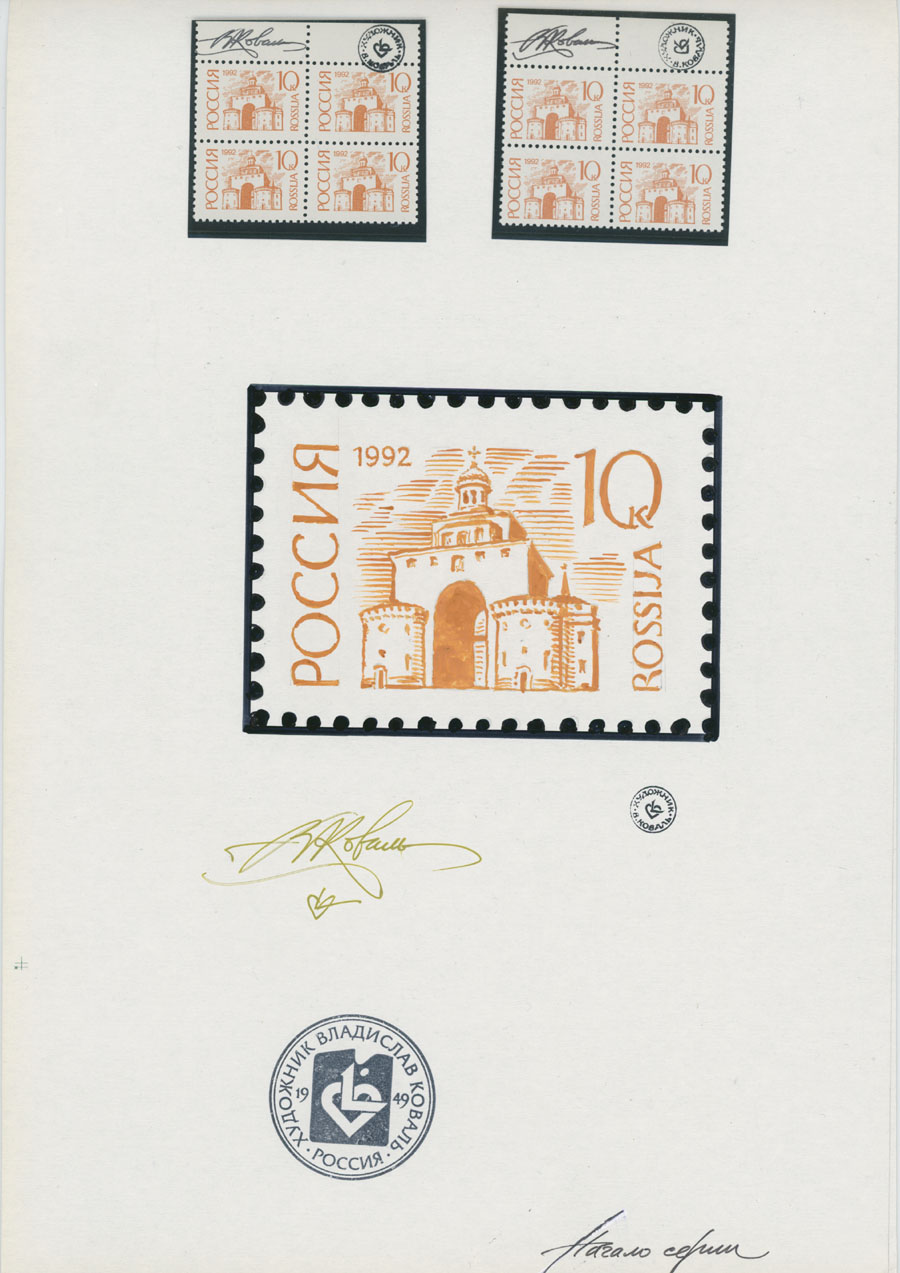 ORIGINAL ESSAYS OF THE FIRST RUSSIAN FEDERATION DEFINITIVE ISSUE BY ARTIST VLADISLAV KOVAL: 1992-95, 10k-100r, complete set of 17 water-color essays, approximate size 110x80mm, neatly arranged on exhibition style pages along with issued stamps in blocks of four (two of each denomination), each page is bearing artist’s signature and facsimile, as well as two pages with artist’s projects of Russian Federation Definitive issue of 2018 (15 and 11 different values on each page), unique material in excellent condition, Est. $6,000-$7,000, Scott #6060-71A