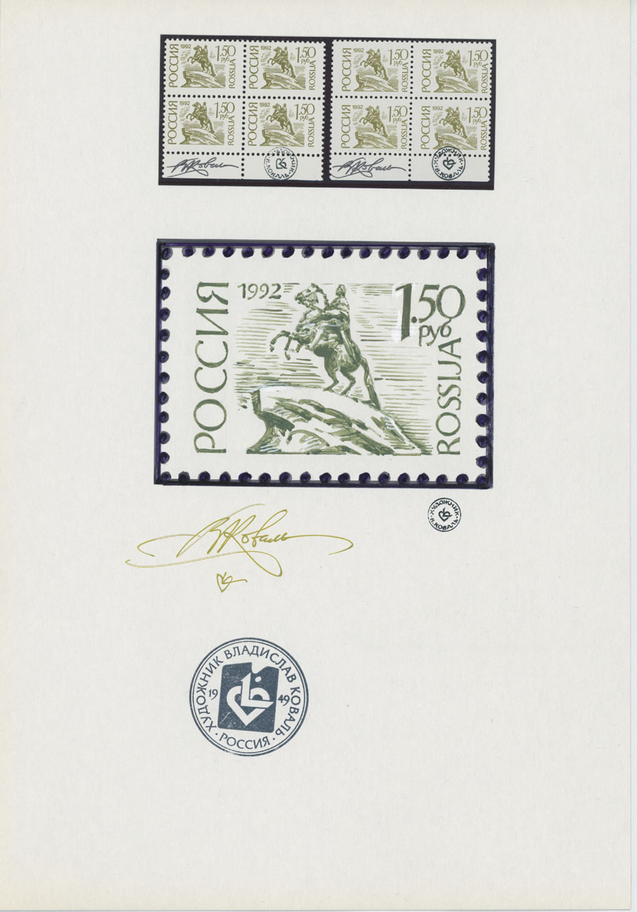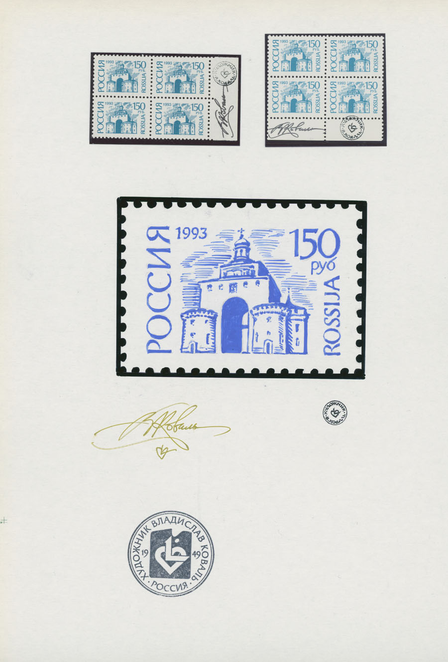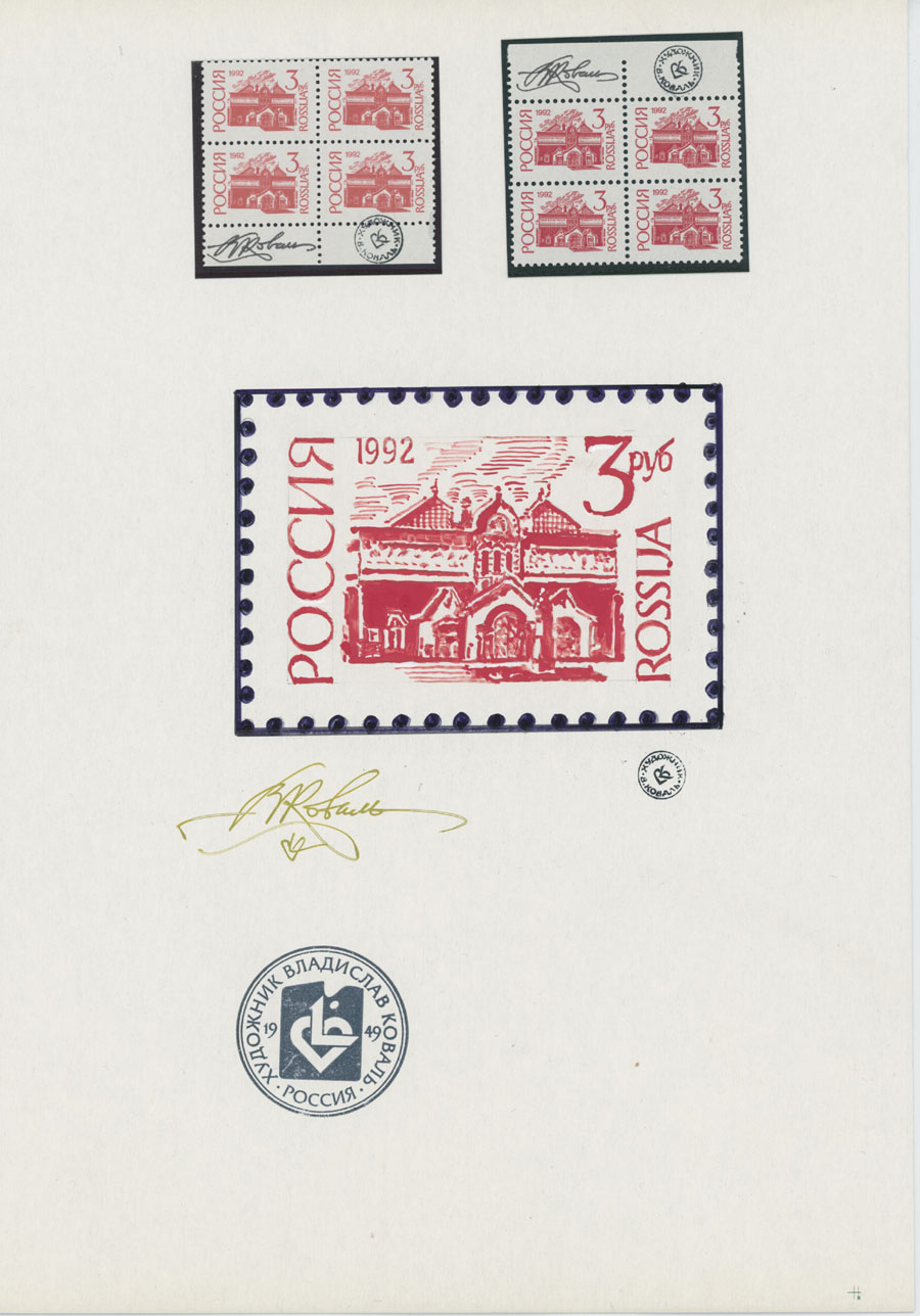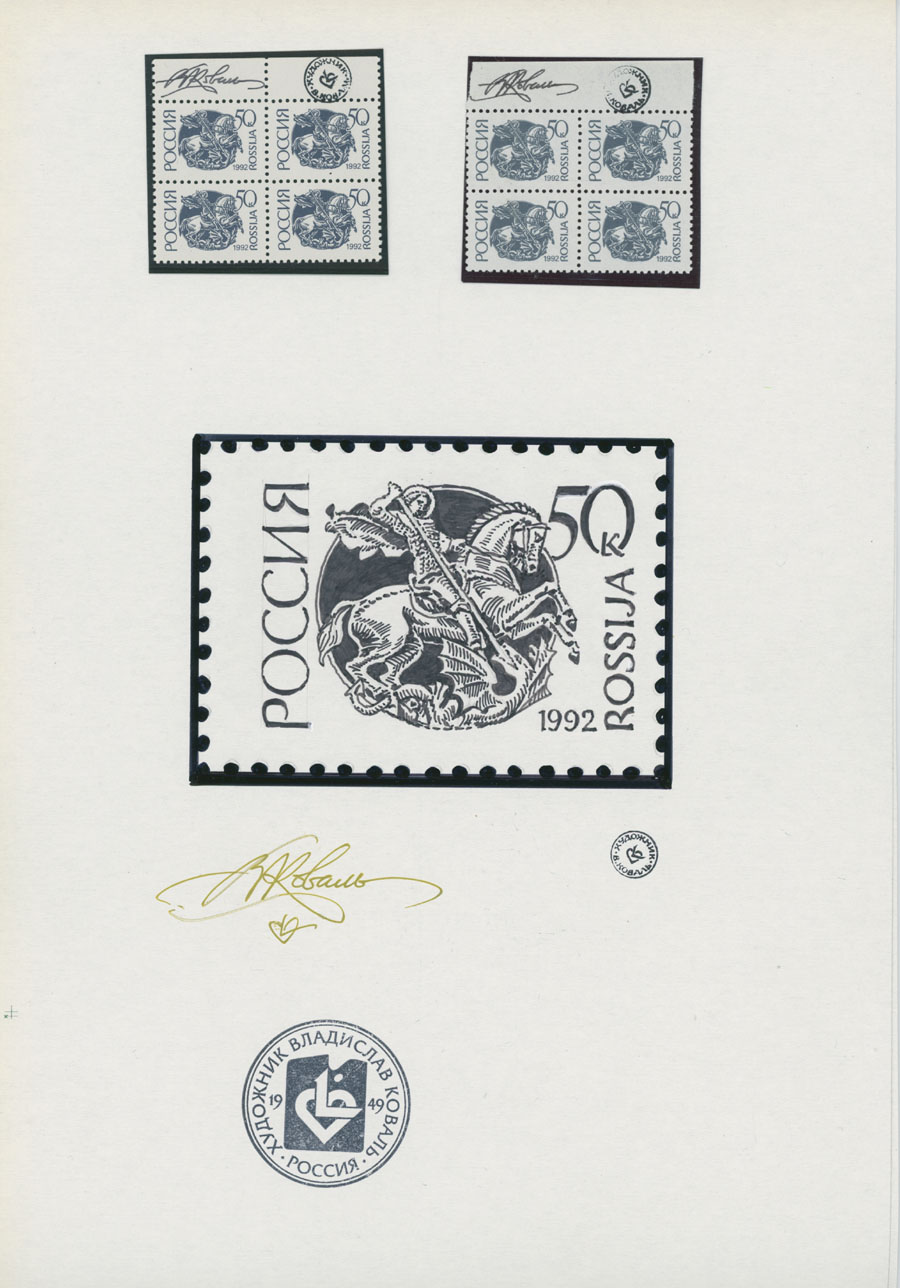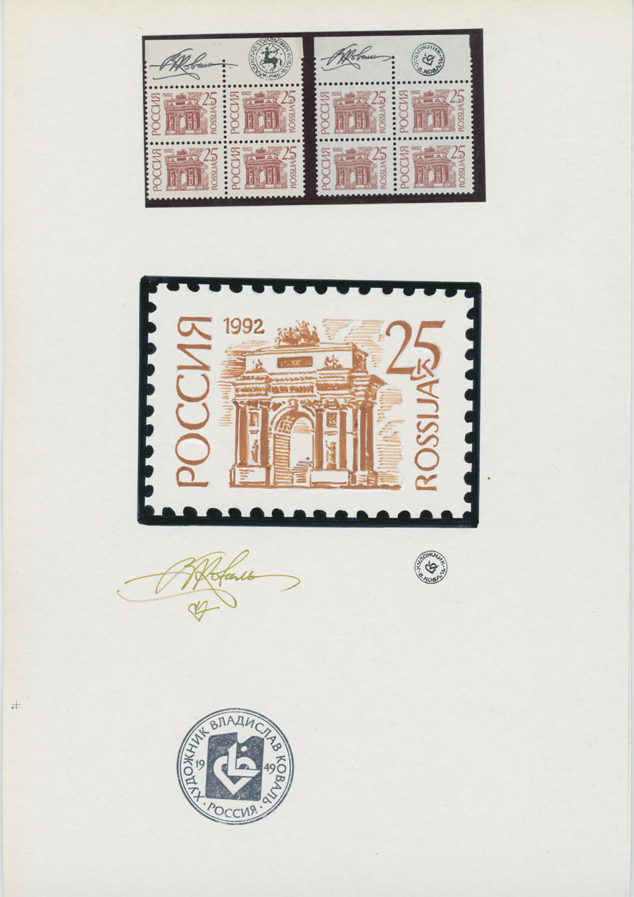 ORIGINAL ESSAYS OF THE FIRST RUSSIAN FEDERATION DEFINITIVE ISSUE BY ARTIST VLADISLAV KOVAL: 1992-95, 10k-100r, complete set of 17 water-color essays, approximate size 110x80mm, neatly arranged on exhibition style pages along with issued stamps in blocks of four (two of each denomination), each page is bearing artist’s signature and facsimile, as well as two pages with artist’s projects of Russian Federation Definitive issue of 2018 (15 and 11 different values on each page), unique material in excellent condition, Est. $6,000-$7,000, Scott #6060-71A