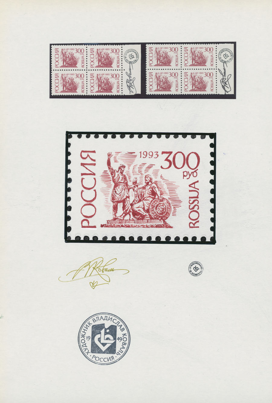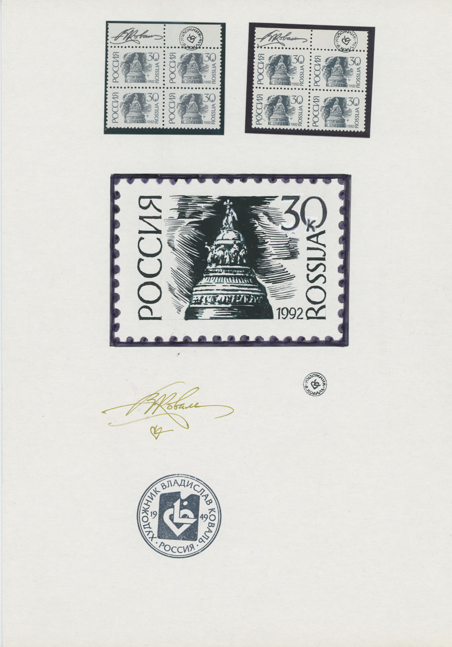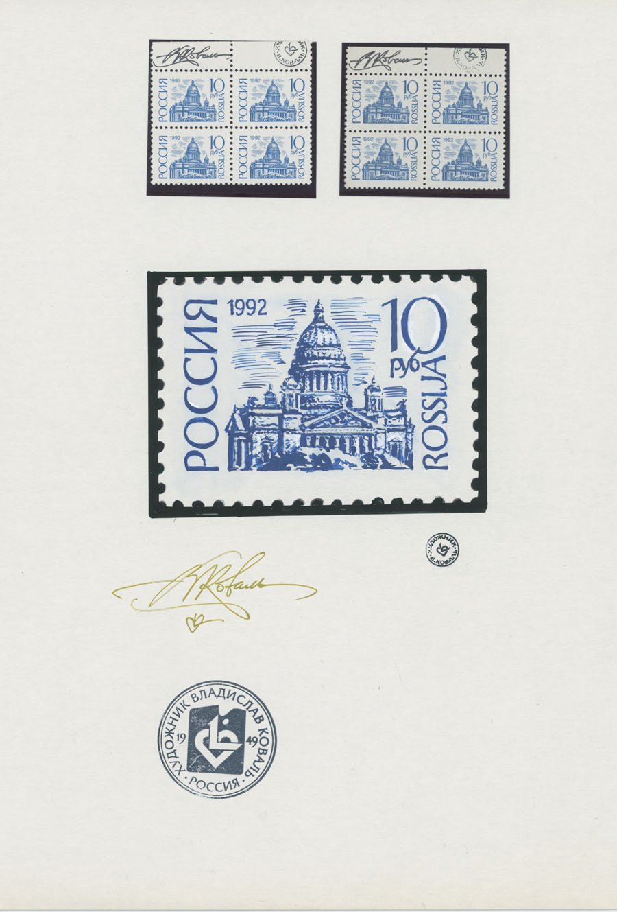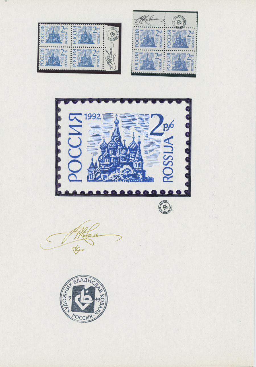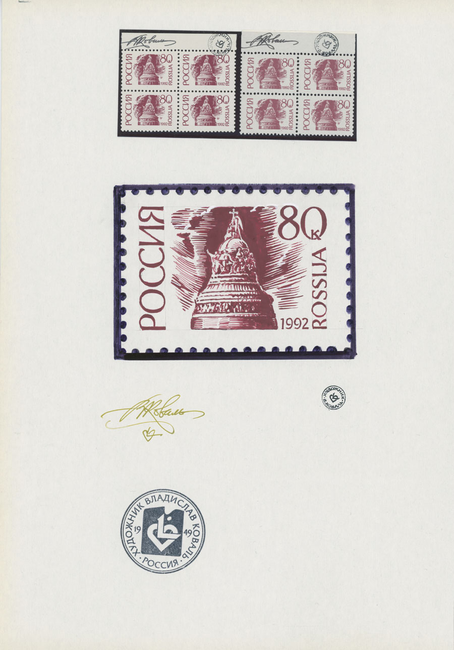 ORIGINAL ESSAYS OF THE FIRST RUSSIAN FEDERATION DEFINITIVE ISSUE BY ARTIST VLADISLAV KOVAL: 1992-95, 10k-100r, complete set of 17 water-color essays, approximate size 110x80mm, neatly arranged on exhibition style pages along with issued stamps in blocks of four (two of each denomination), each page is bearing artist’s signature and facsimile, as well as two pages with artist’s projects of Russian Federation Definitive issue of 2018 (15 and 11 different values on each page), unique material in excellent condition, Est. $6,000-$7,000, Scott #6060-71A