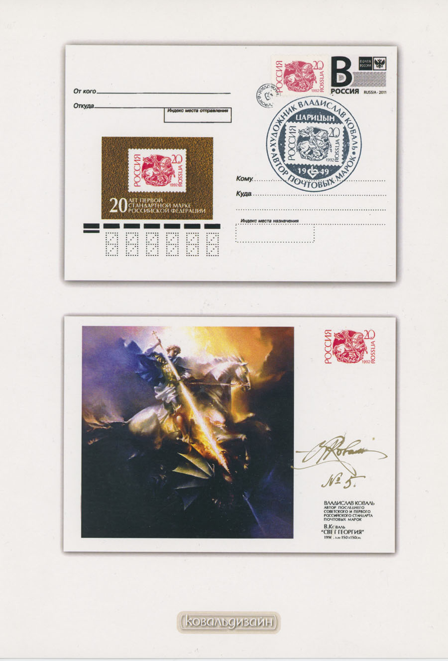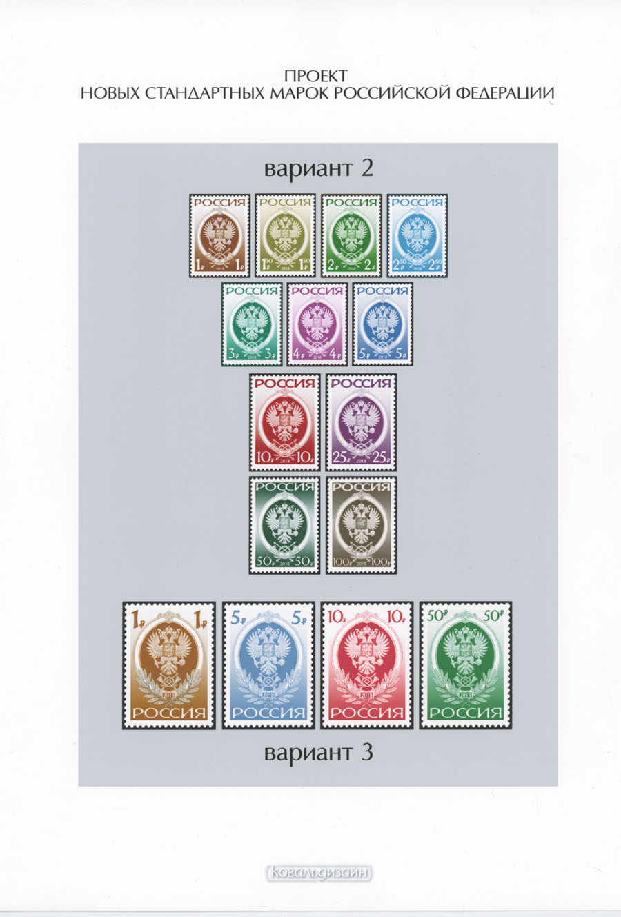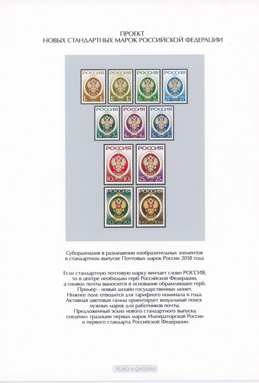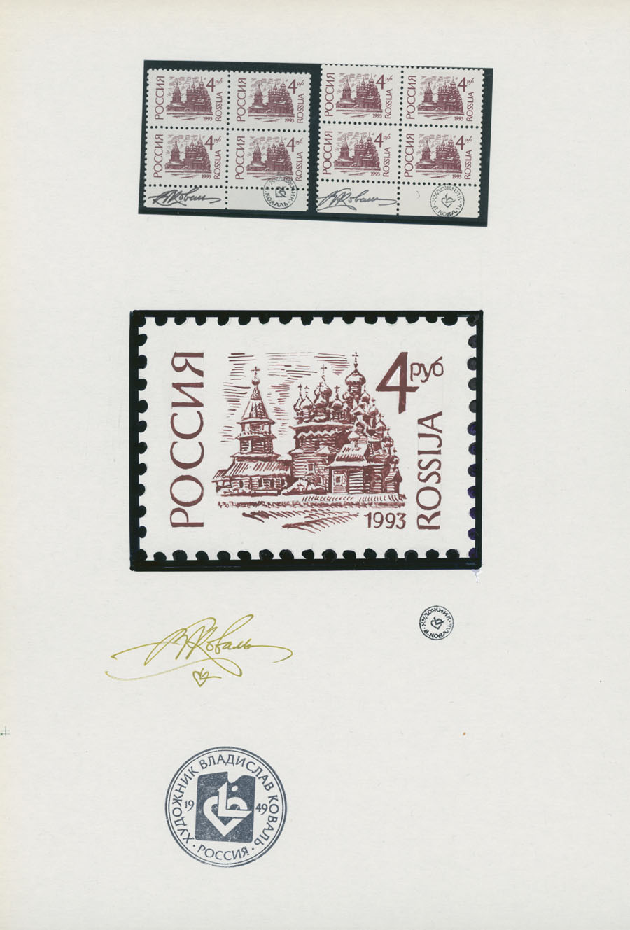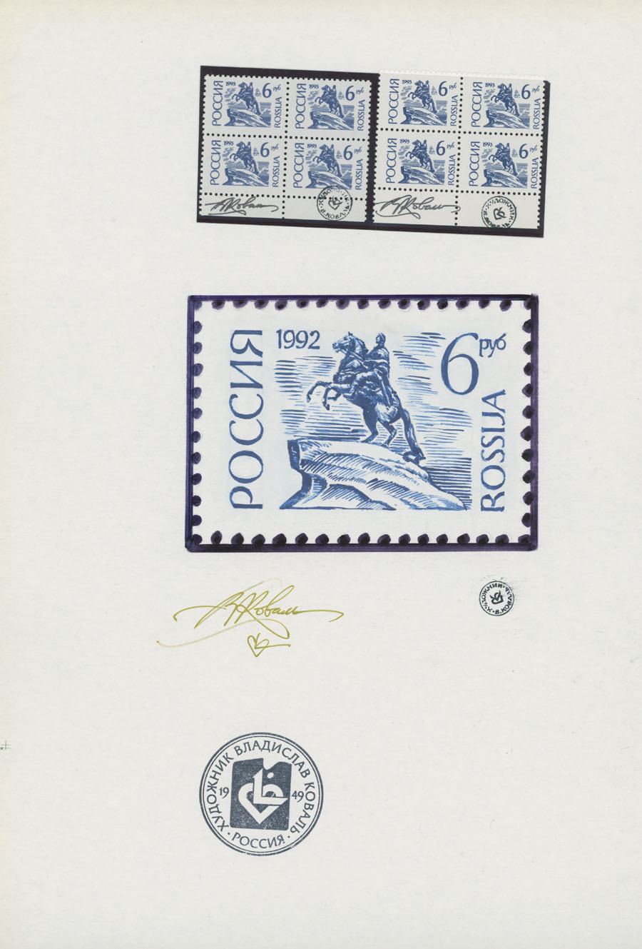 ORIGINAL ESSAYS OF THE FIRST RUSSIAN FEDERATION DEFINITIVE ISSUE BY ARTIST VLADISLAV KOVAL: 1992-95, 10k-100r, complete set of 17 water-color essays, approximate size 110x80mm, neatly arranged on exhibition style pages along with issued stamps in blocks of four (two of each denomination), each page is bearing artist’s signature and facsimile, as well as two pages with artist’s projects of Russian Federation Definitive issue of 2018 (15 and 11 different values on each page), unique material in excellent condition, Est. $6,000-$7,000, Scott #6060-71A