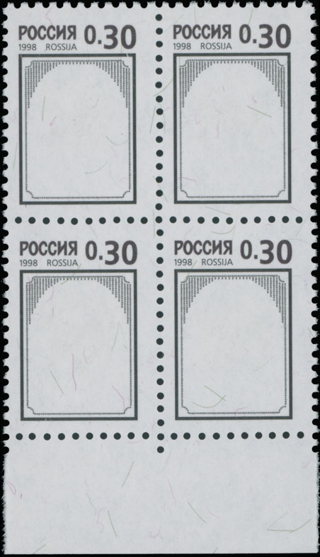 1999, (Ostankino TV Tower), 30k in black only, printed on granite paper with microprint, central design is omitted (dark green color), bottom sheet margin block of four, full OG, NH, VF and scarce multiple, reportedly only two sheets of 100 were discovered, Est. $400-$500, Scott #6553 var