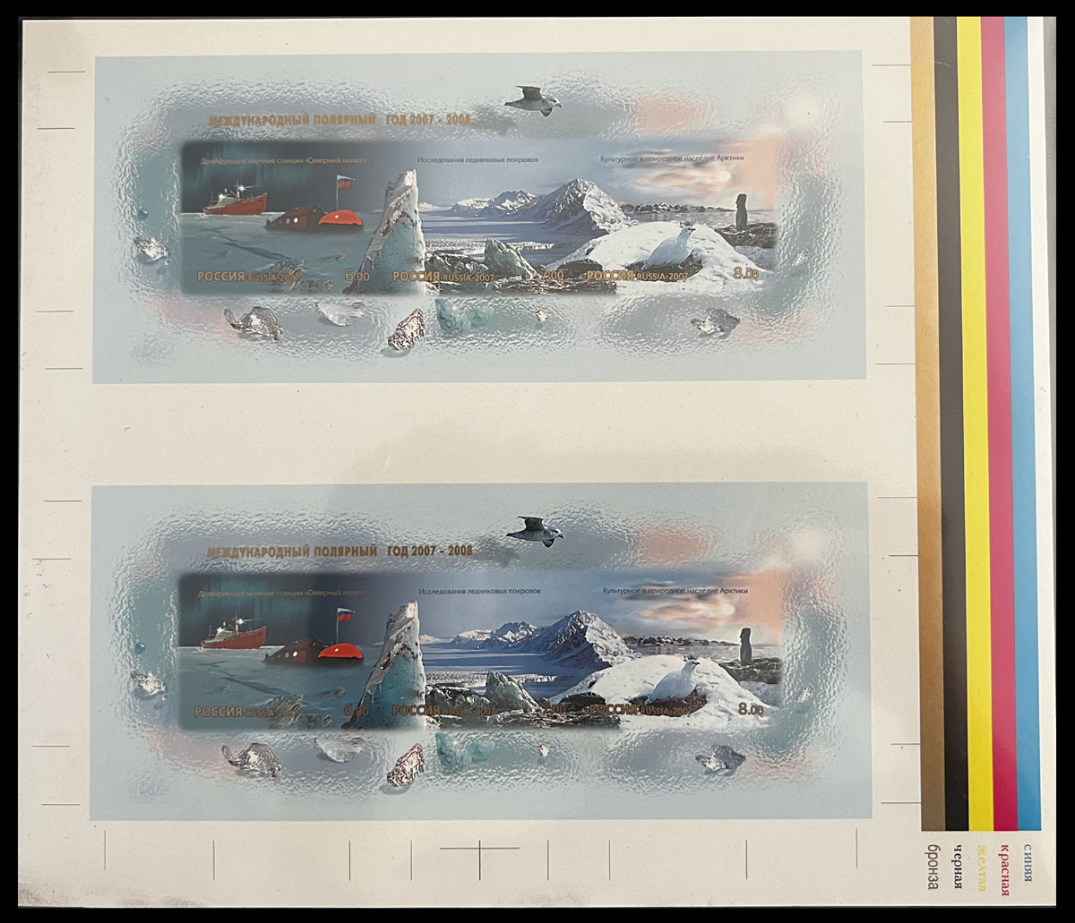 2007, International Polar Year, imperforate Goznak proof of souvenir sheet containing stamps of 6r, 7r and 8r, vertical pair with gutter (21mm) and control colored lines at right, printed on chromaline card, no gum as produced, VF and very rare, Est. $800-$1,000, Scott #7021