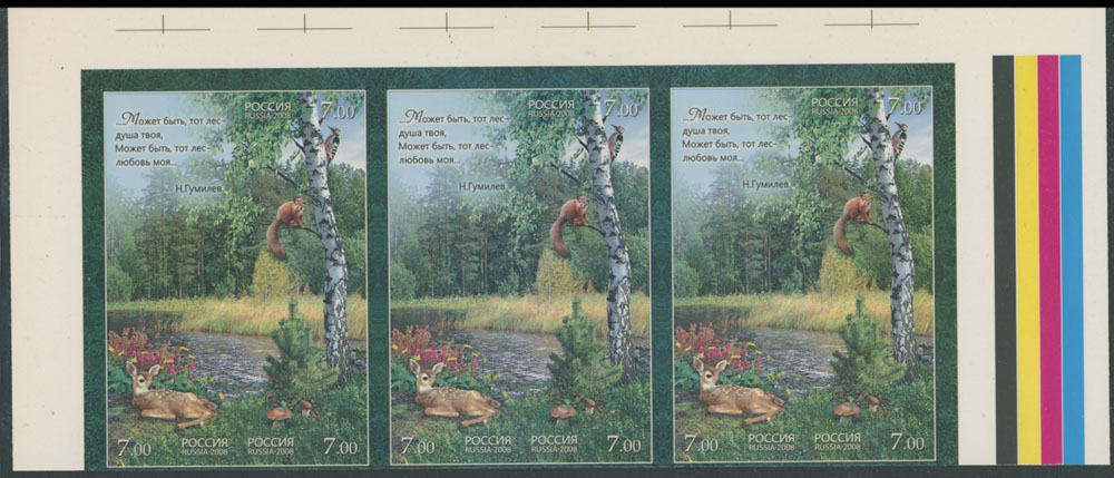 2009, Flora and Fauna, three side margin horizontal unsevered strip of 3 imperforate proofs of miniature sheet of 7r+7r+7r with label, printed on chromaline card, control lines on right selvage, fresh, VF and very rare, Est. $400-$500 , Scott #7098